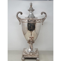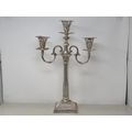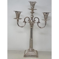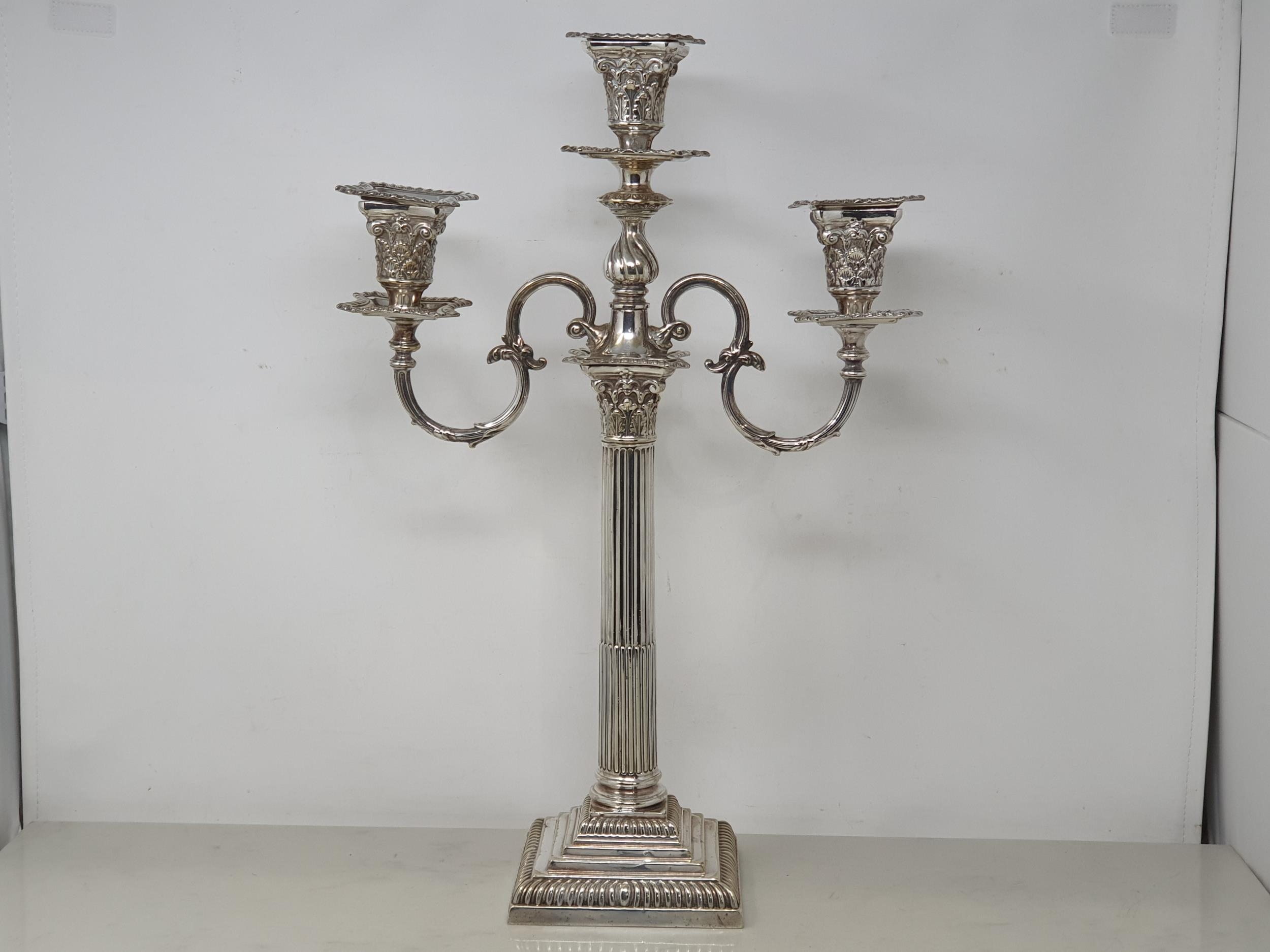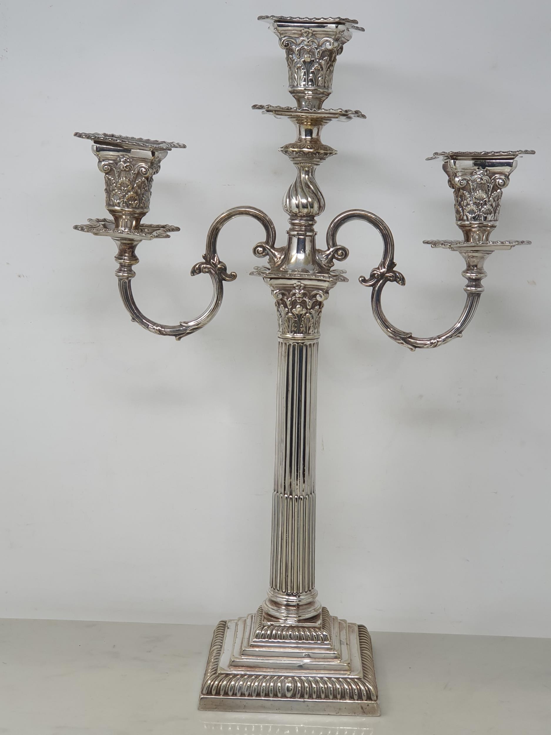 A plated two branch Candelabra with leafage sconces, fluted column on stepped square base with gadroon friezes, 19in