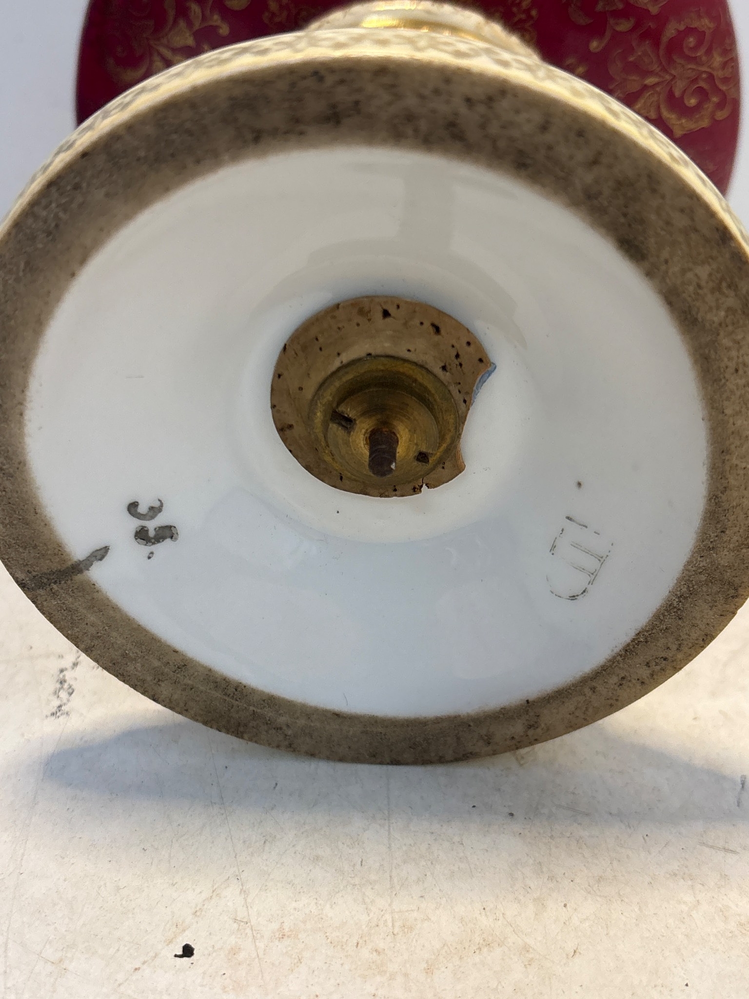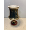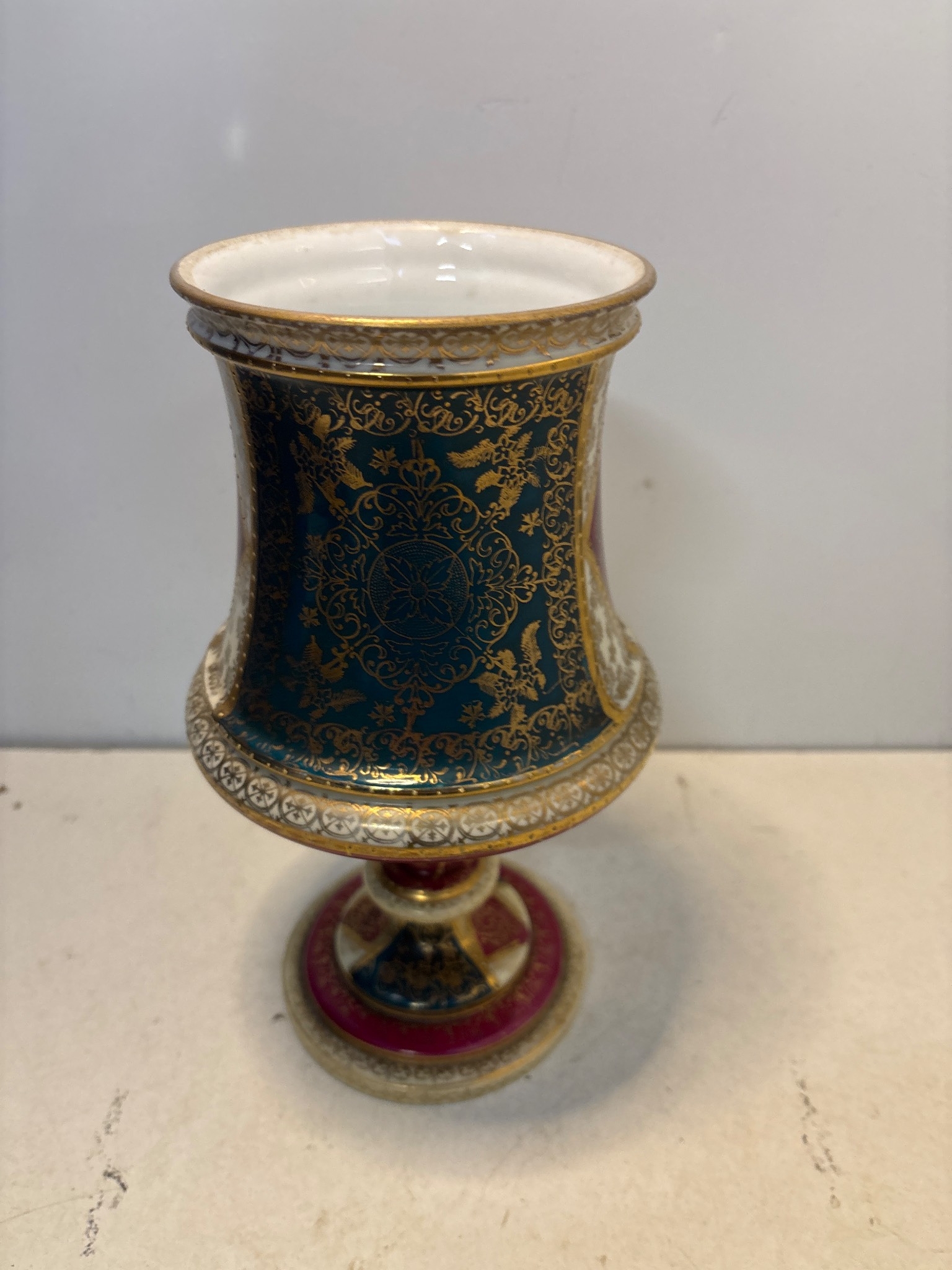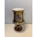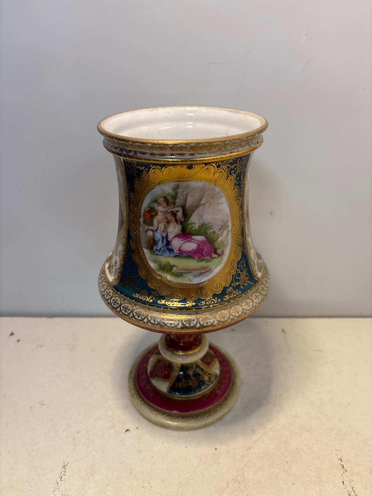 Hand-painted porcelain goblet with intricate gold accents, floral and figurative designs, and a marked base featuring a decorative pedestal.