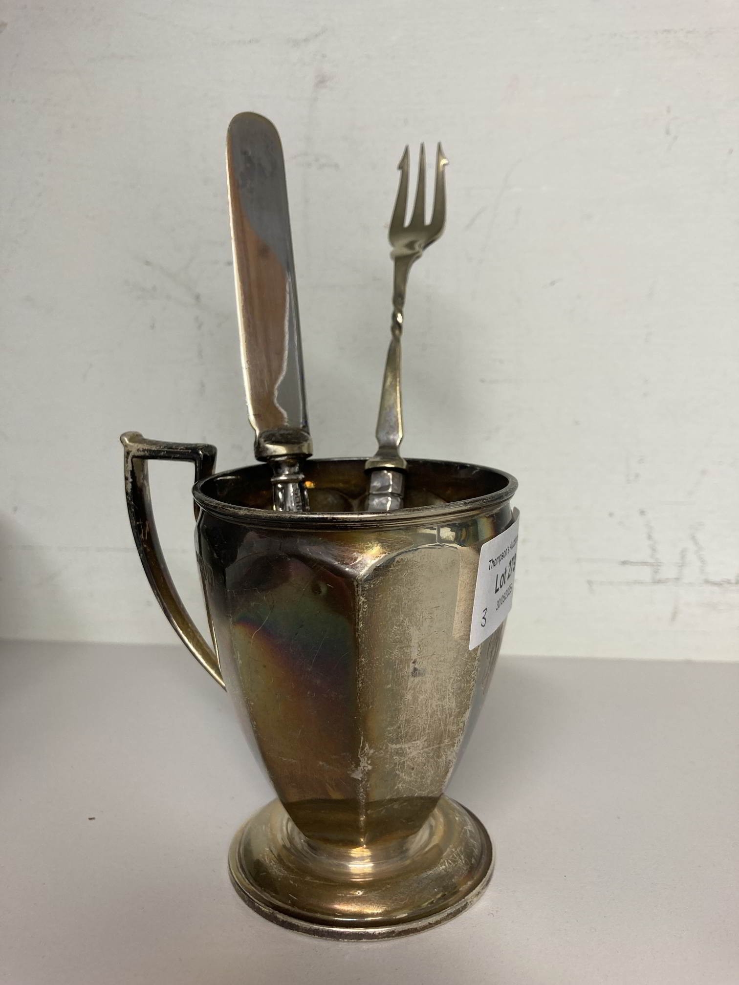 Silver Harrison Brothers & Howson, London 1910 cup 145g & silver handled knife & pickle fork