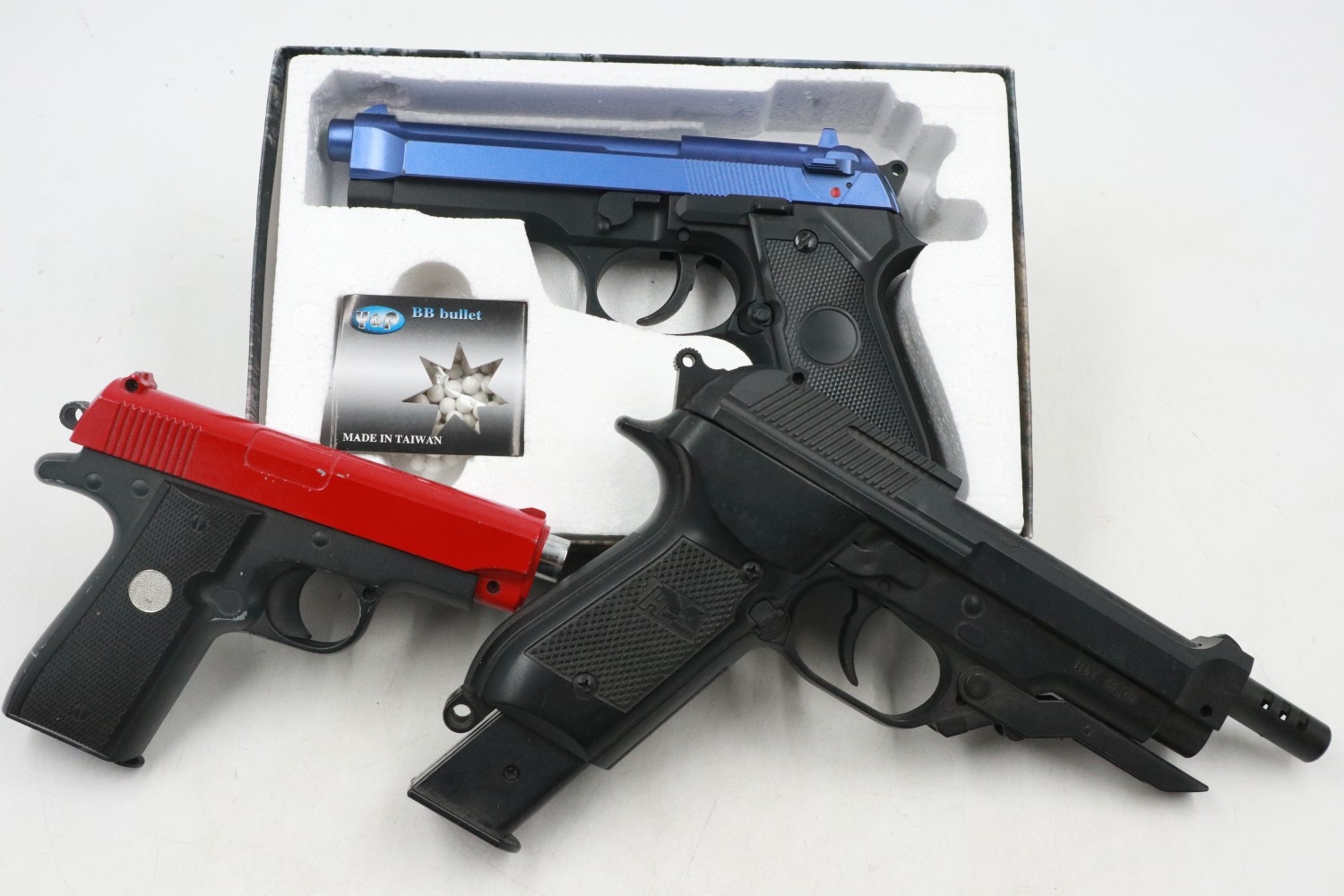 Beretta M93R BB firing pistol with quick release extended clip with CO2 powered mechanical pistol, boxed, with a further mechanical pistol. Not available for in-house P&P