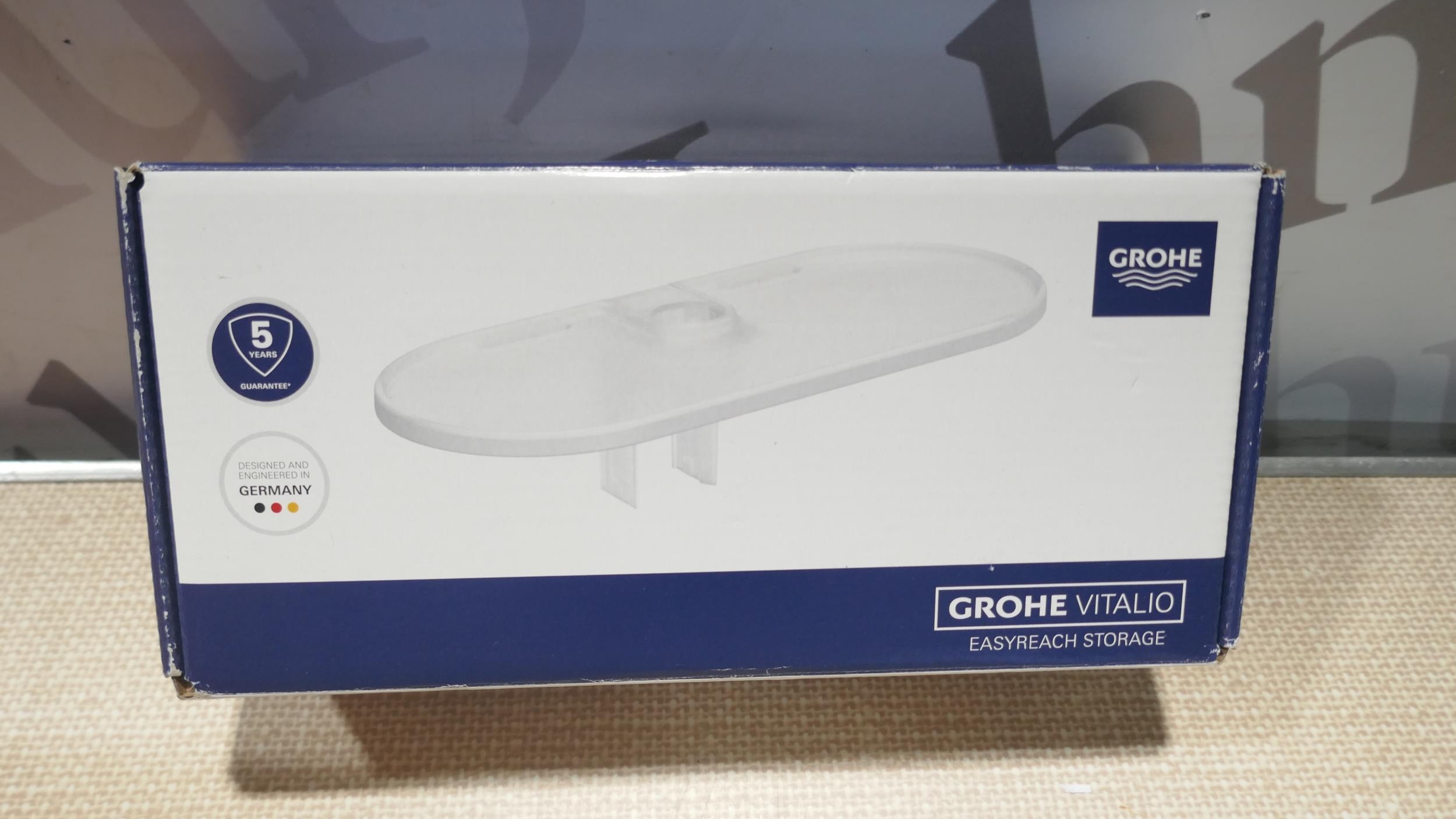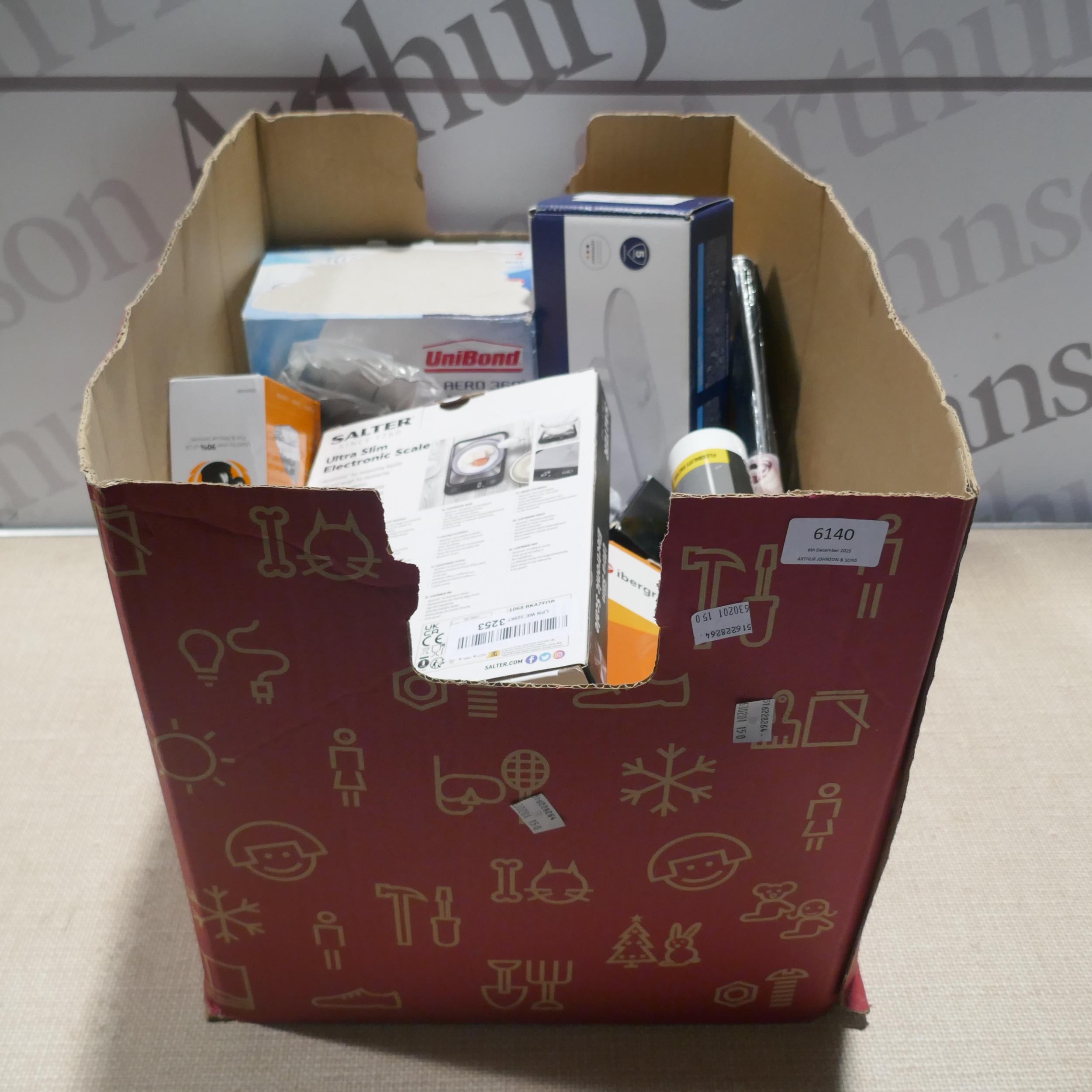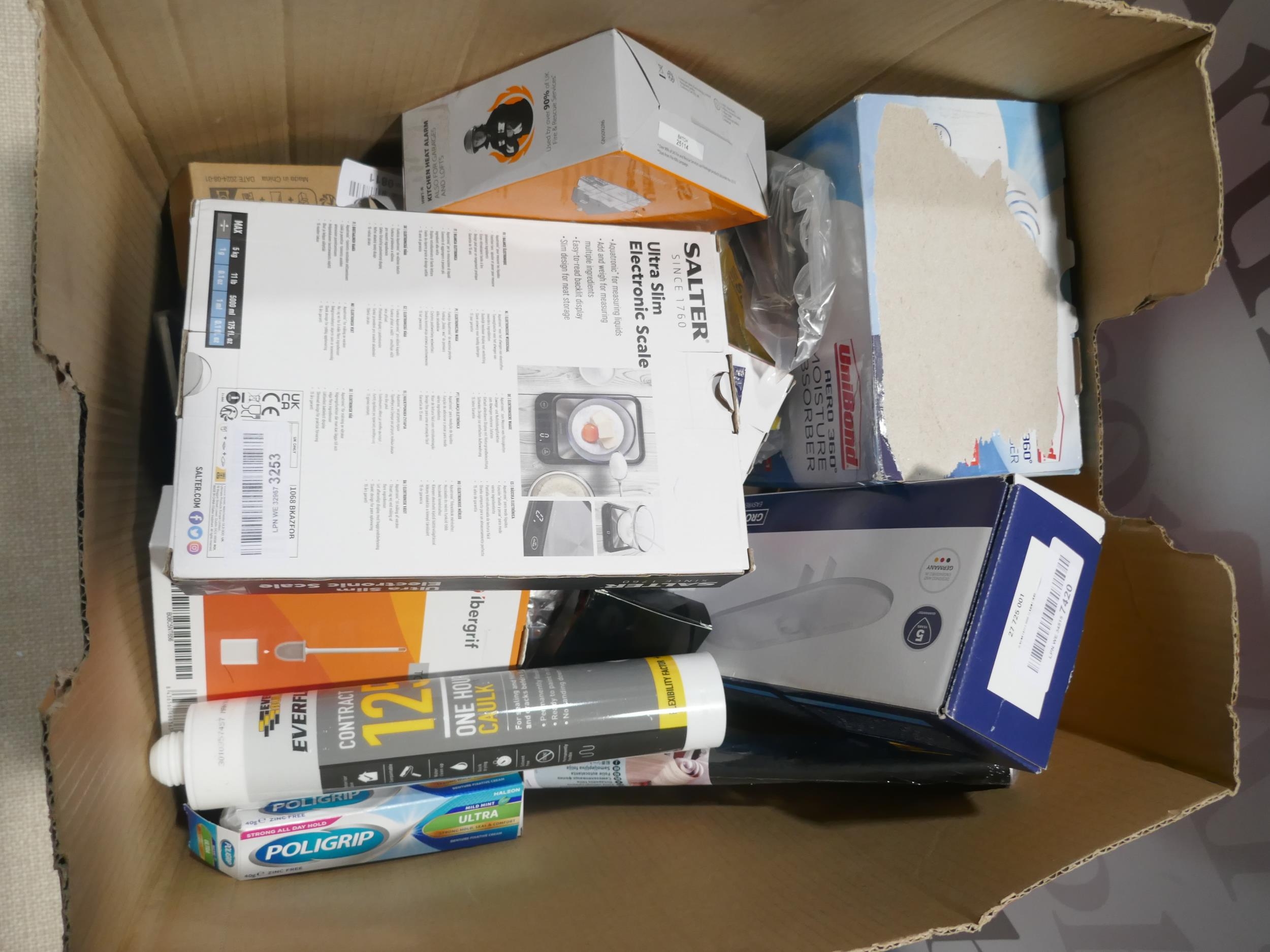A box of miscellaneous household items to include moisture absorber, Grohe easy reach storage, Salter weighing scales, etc. * This lot is subject to VAT