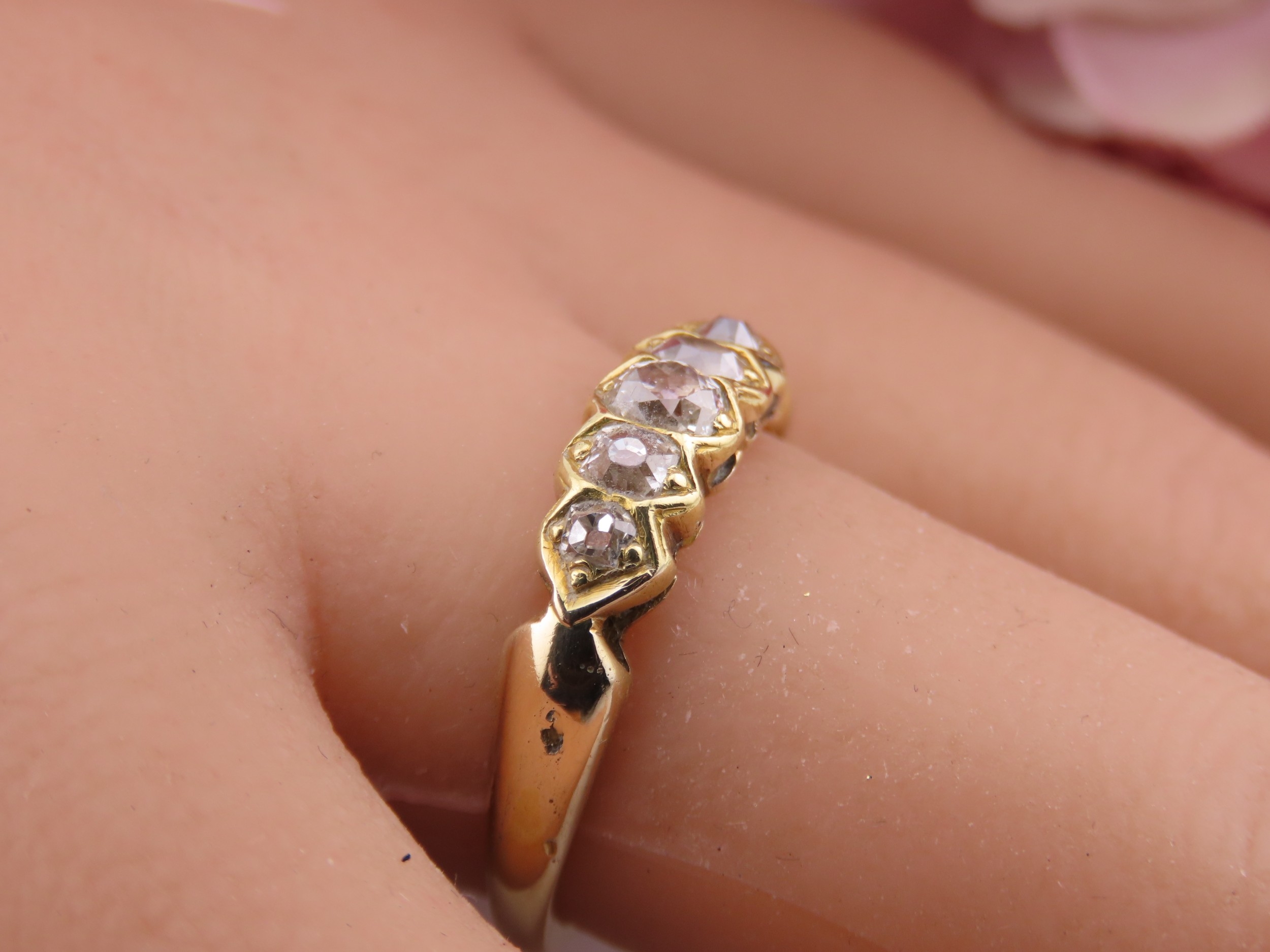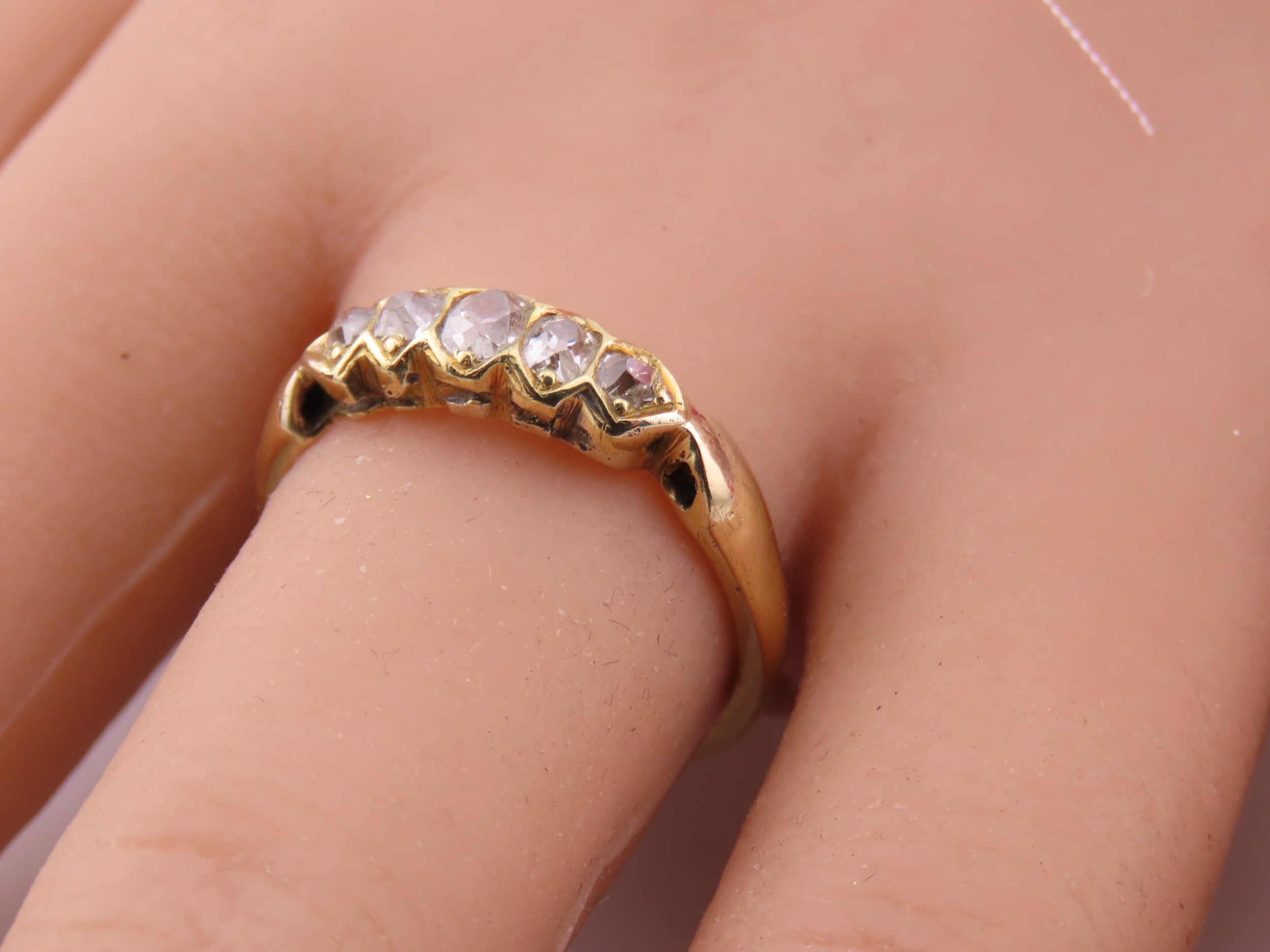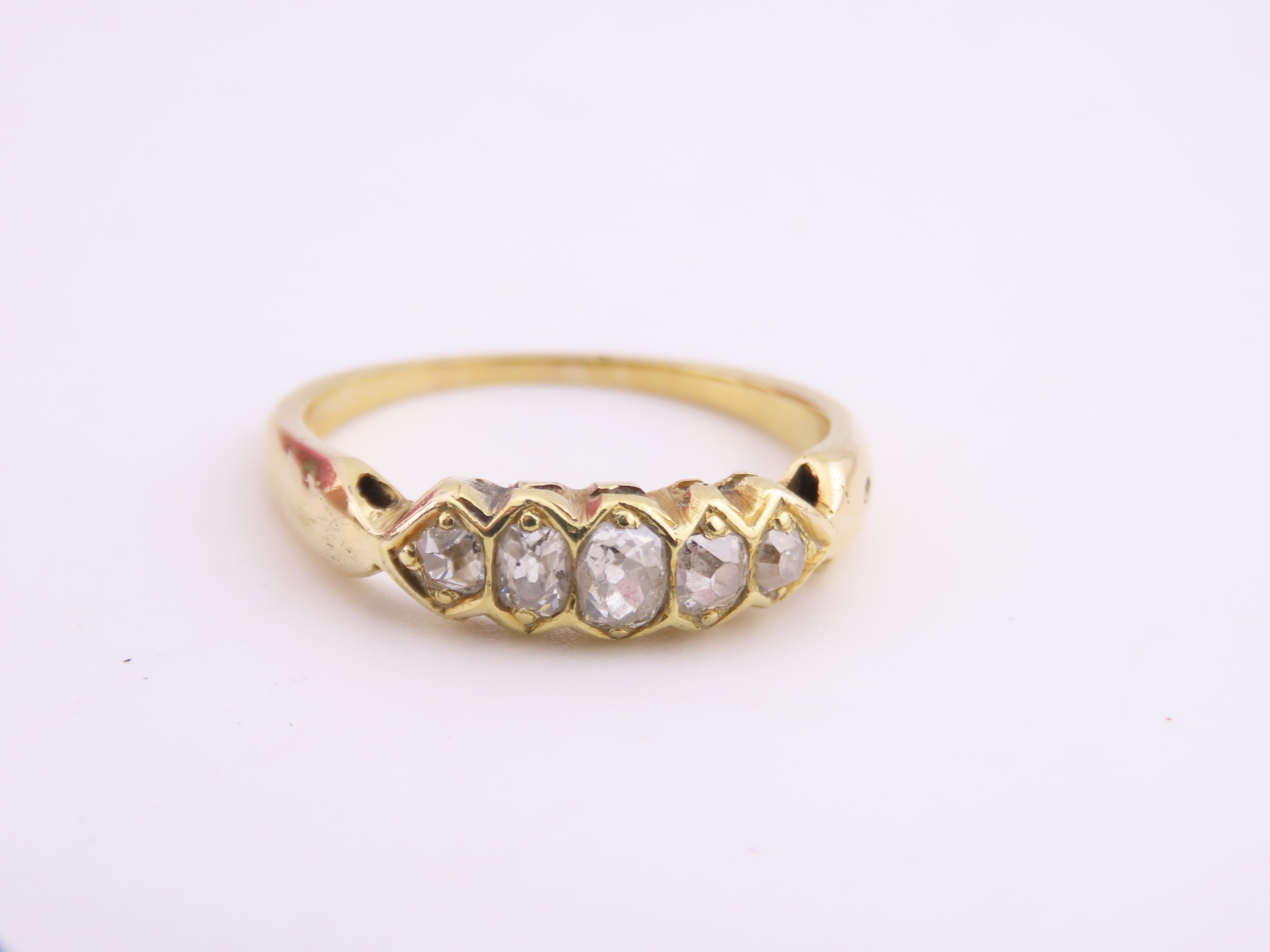 18ct Gold Antique Diamond Ring. Set with a row of cushion cut diamonds with an estimated combined weight of approximately 0.50 carats mounted in a carved yellow gold band. Ring size P.5. Gross weight 3.3 grams.