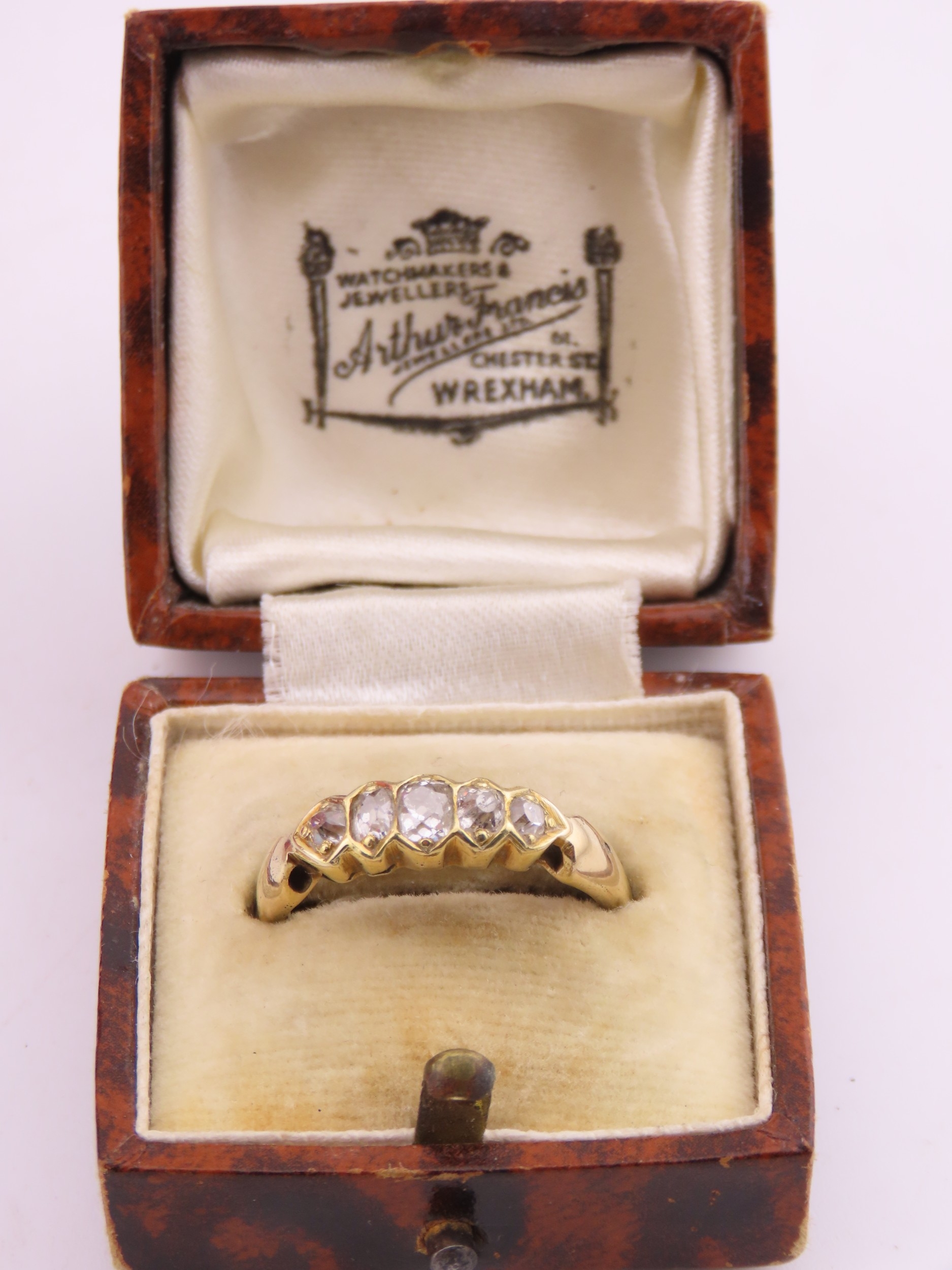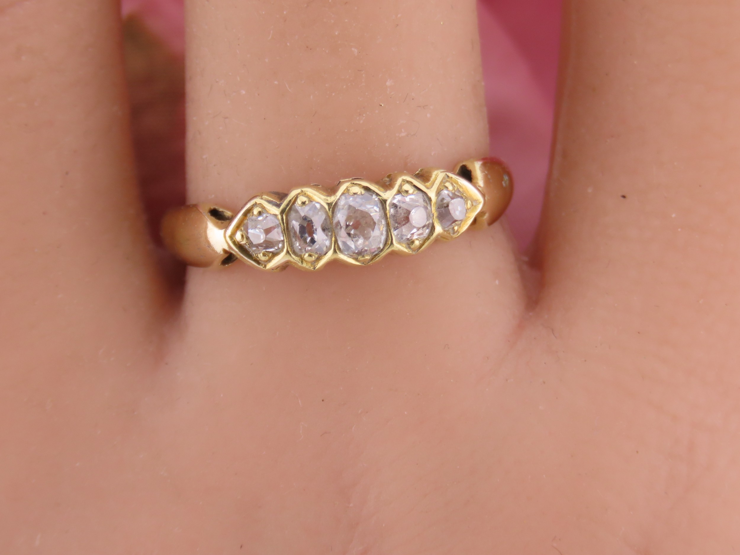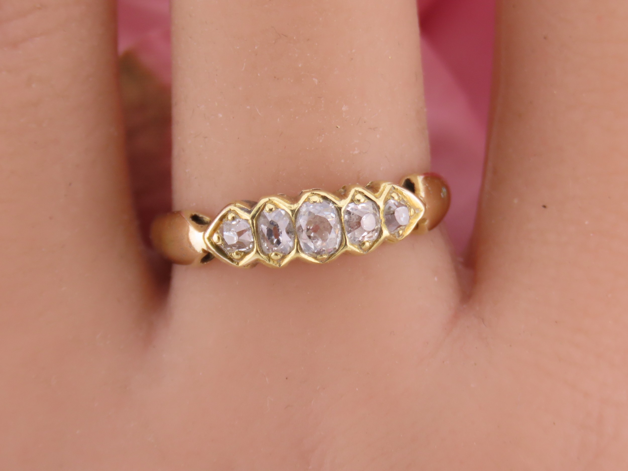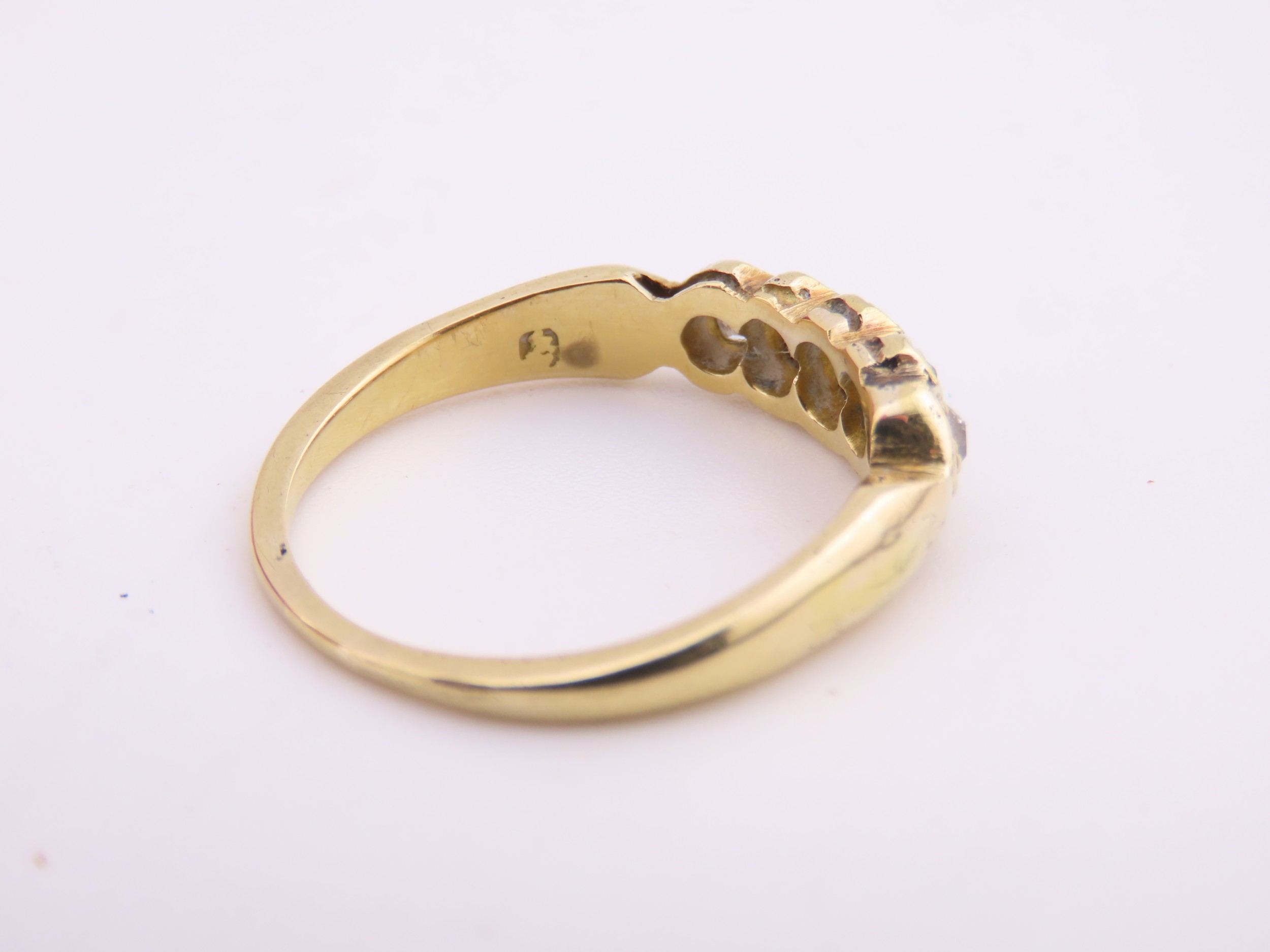 18ct Gold Antique Diamond Ring. Set with a row of cushion cut diamonds with an estimated combined weight of approximately 0.50 carats mounted in a carved yellow gold band. Ring size P.5. Gross weight 3.3 grams.