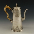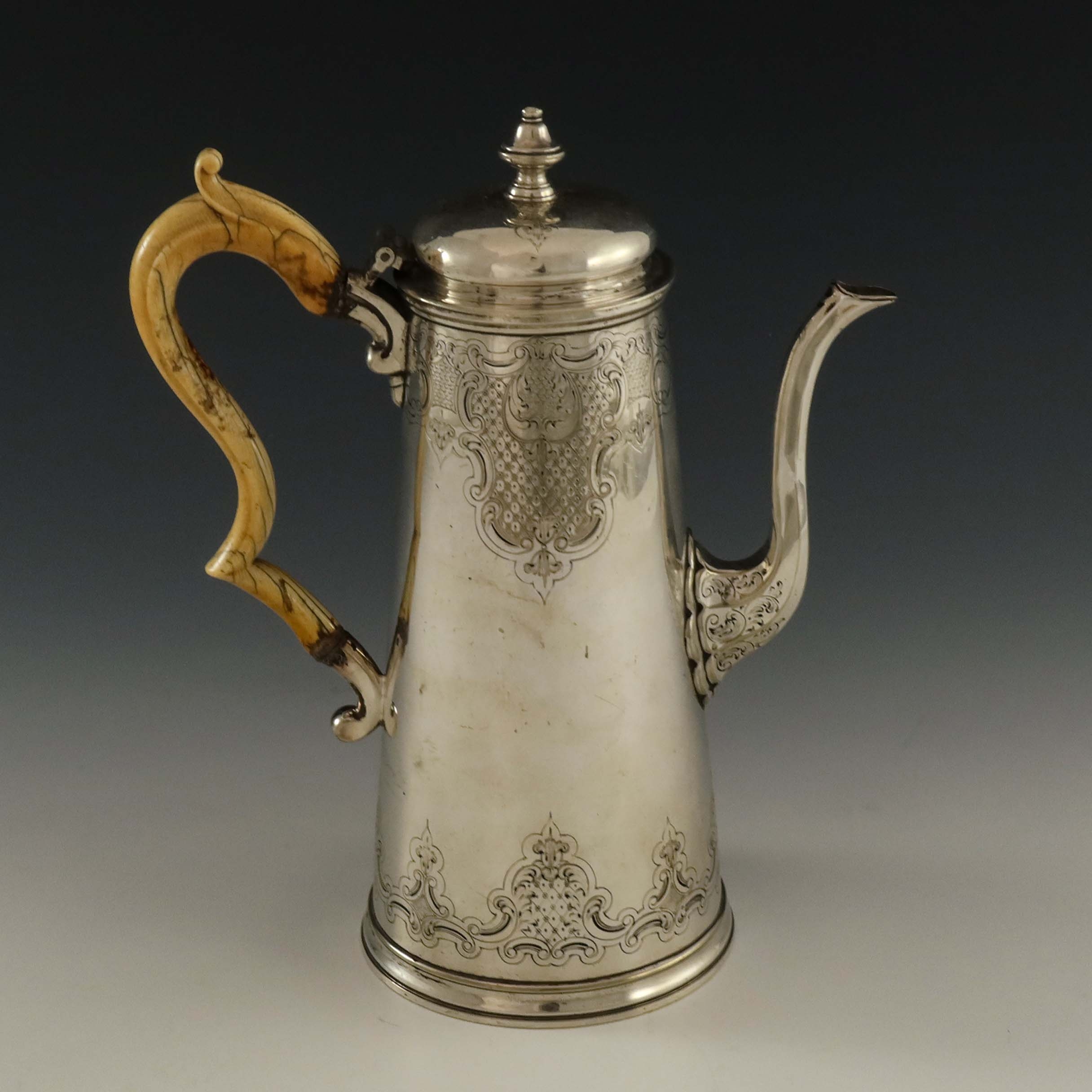 A Victorian silver plated coffee pot, Elkington and Co., 1861, in the Queen Anne style, conical form with ivory ear handle, engraved Rococo scroll borders, 25.5cm high