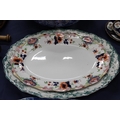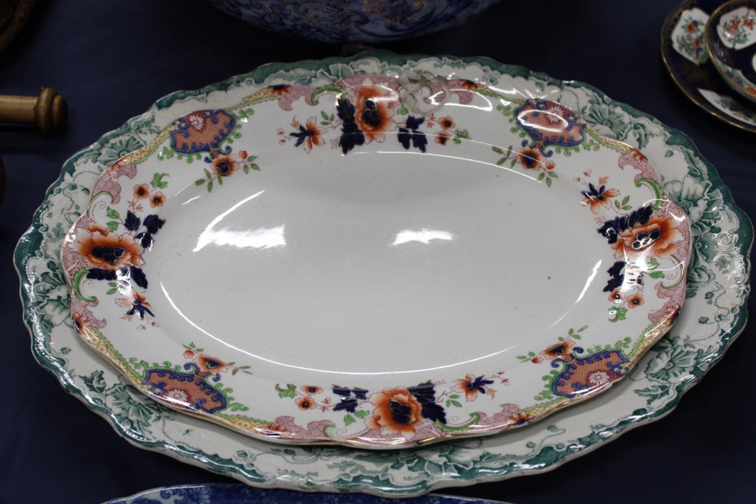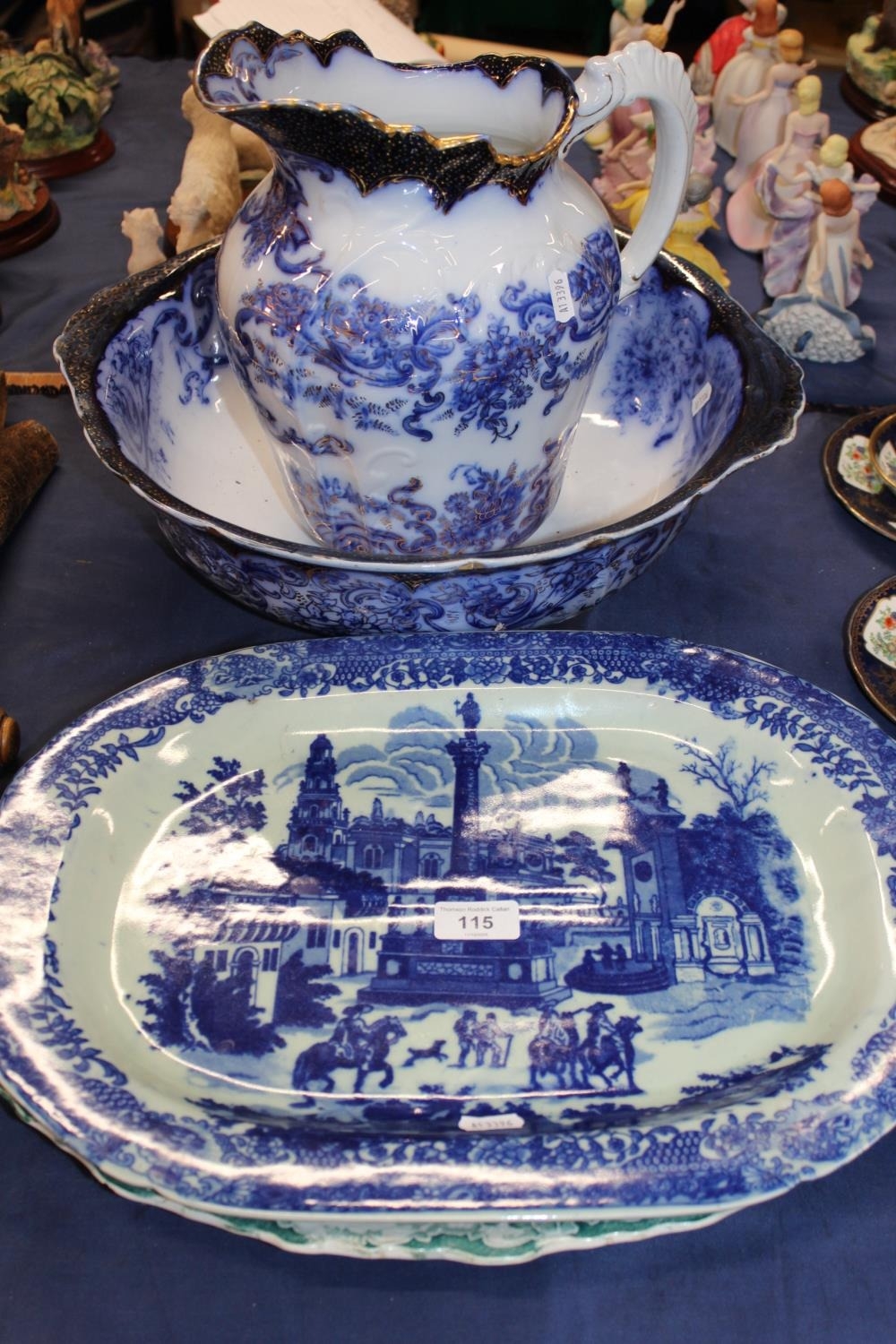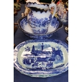 Victorian style ewer and basin, a blue and white ashet and another.