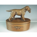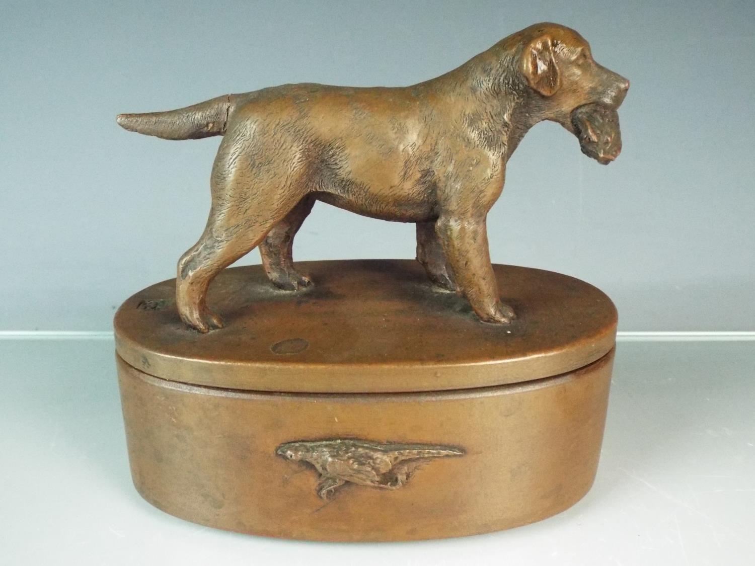 Resin, Bronze effect pil box with retriever to lid. Repair to tail. 5 inches long.