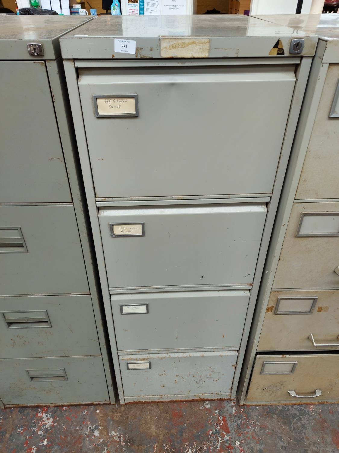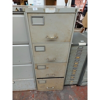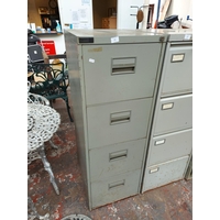 A four drawer metal office filing cabinet