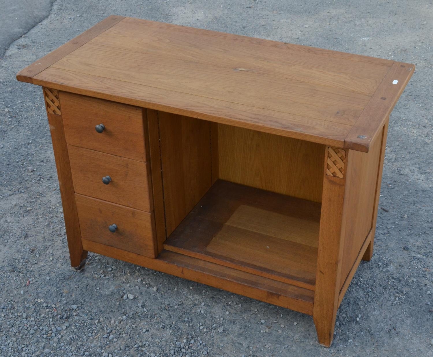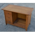 Contemporary oak dressing table with three drawers and a single overhang shelf on square supports. W101cm D50cm H71cm