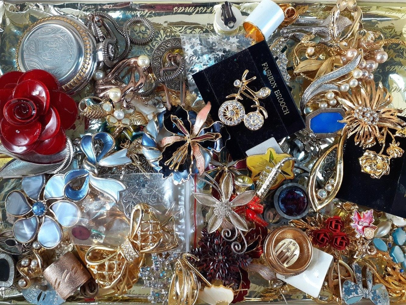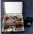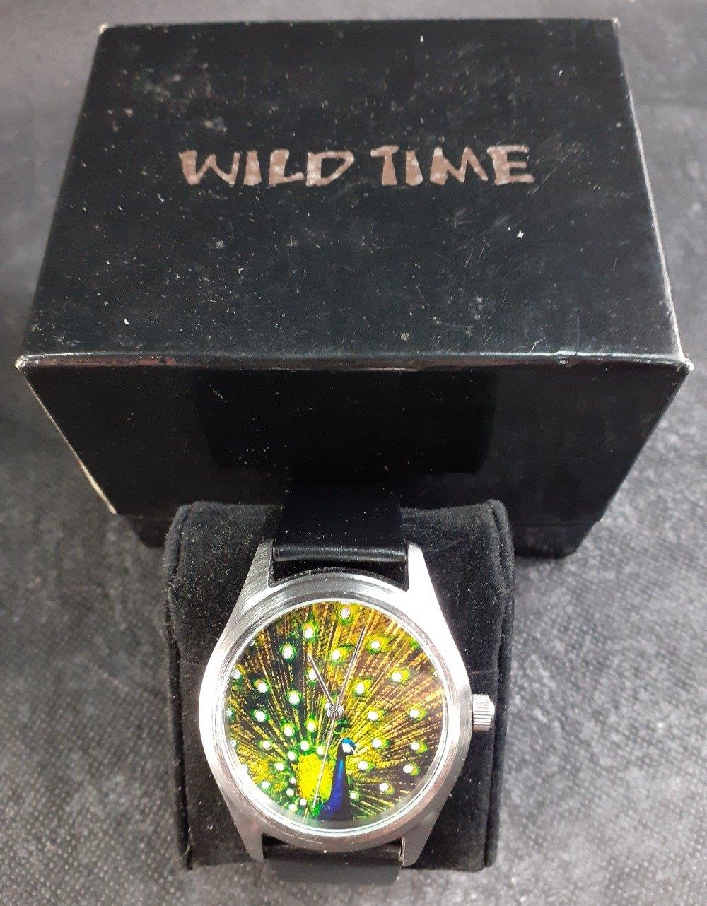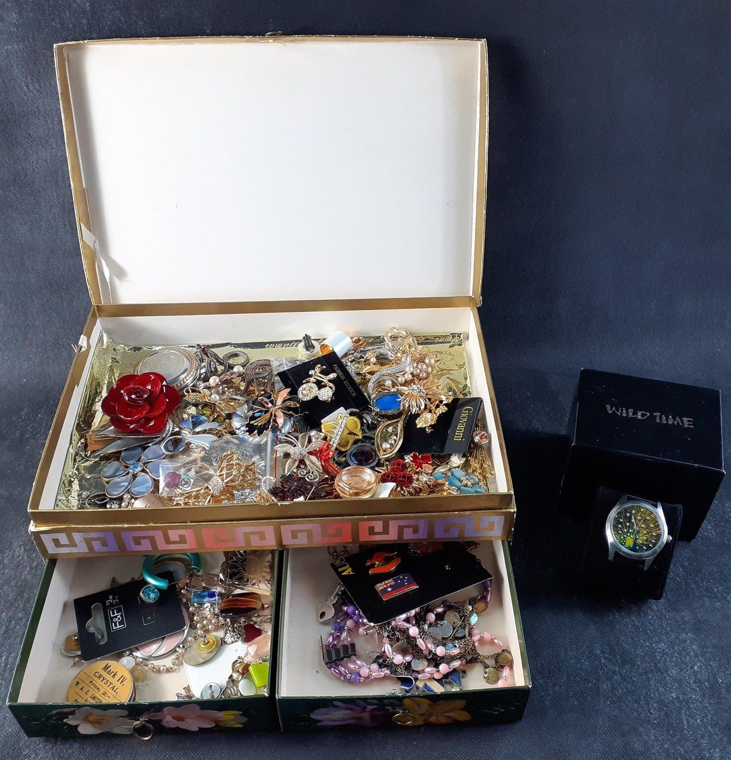 A boxed collection of costume jewellery to include many enamelled brooches, a ROJAS pocket watch, and a boxed WILD TIME watch (02481) with peacock face and clear stones