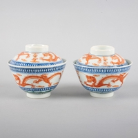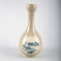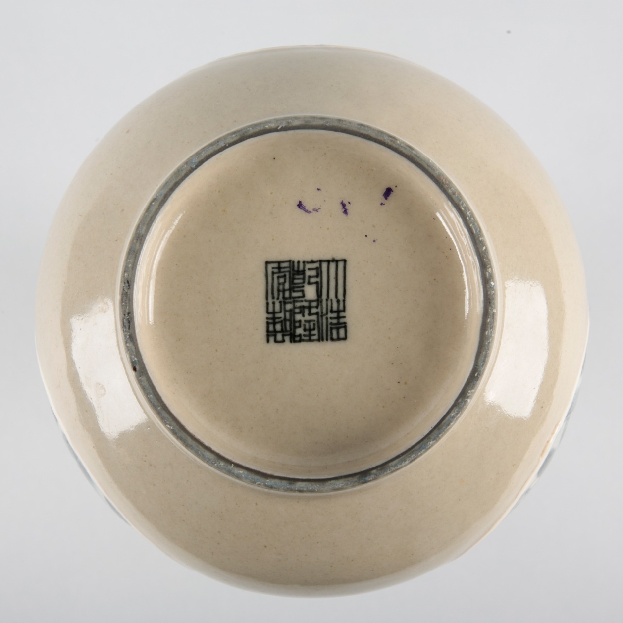 bearing a six character Qianlong seal mark to the base, 20th century, with moulded rim and pierced foot, 9.5cm high x 22cm diameter; together with a Chinese porcelain grey-painted bottle vase, similarly bearing a six character Qianlong seal mark to the base, 20th century, with petal form rim and decorated with blue and white landscape panels, 28cm high (2)