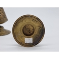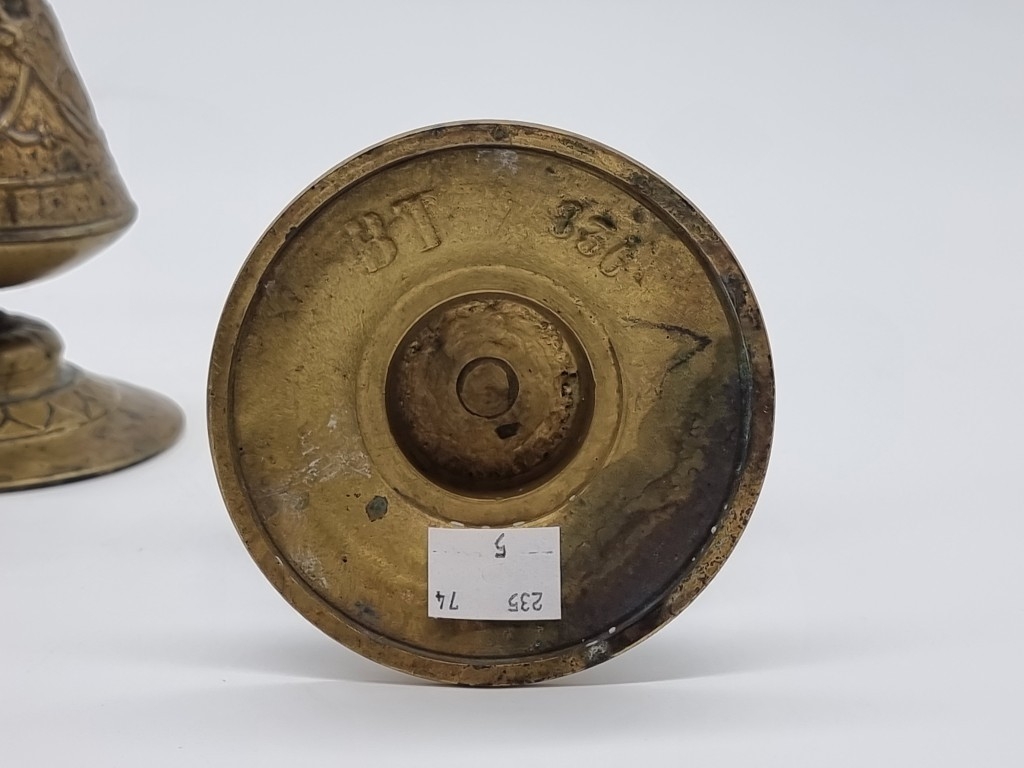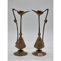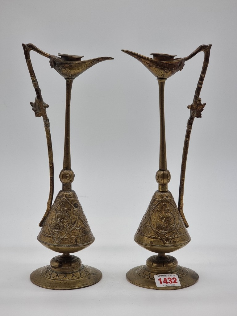 A pair of Aesthetic brass ewer form candlesticks, the bases moulded 'BT 836', 30.5cm high.