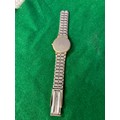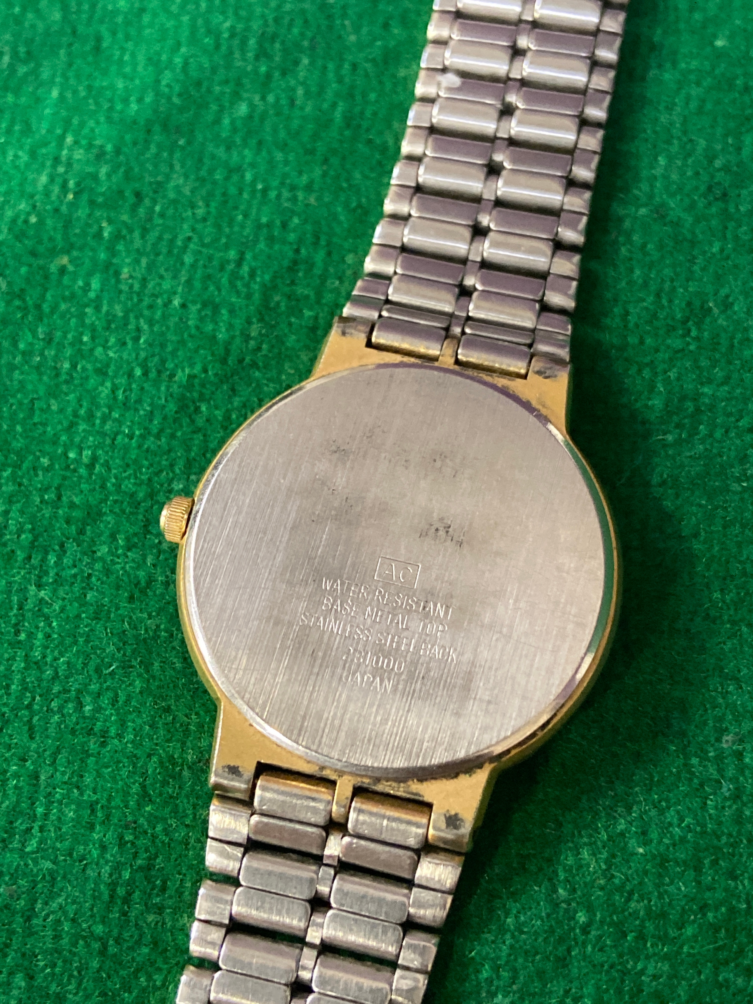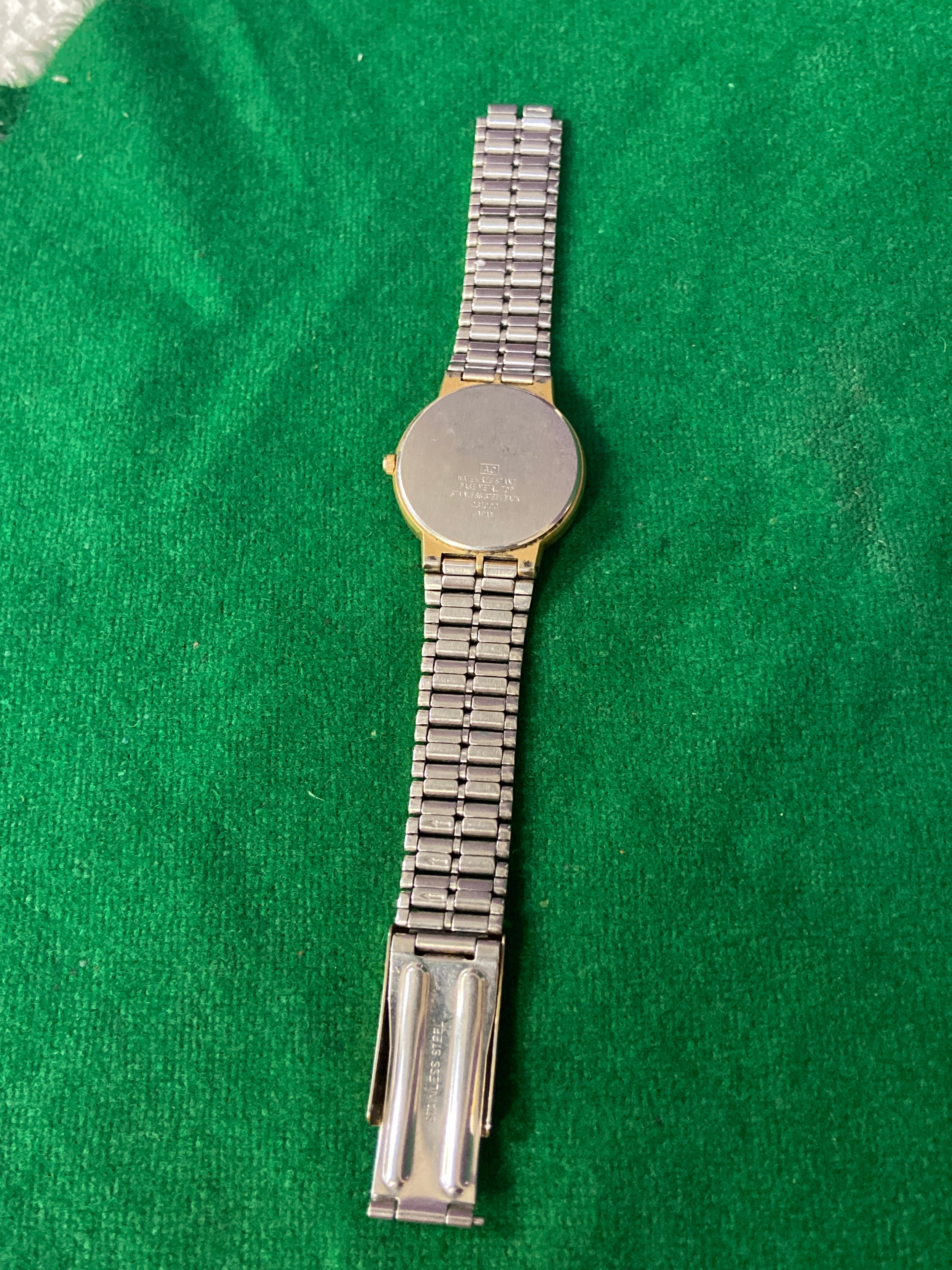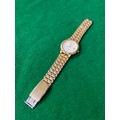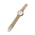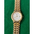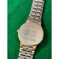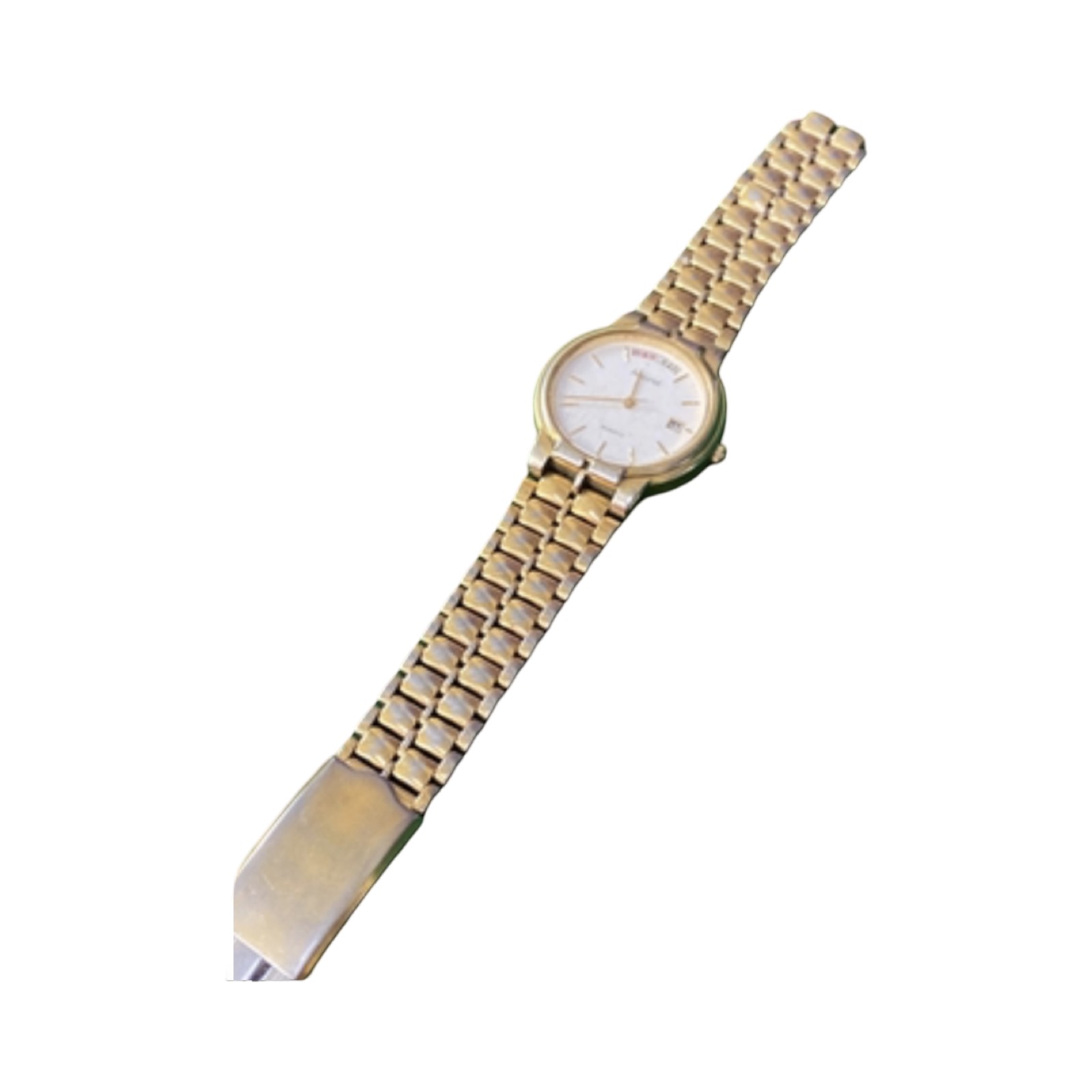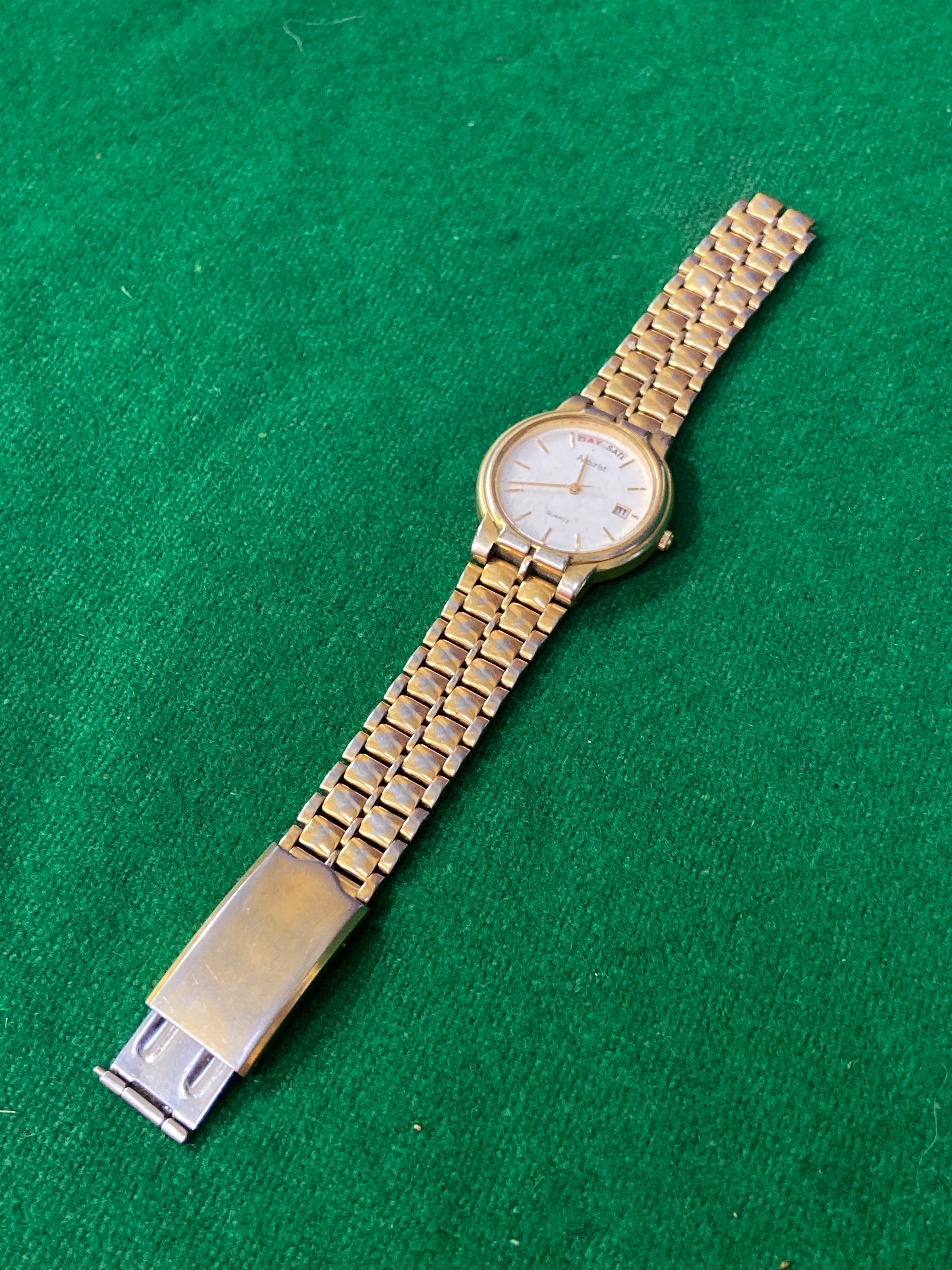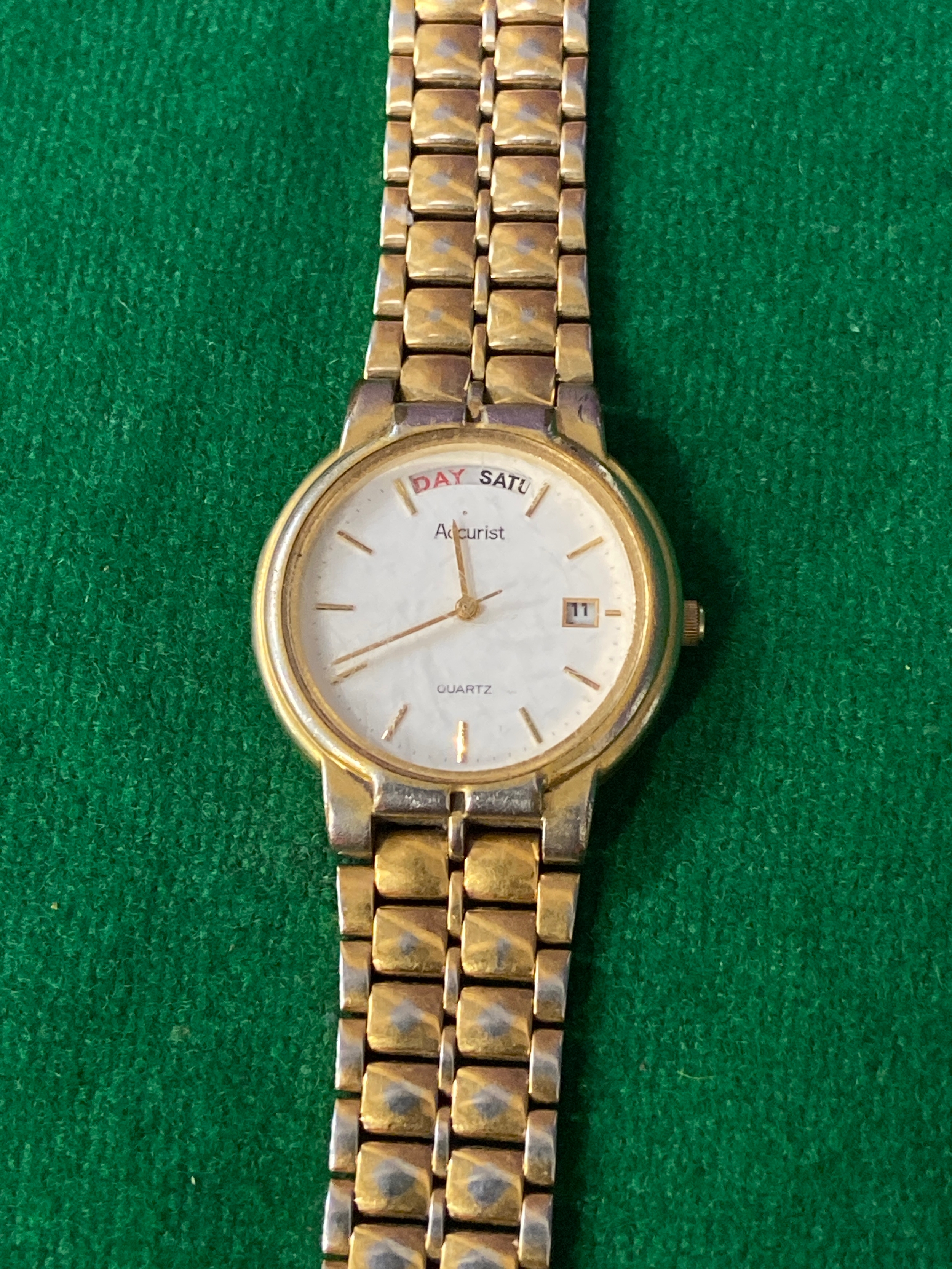 Vintage Accurist quartz day-date wristwatch, with white dial and gold tone stainless steel strap. One side of strap clasp needs reattaching.