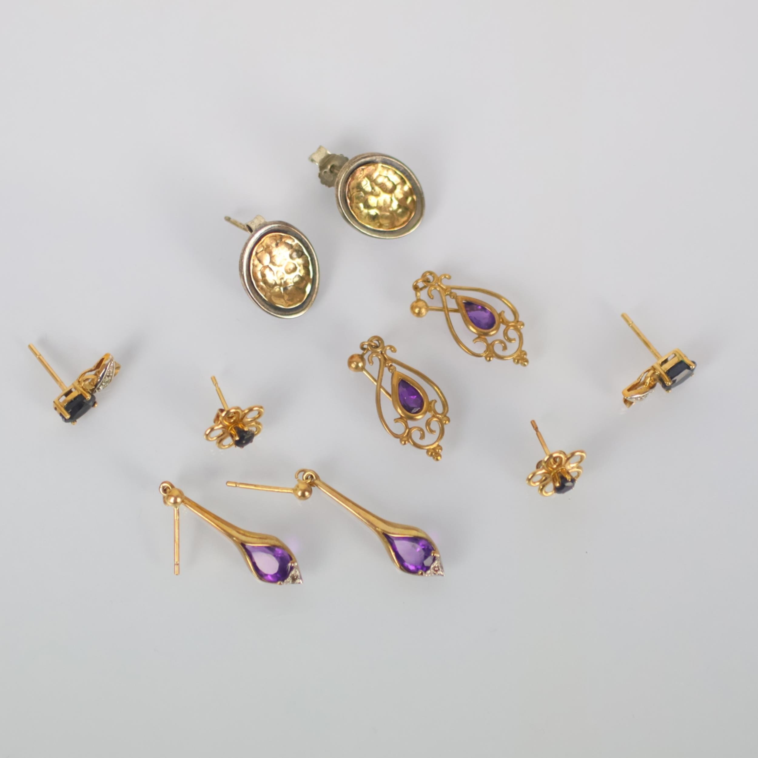 A selection of earrings, including a pair of amethyst examples, of drop form with openwork detail, 2.5cm long, a pair of hammered white and yellow metal studs, and further pairs, gross weight of marked earrings 3gms (qty) (at fault)