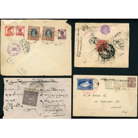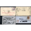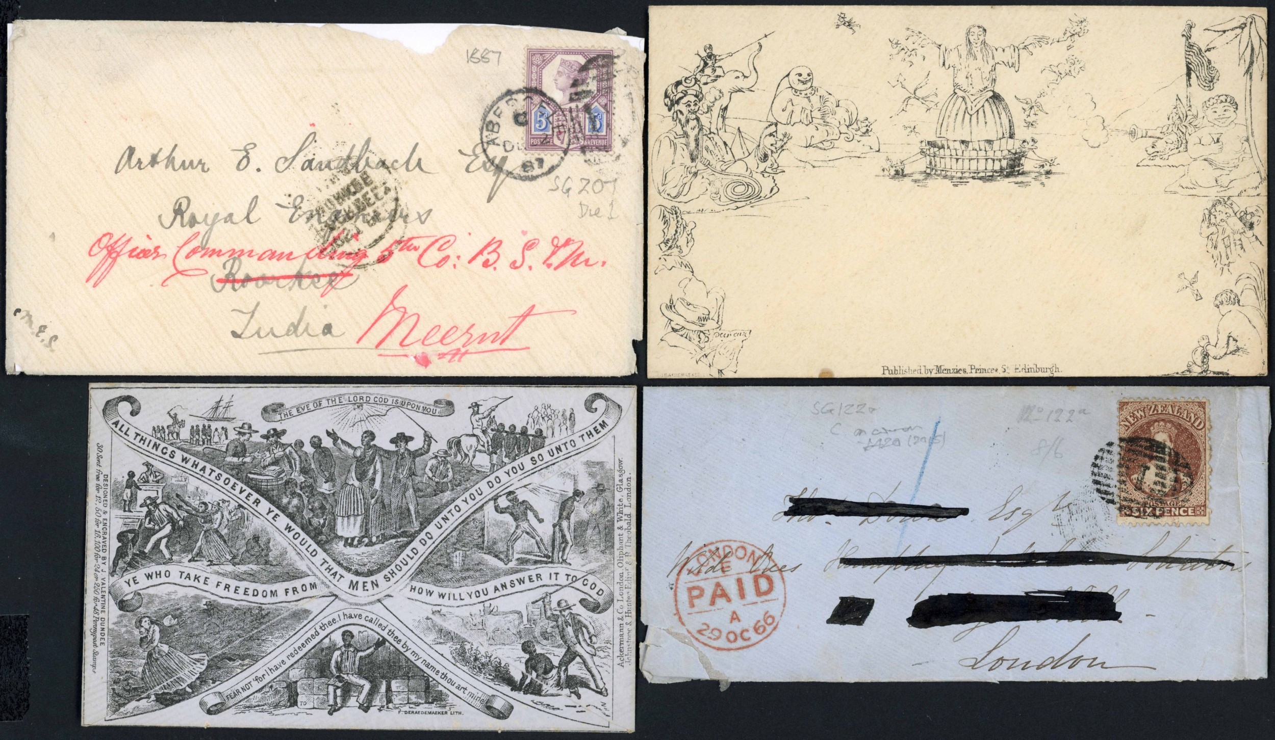 BETTER SINGLE COVERS INC. MULREADY CARICATURES, QV 5d DIE I, NZ CHALON, TIBET TO INDIA, ETC.: Diverse group inc. 'Anti-Slavery' & 'International Trade' Mulready caricatures plus Valentine's Deraedermaker 'American Trade' type on blue paper; Oct. 1866 env. from NZ to London franked with 6d brown Chalon head SG 122a, 1887 env. (roughly opened) from Abergele to India franked with QV jubilee type 5d Die I (SG 207a). Addressed to Arthur E. Sandbach (later Major General) who participated in a host of campaigns from the 1879 Anglo Egyptian War through to the 1916 Easer Rising; 1957 cover with contents from Yatung, Tibet to Kalumpong, West Bengal with Chinese franking being pair of SG 1714 PLA 30th anniv. issue; 29 Apr. 1937 F.A.M. first flight cover HK to San Francisco bearing KGV $2, etc. (15 covers) Cross Reference: MULREADY CARICATURES, ETC.