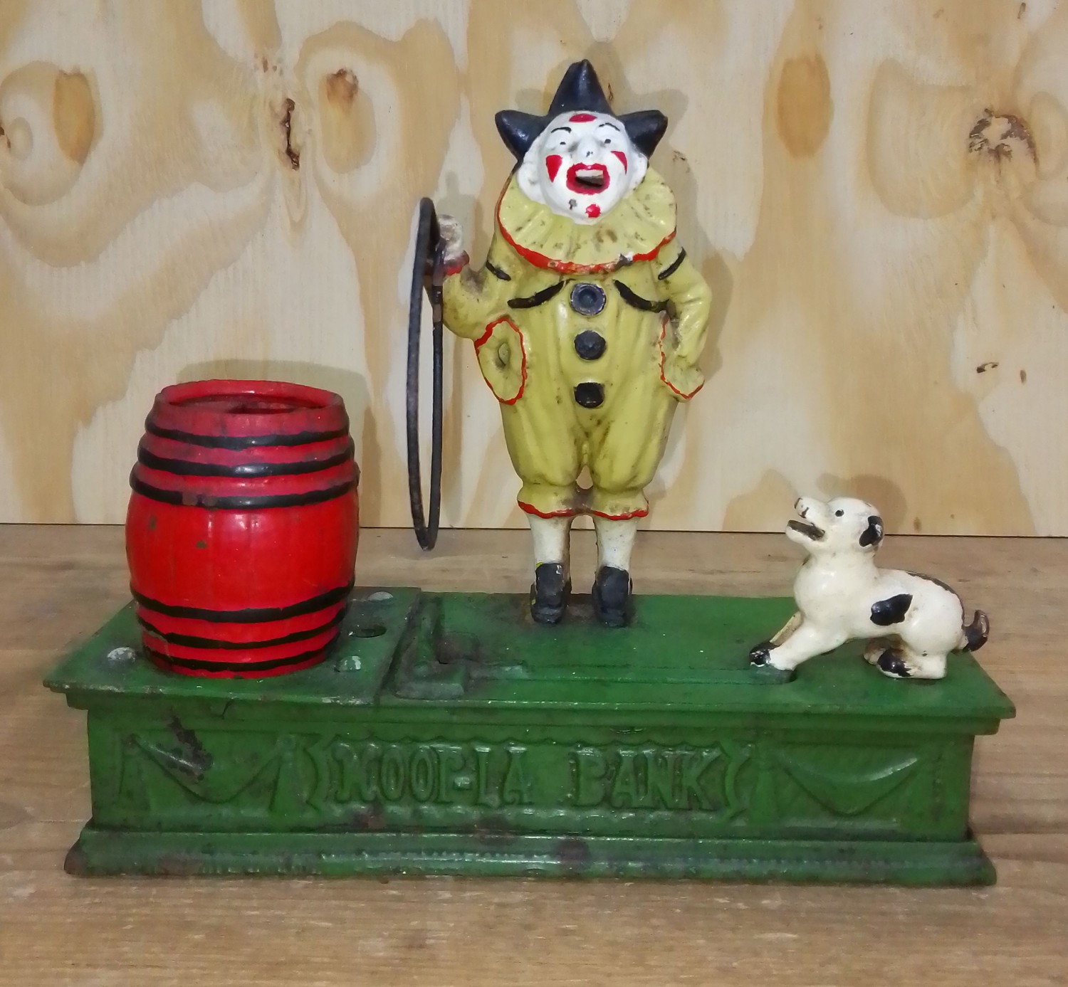 An early 20th century Hoop-La Bank cast metal money bank.