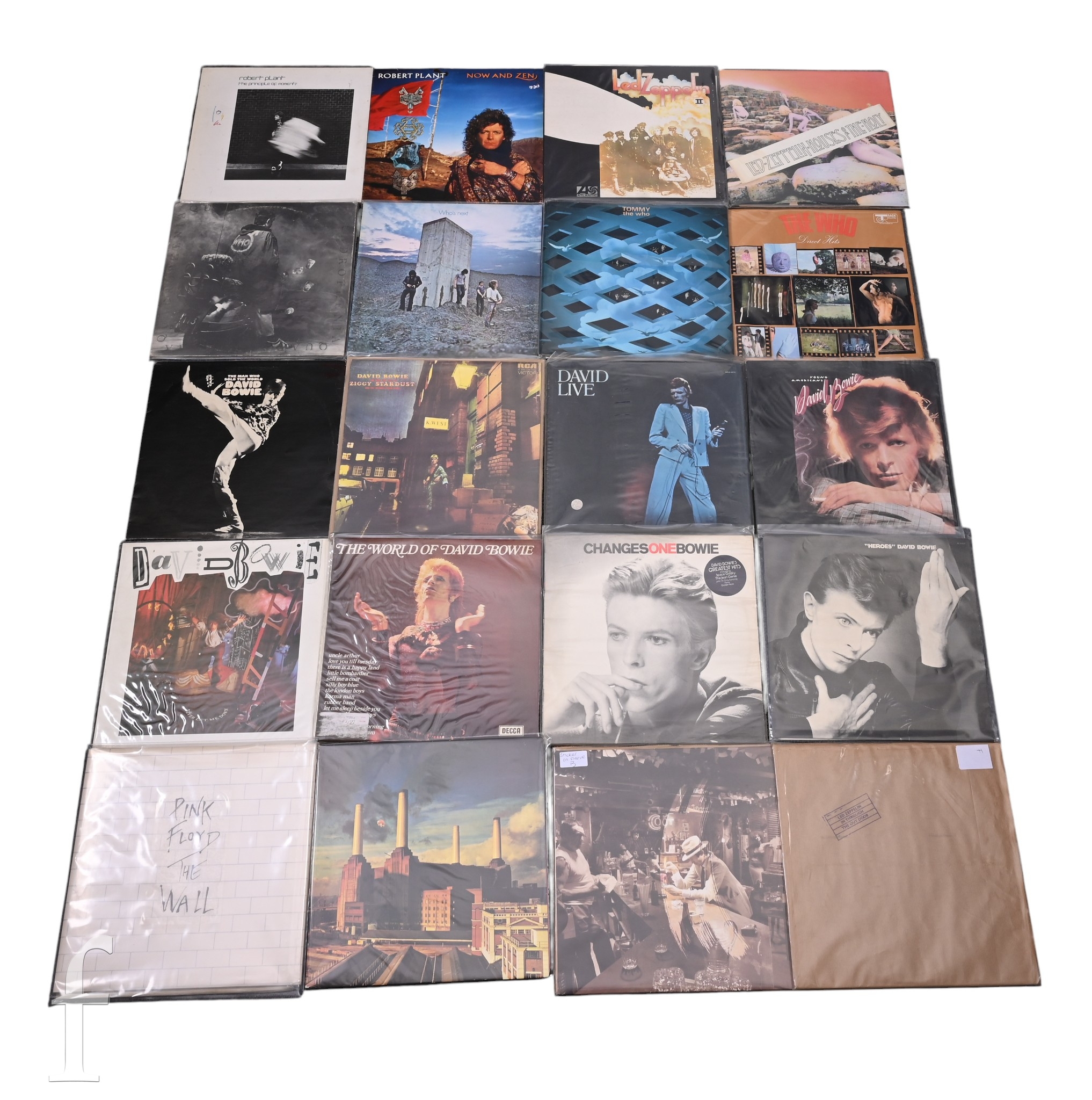 Led Zeppelin/Robert Plant/David Bowie/The Who/Pink Floyd - A collection of original and reissue LPs to include 7 x Led Zeppelin/Robert Plant - Principles Of Moments LC0121, Now and Zen WX149, IV K40037 with orange and green sticker, House of The Holy k50014 with orange and green sticker, In Through the Out Door B and F SSK 59410, 2 x Pink Floyd - Animals Stereo SHVL 819, The Wall SHDW 815, The Wall SHDW 411/12, David Bowie - Heroes PL12522, Changes RS 1055, The World Of David Bowie SPA 58, Never Let Me Down AMLS 3117, Young Americans RS1006, David Live APL2-0771, The Man Who Sold The World LSP 4816 Mainman credit, The Rise and Fall of Ziggy Stardust and the Spiders from Mars, SF287, Titanic credits, 4 x The Who - Direct Hits 612006, Tommy 613013, Quadrophenia 2 x LP2657013, Who's Next 2408 102. (20)