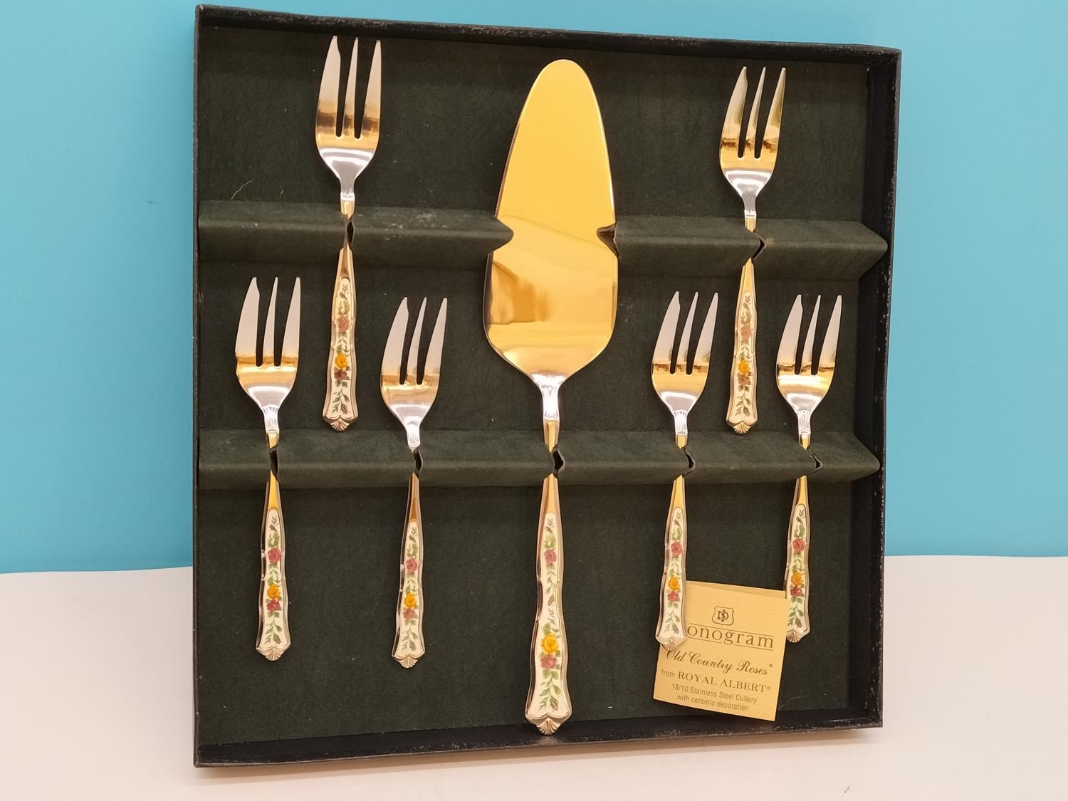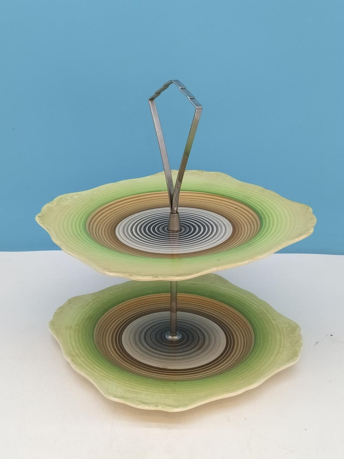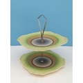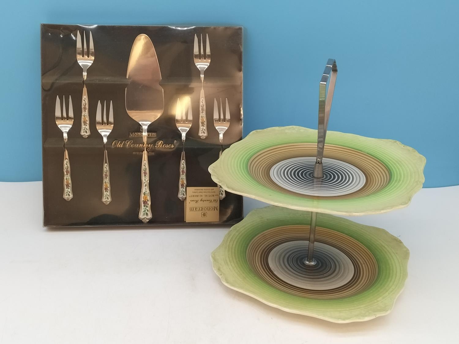 Monogram for Royal Albert 'Old Country Roses' Cake Knife and Forks Set plus a Meakin Banded Ware 2 Tier Cake Stand c 1930/1940, 25cm Tall.