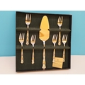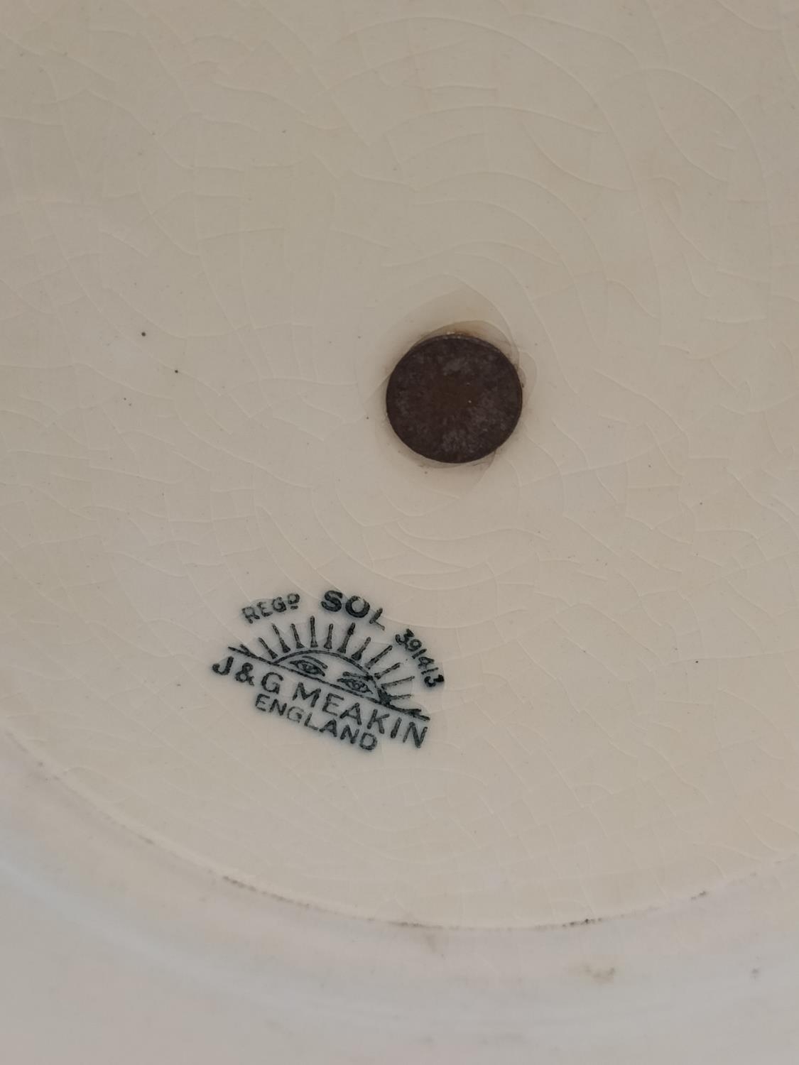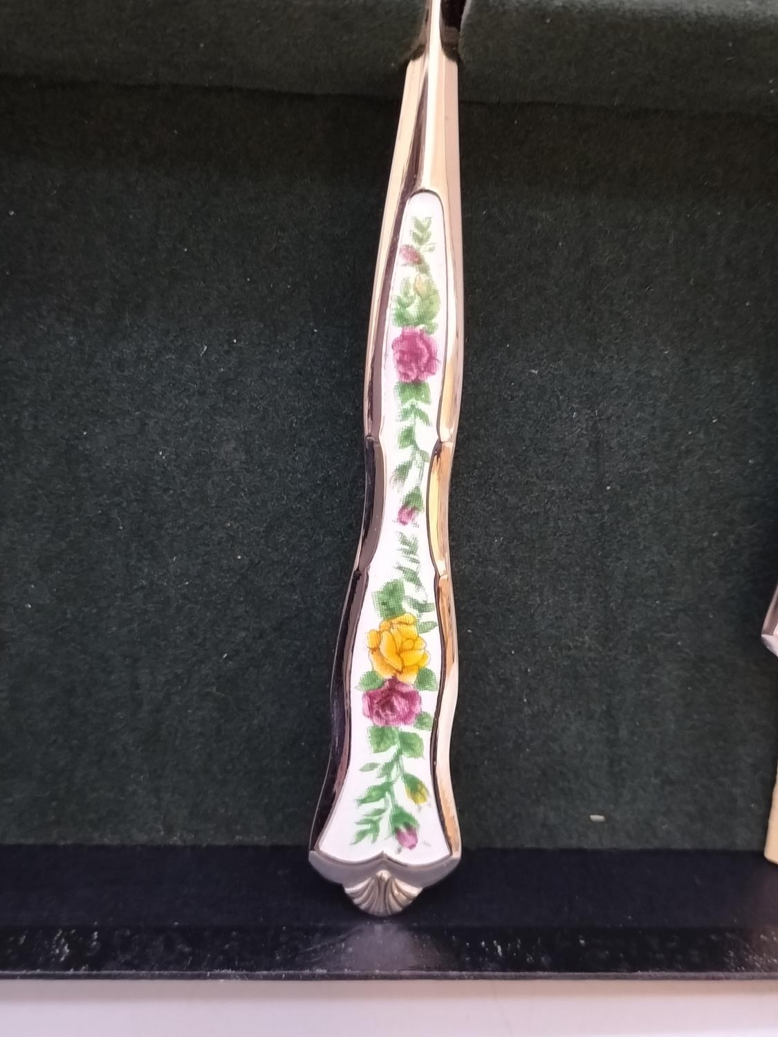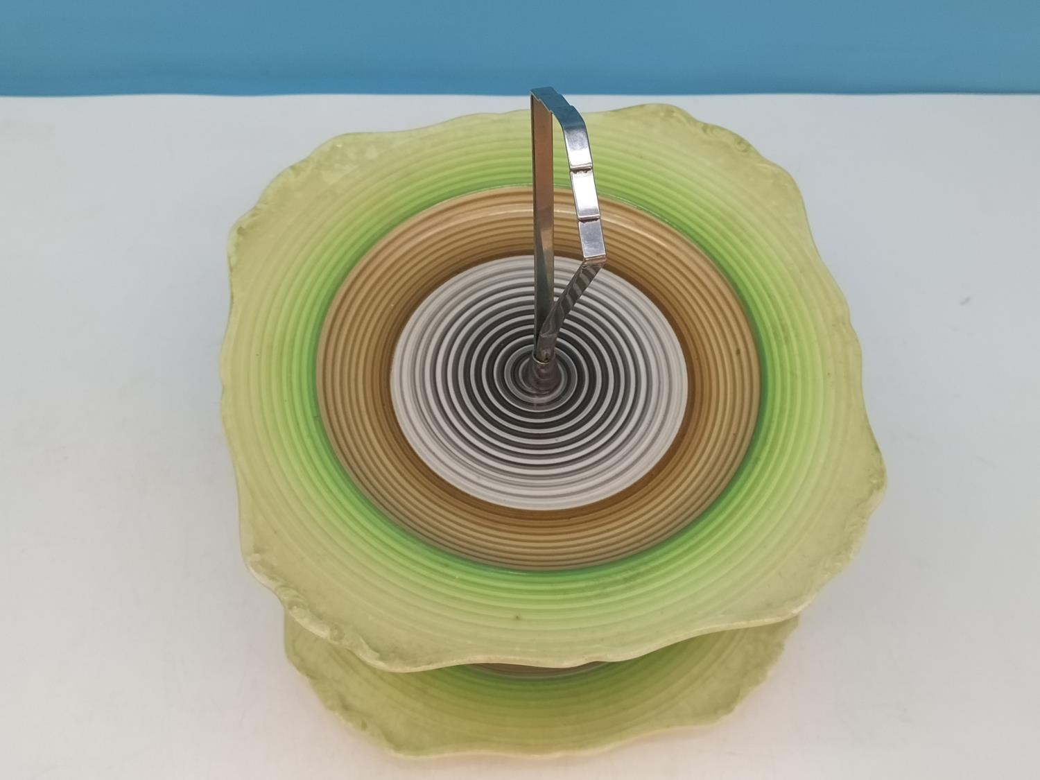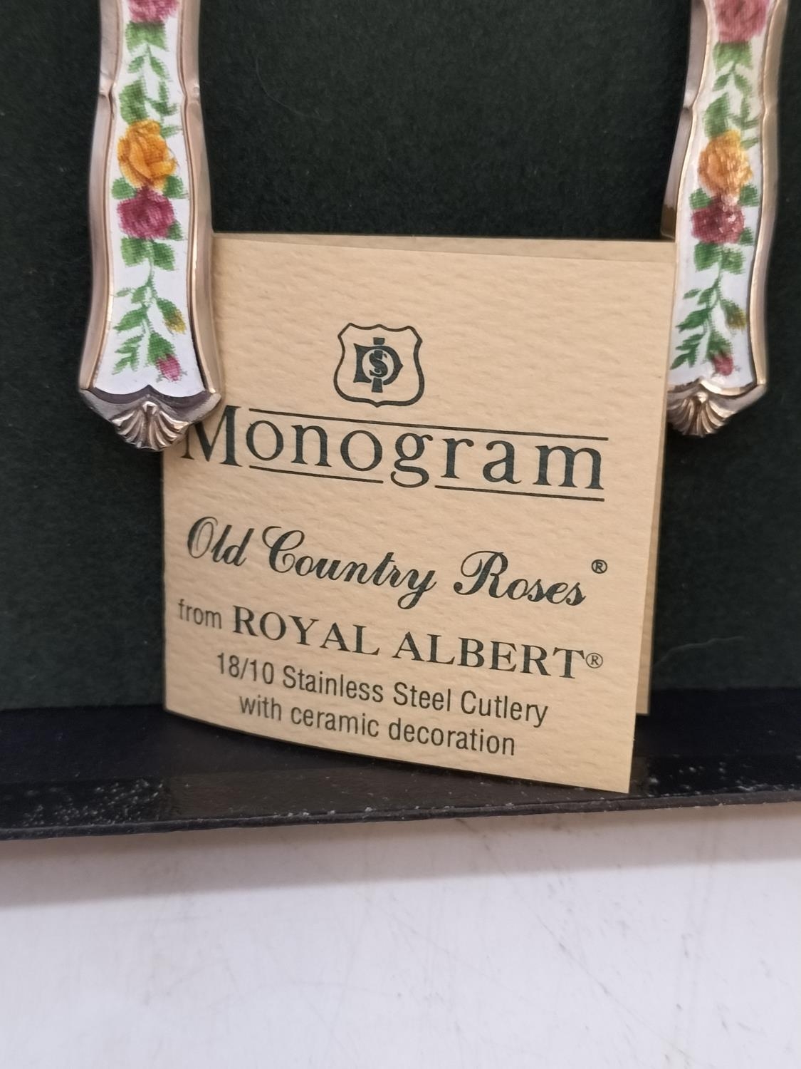 Monogram for Royal Albert 'Old Country Roses' Cake Knife and Forks Set plus a Meakin Banded Ware 2 Tier Cake Stand c 1930/1940, 25cm Tall.