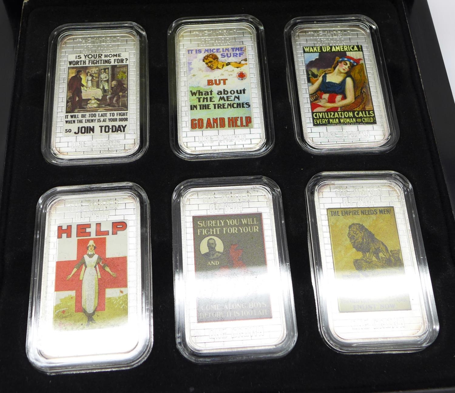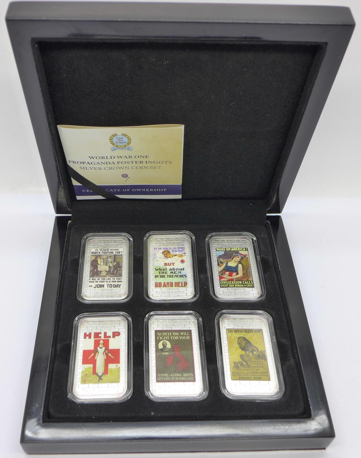 A World War One Propaganda Poster Ingots silver crown coin set, boxed, six ingots in .999 silver, each 20g