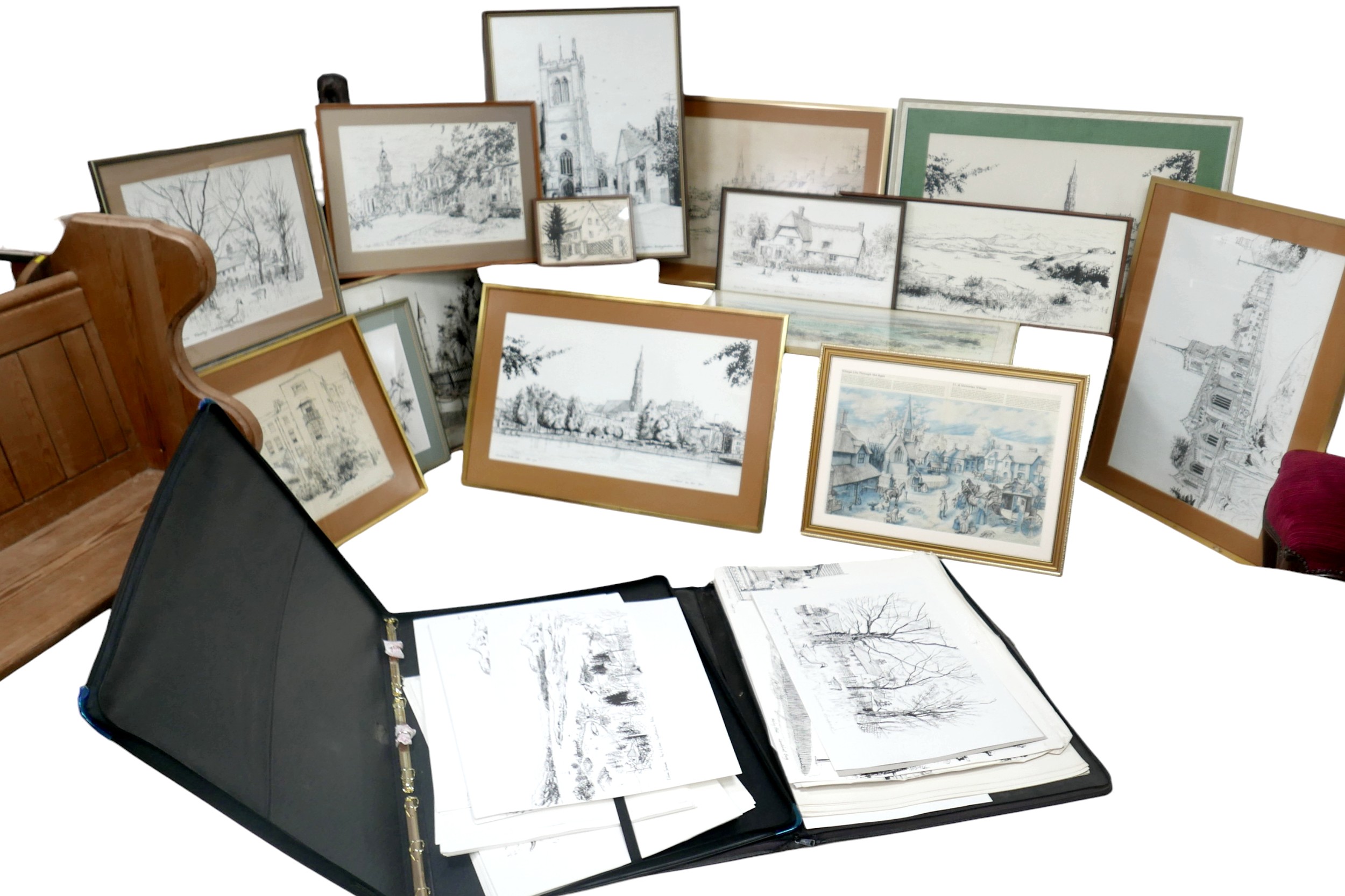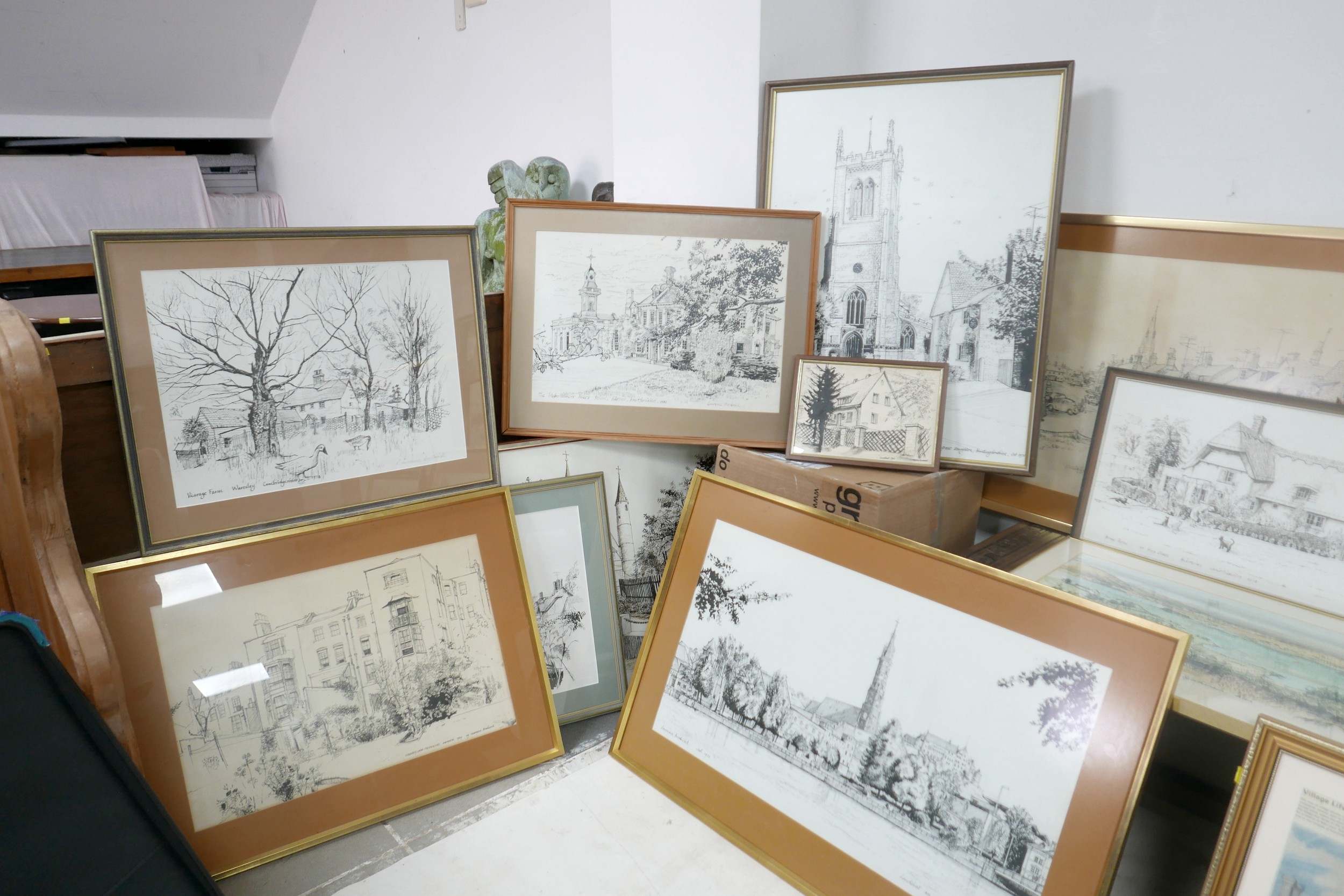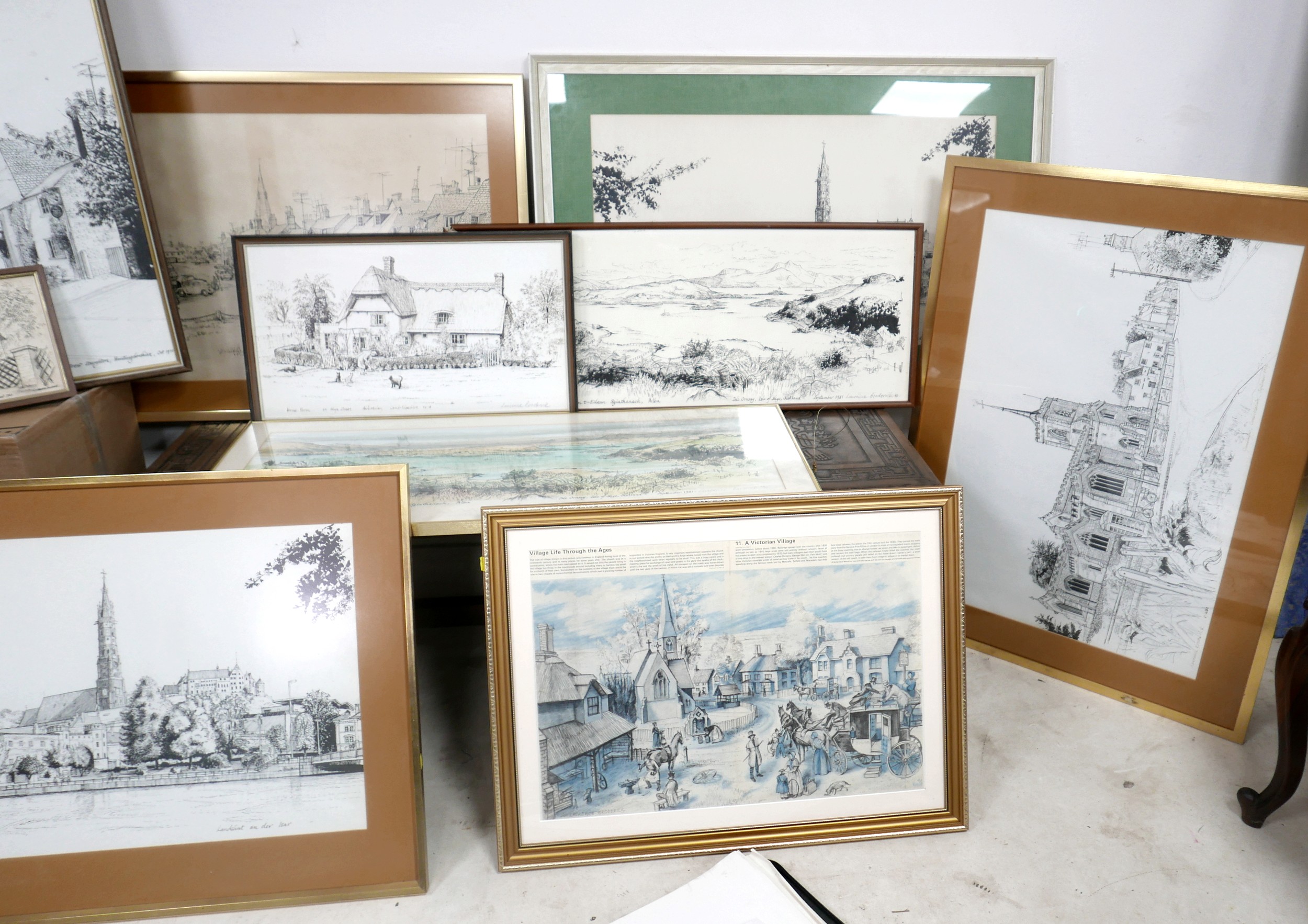 Laurence Broderick MRBS FRSA (18 June 1935 – 18 April 2024): a collection of fifteen framed ink drawings and prints and two portfolios of prints of Waresley, Gamlingay, Isle of Skye, Highgate, Landshut an Der Isar.