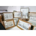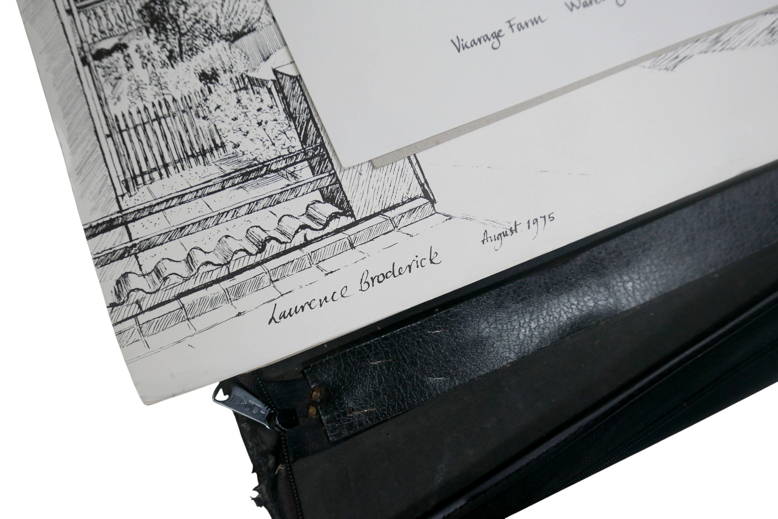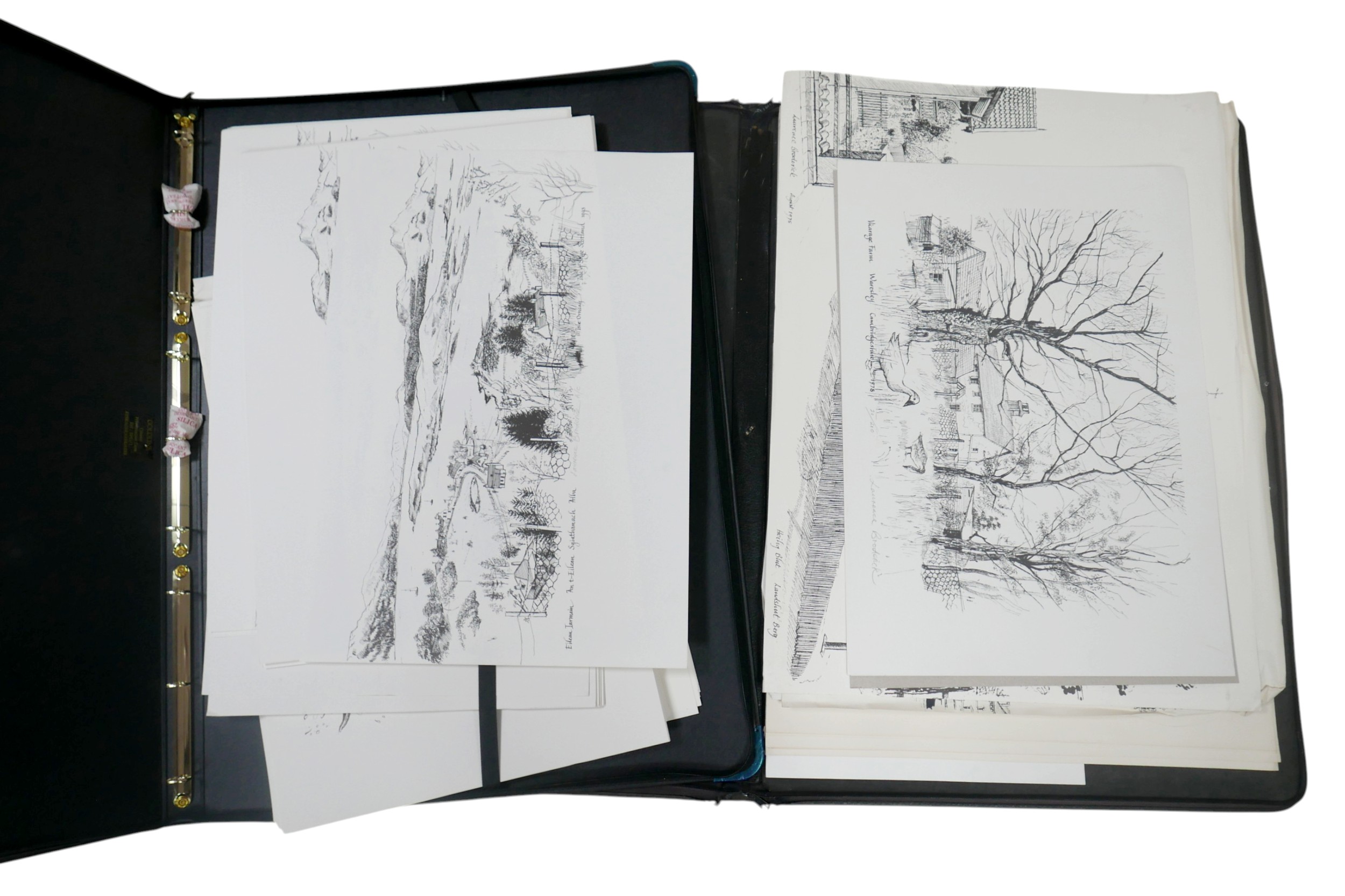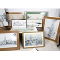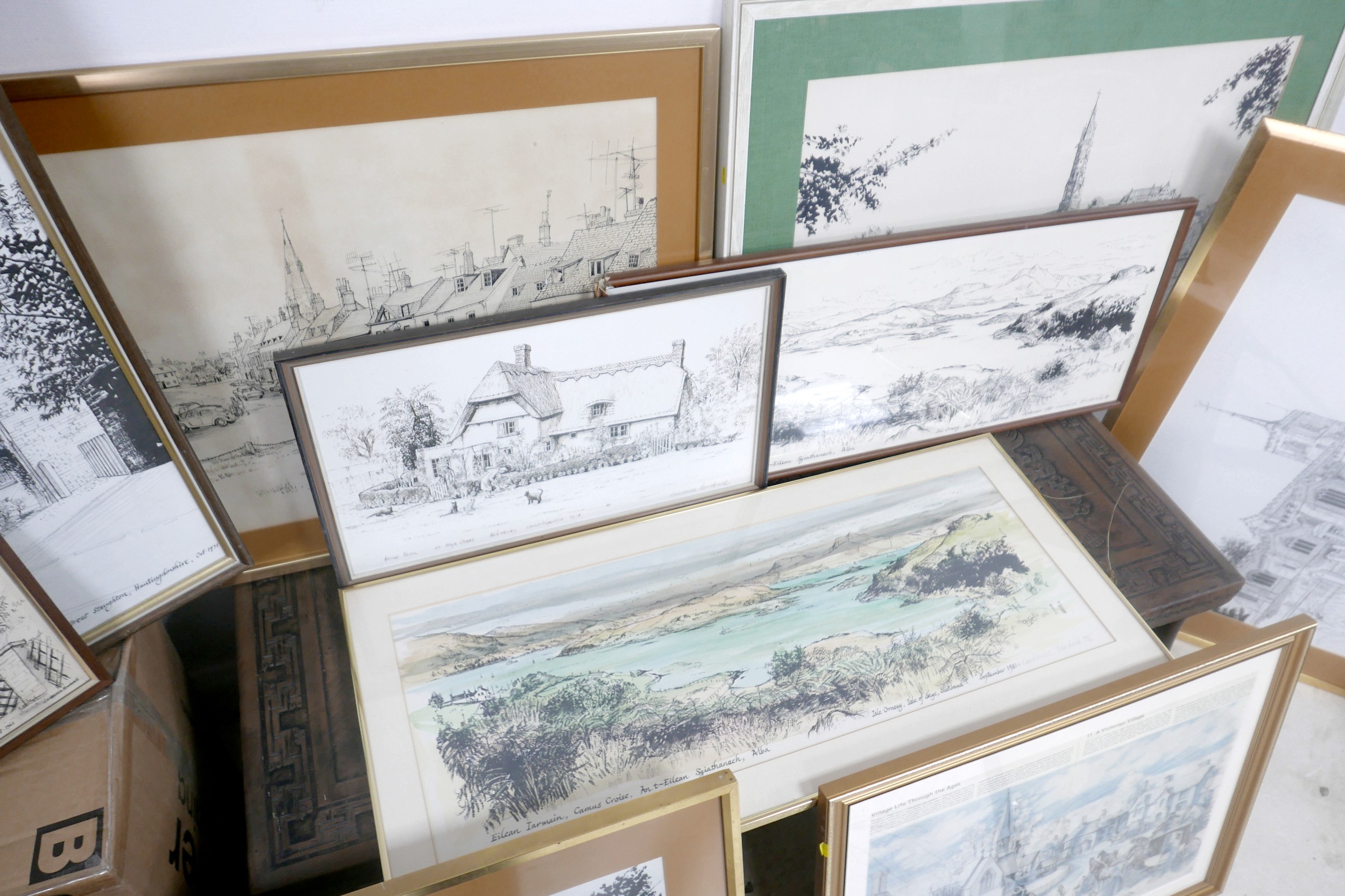 Laurence Broderick MRBS FRSA (18 June 1935 – 18 April 2024): a collection of fifteen framed ink drawings and prints and two portfolios of prints of Waresley, Gamlingay, Isle of Skye, Highgate, Landshut an Der Isar.