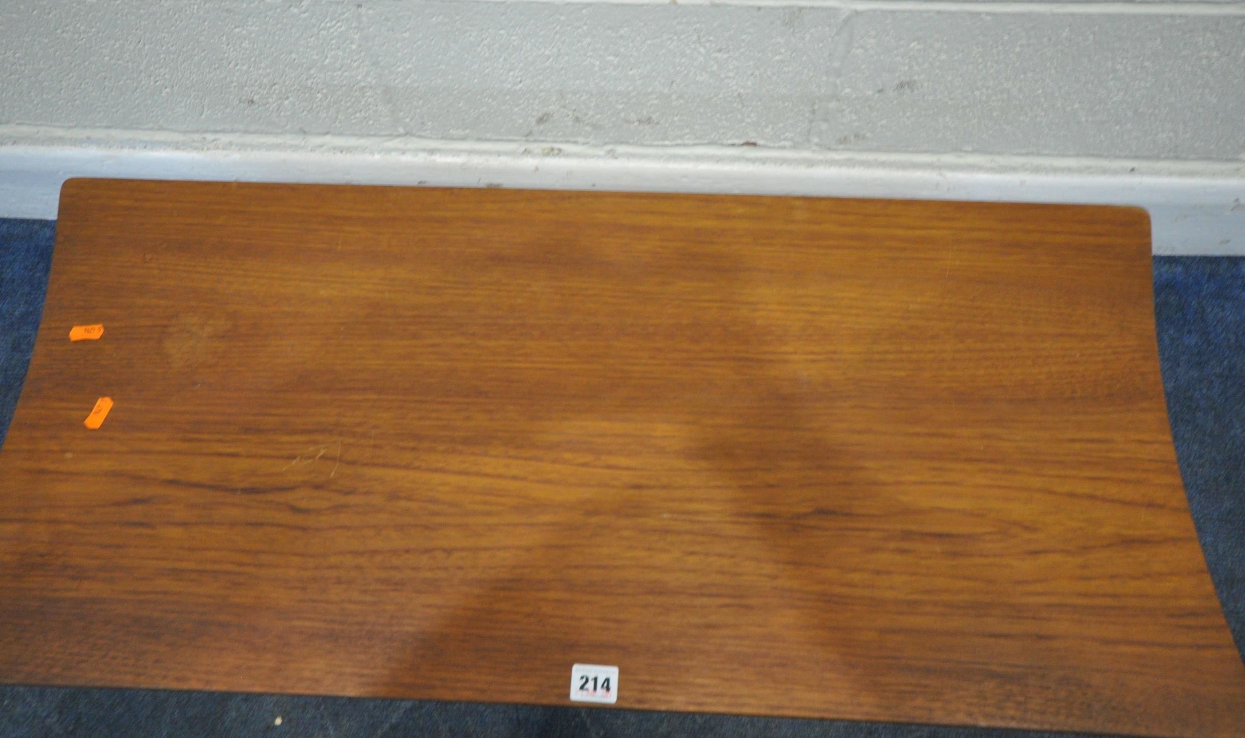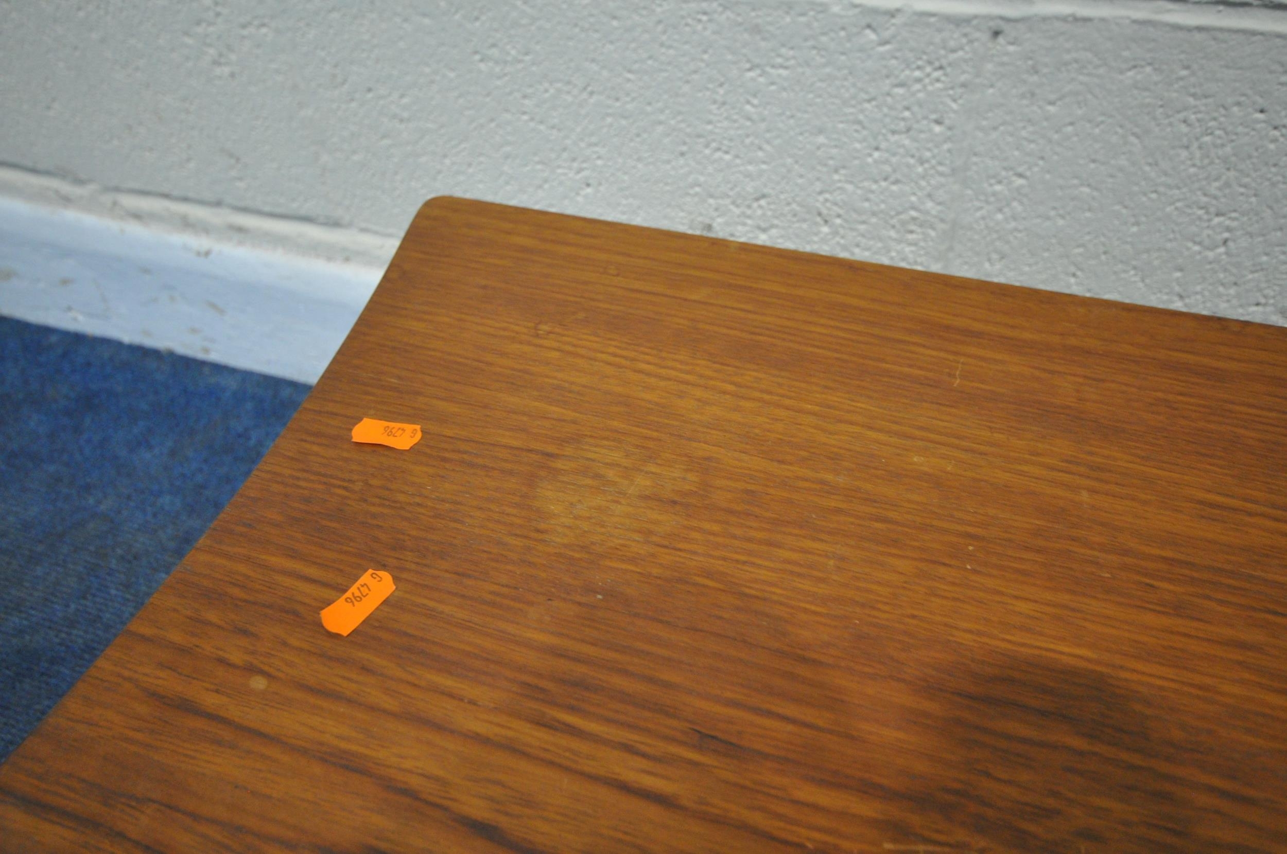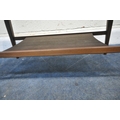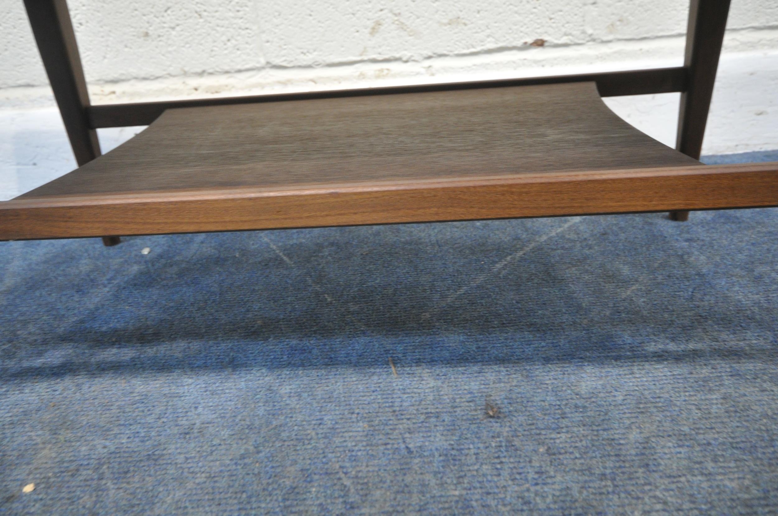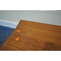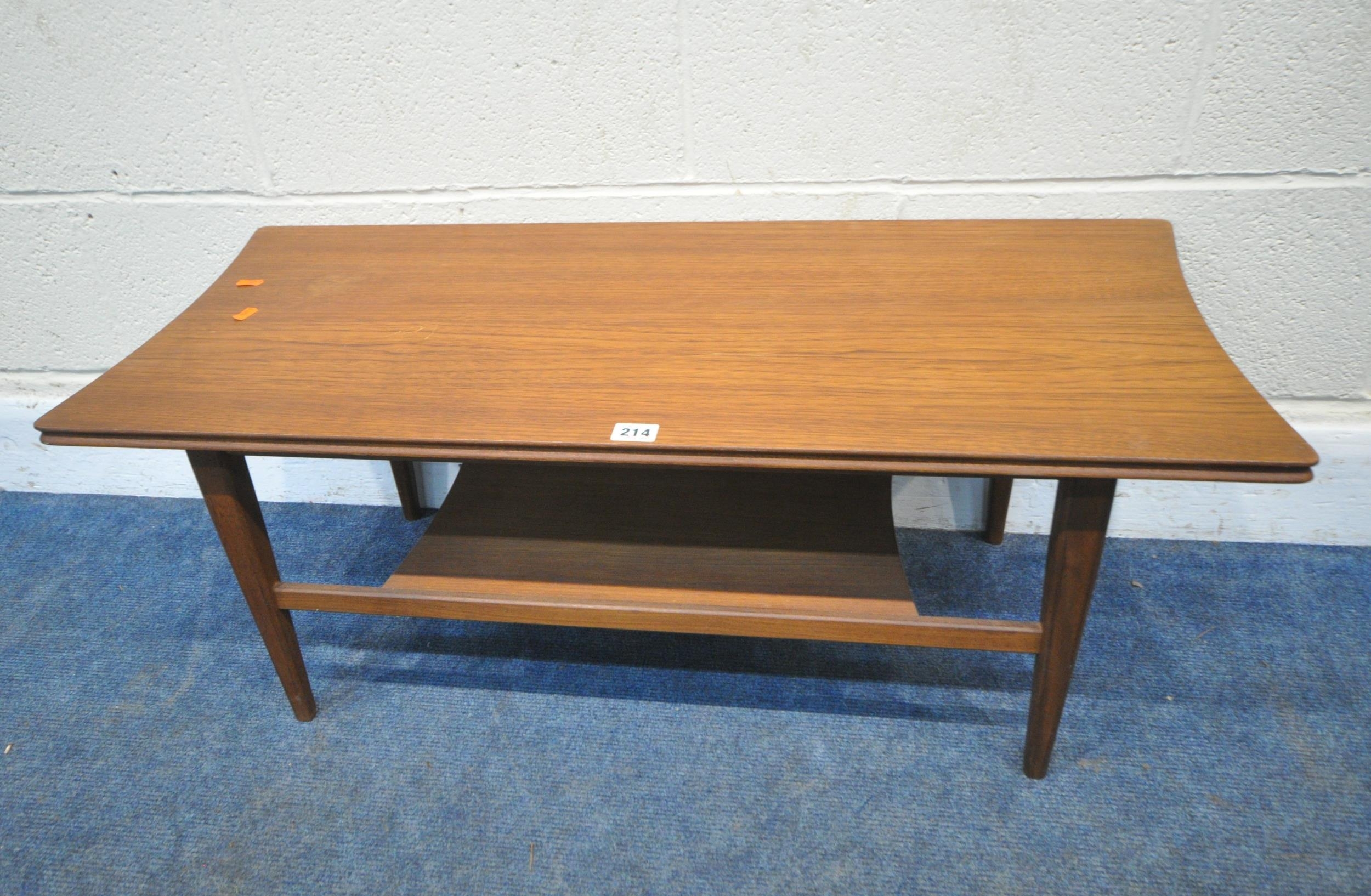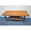 POSSIBLY RICHARD HORNBY, A MID-CENTURY TEAK COFFEE TABLE, with concave ends, raised on square tapered legs, united by an undershelf, width 92cm x depth 41cm x height 36cm, condition report: marks, light scratches, stains, other signs of usage