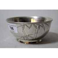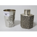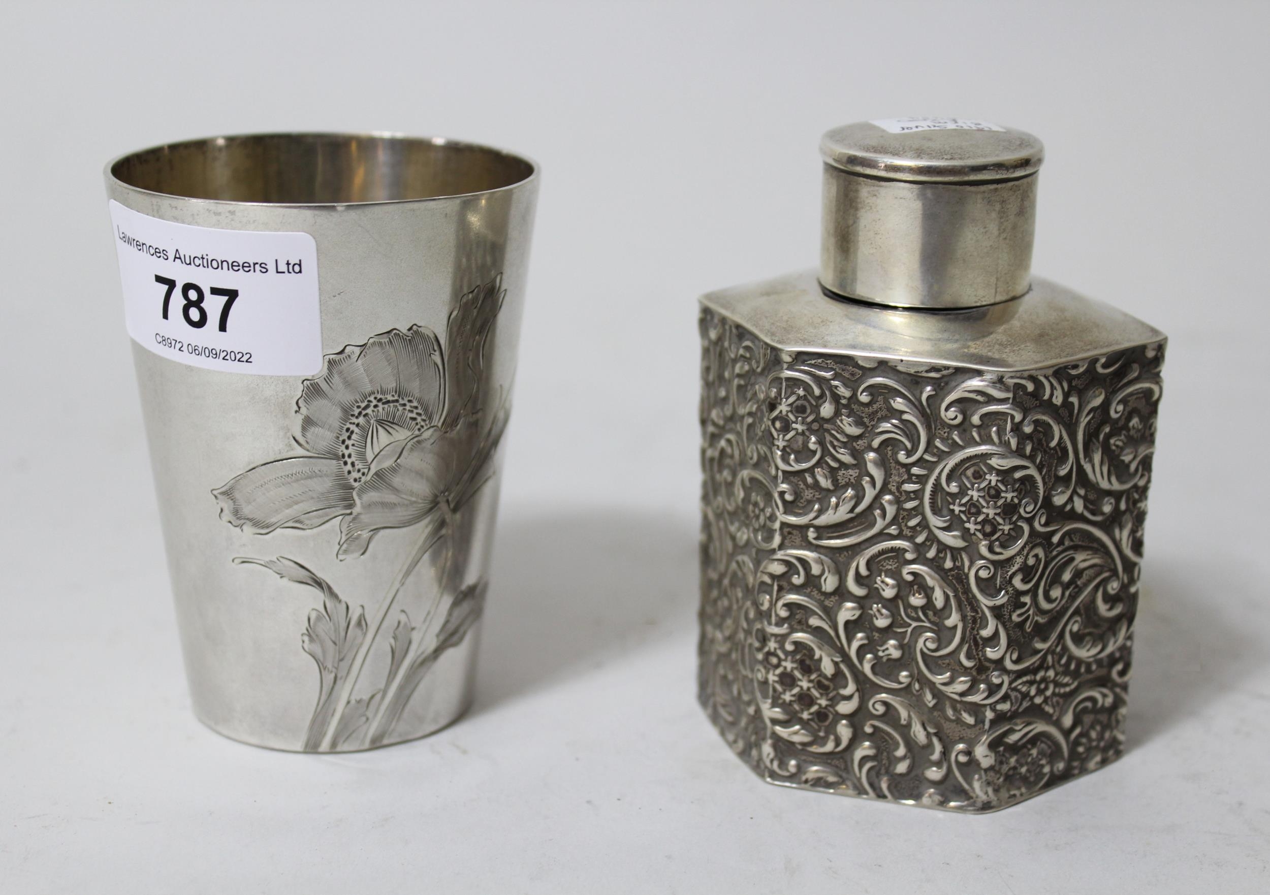 Continental (800 mark) silver beaker with engraved floral decoration, 3.75ins high, 3oz together with a small early 20th Century Birmingham silver teapoy, 3.75ins high, 2.5oz