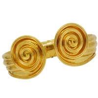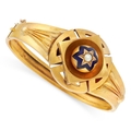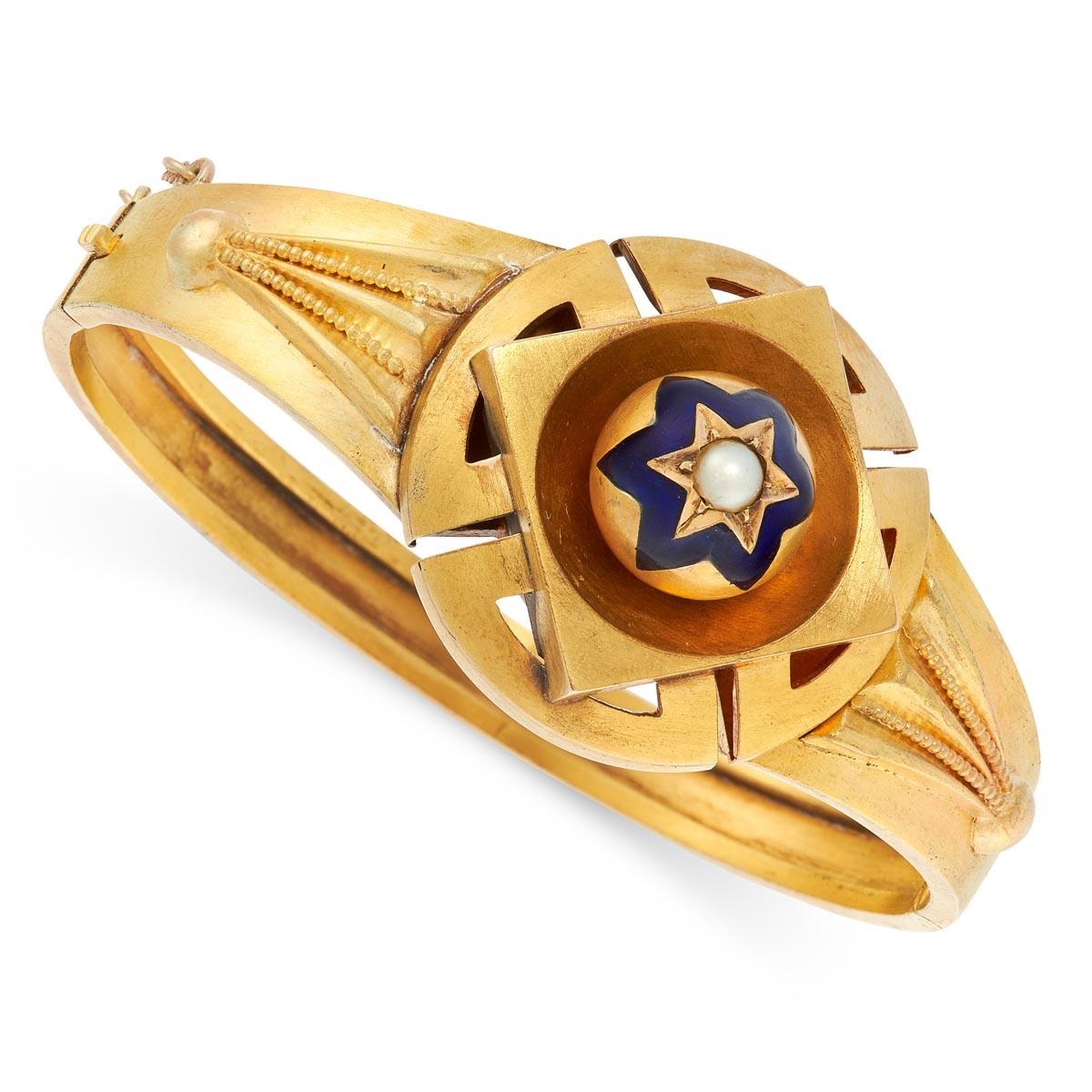 ANTIQUE VICTORIAN PEARL AND ENAMEL BANGLE, decorated to the center with a pearl, surrounded with a blue enamel star pattern. In part openwork gemetrical mount. Inner diam. 5.5 cm. 17.9 grams.