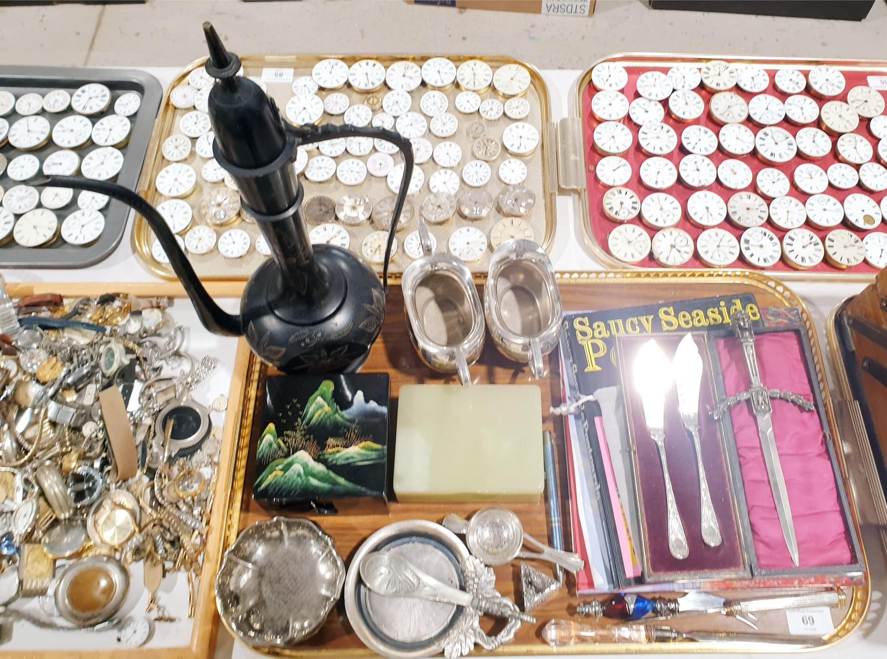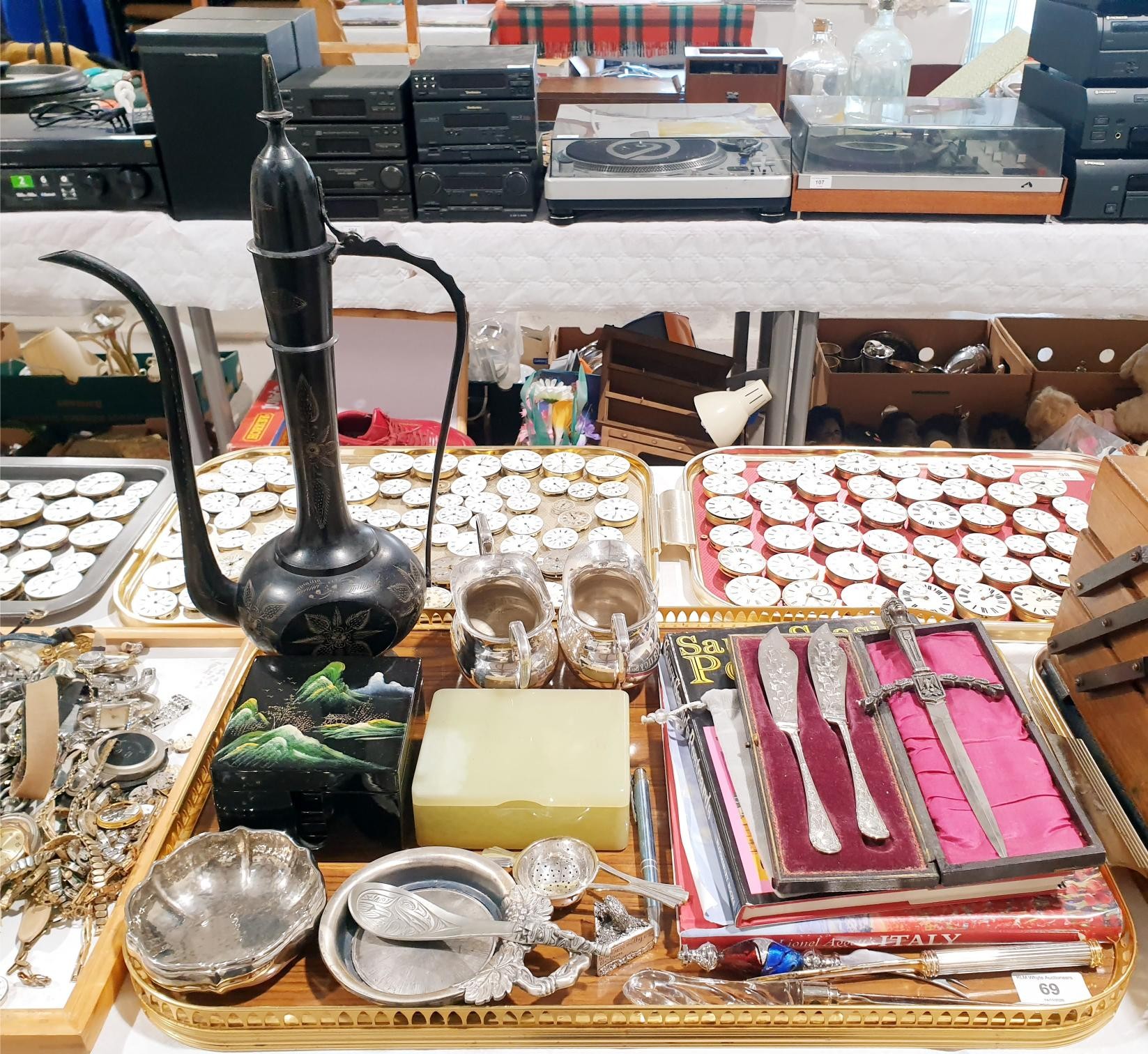 A tray of assorted including an eastern teapot, height 44.5cm. No Shipping. Arrange collection or your own packer and shipper, please. Electricals are sold as scrap.