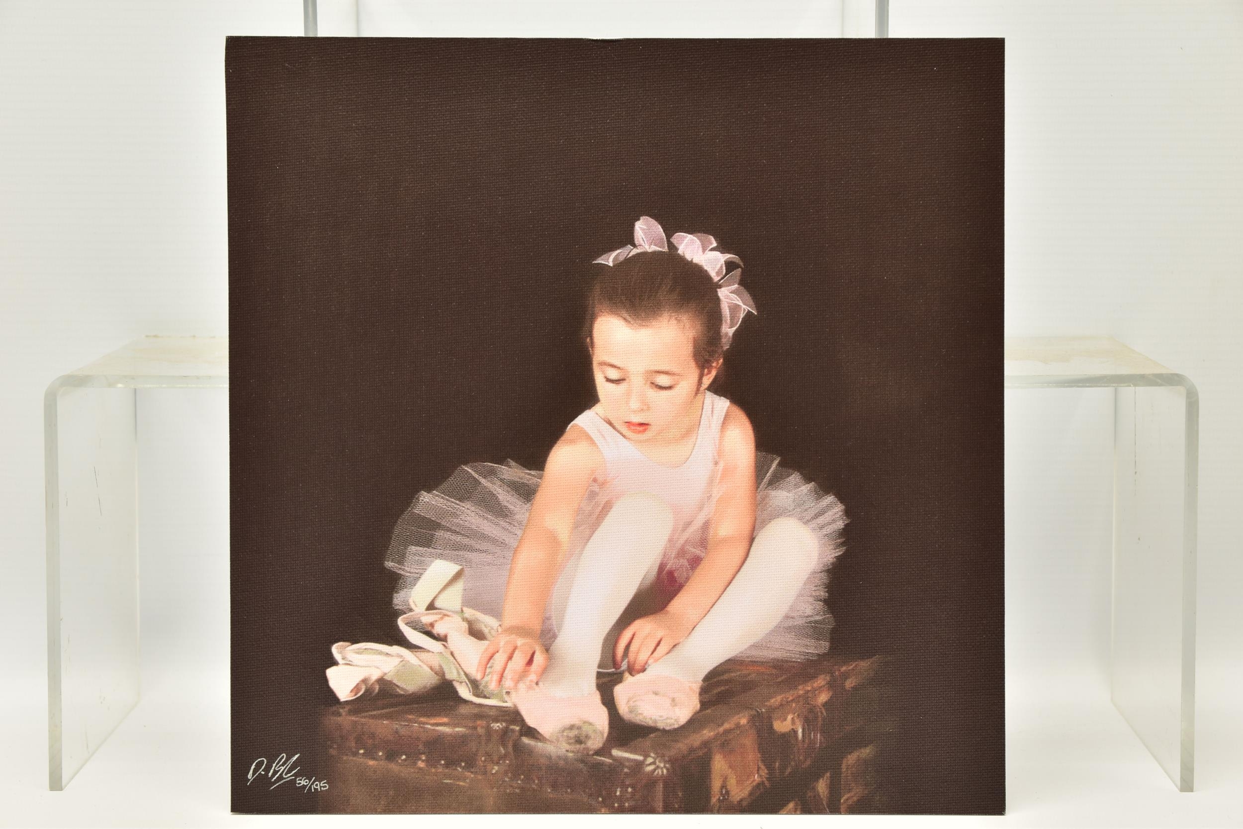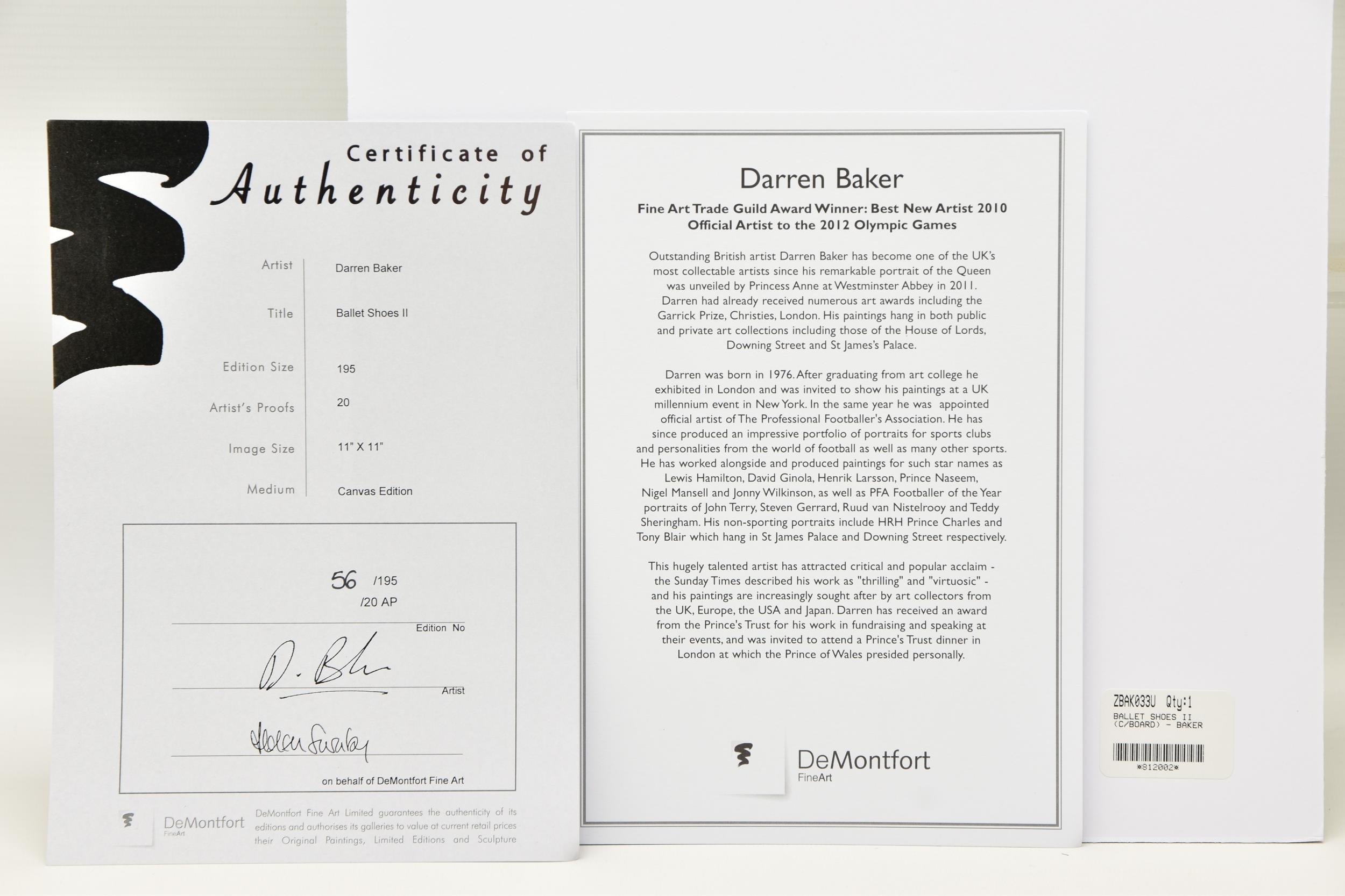 DARREN BAKER (BRITISH 1976) 'BALLET SHOES II', a signed limited edition print depicting a young girl wearing ballet clothes, 56/195 with certificate, approximate unframed size 28cm x 28cm, Condition: no obvious damage
