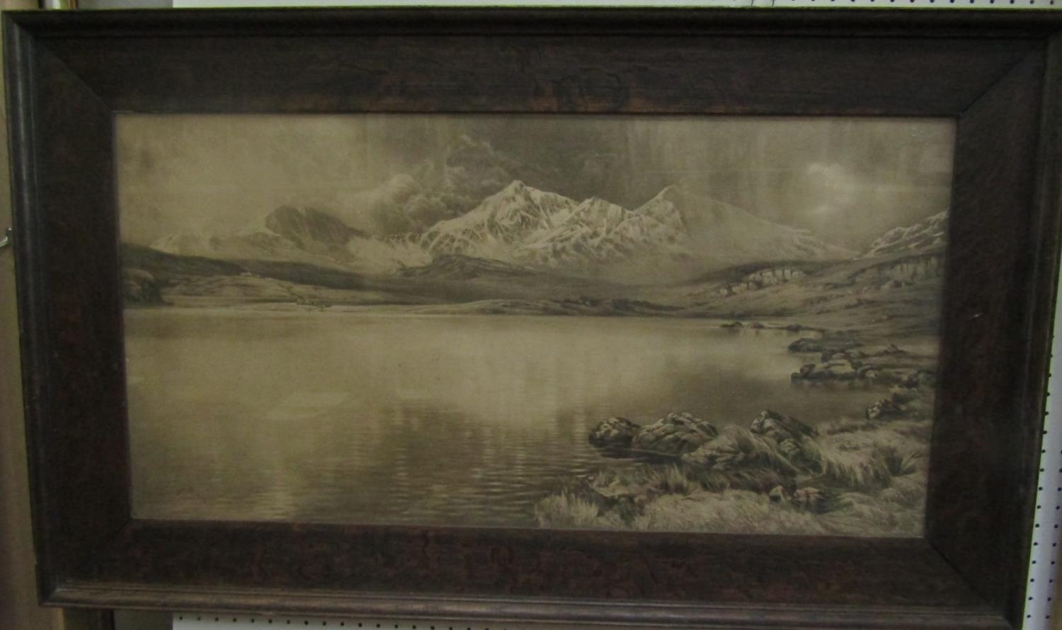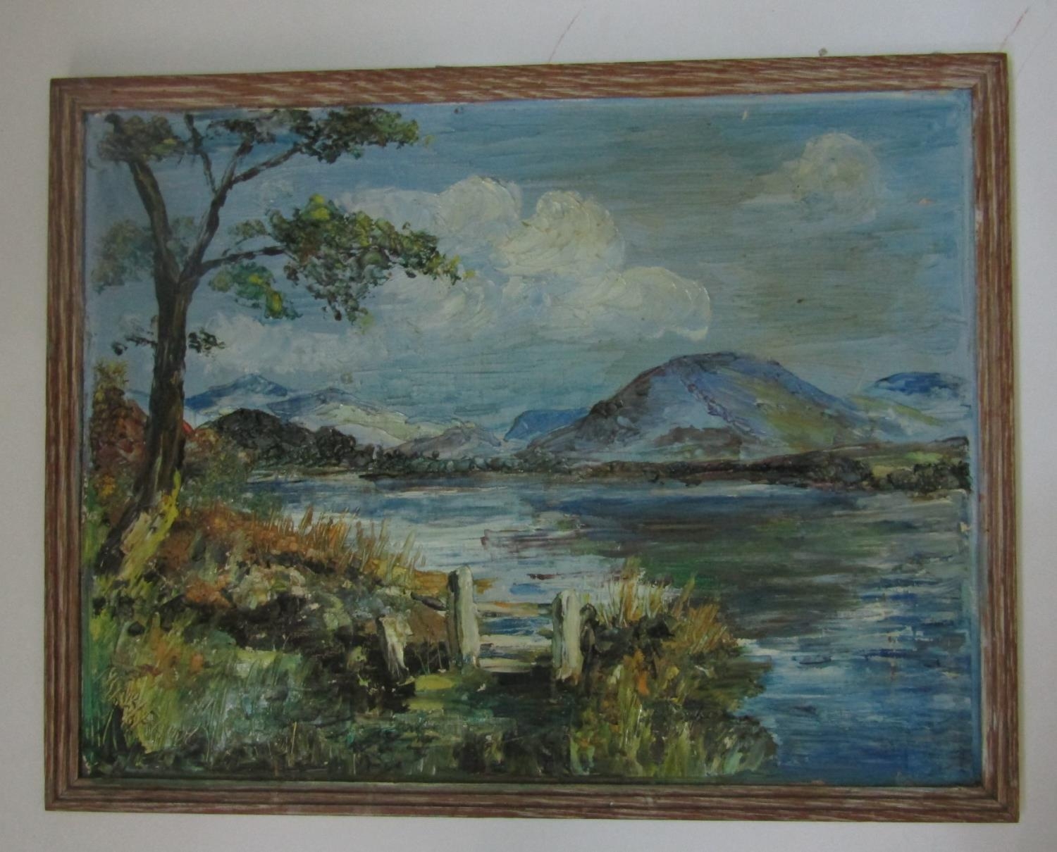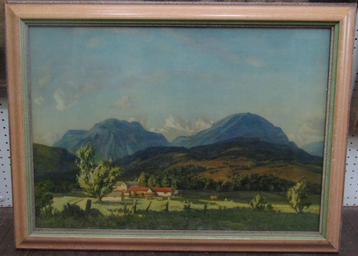 Mary Faint (20th century school) - Mountainous lakeland scene, oil on board painted in palette knife technique, signed, inscribed verso and dated 1977, 38 x 48cm approx, together with a coloured print of a mountainous landscape after Edward Neatby, also together with a late 19th century monochrome print of an extensive mountainous landscape after H Oliver, 41 x 80cm in wide oak frame (3)