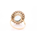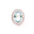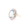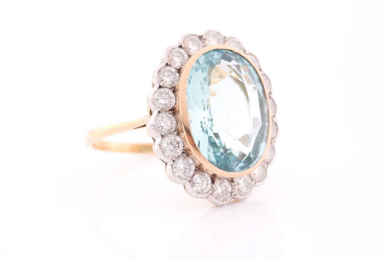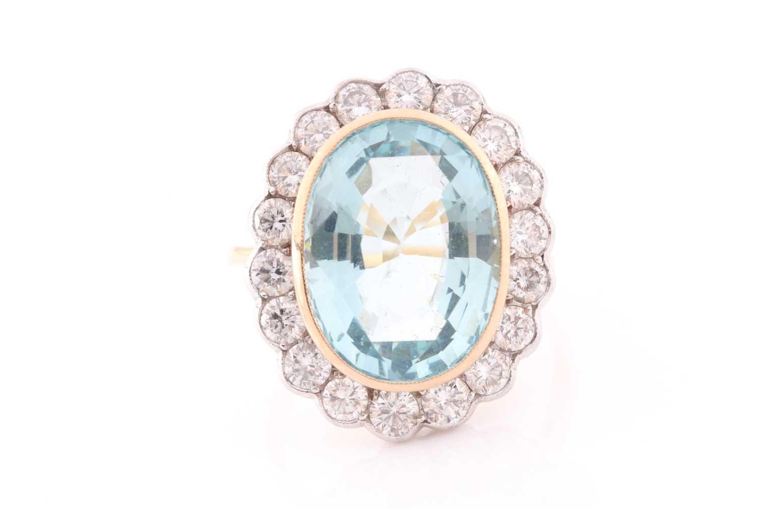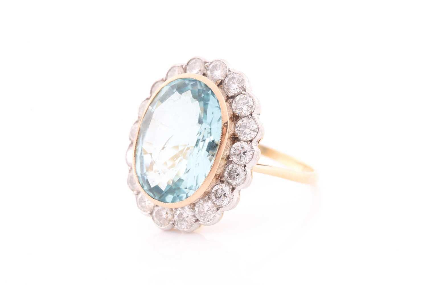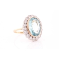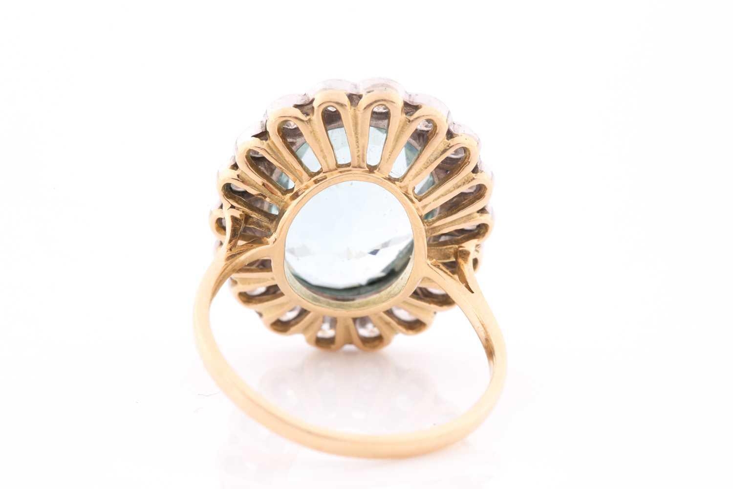 An 18ct yellow gold, diamond, and aquamarine cocktail ring, set with a mixed oval-cut aquamarine of approximately 8.0 carats, within a scalloped border of roud brilliant-cut diamonds of approximately 1.60 carats combined, size O, 8 grams.