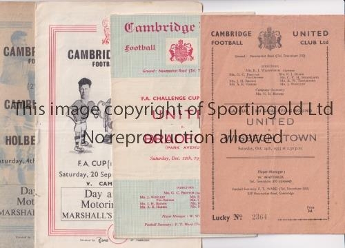 CAMBRIDGE UNITED Seven home programmes for FA Cup ties v Wisbech Town 3rd Qualifying Round 24/10/53, Bradford Park Avenue 2nd Round 12/12/53, Cambridge City 1st Qualifying Round 20/9/58, Holbeach United 2nd Qualifying Round 4/10/58, Cambridge City 3rd Qualifying Round 17/10/59. City won 1-0 to knock their local rival out of the cup. Also Lowestoft United 4th Qualifying Round 20/10/62 and Hitchin Town 4th Qualifying Round 19/10/63. Generally good