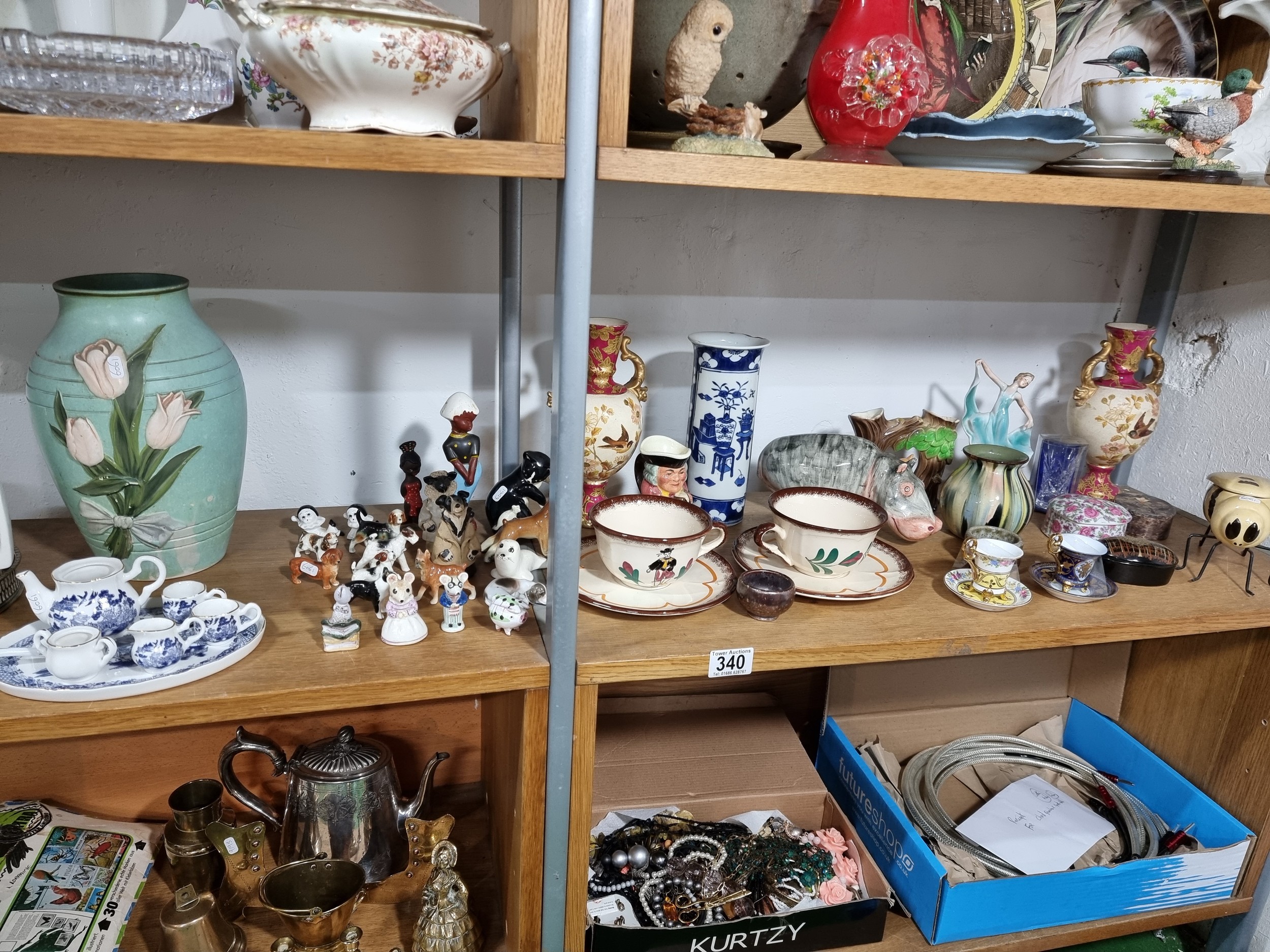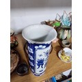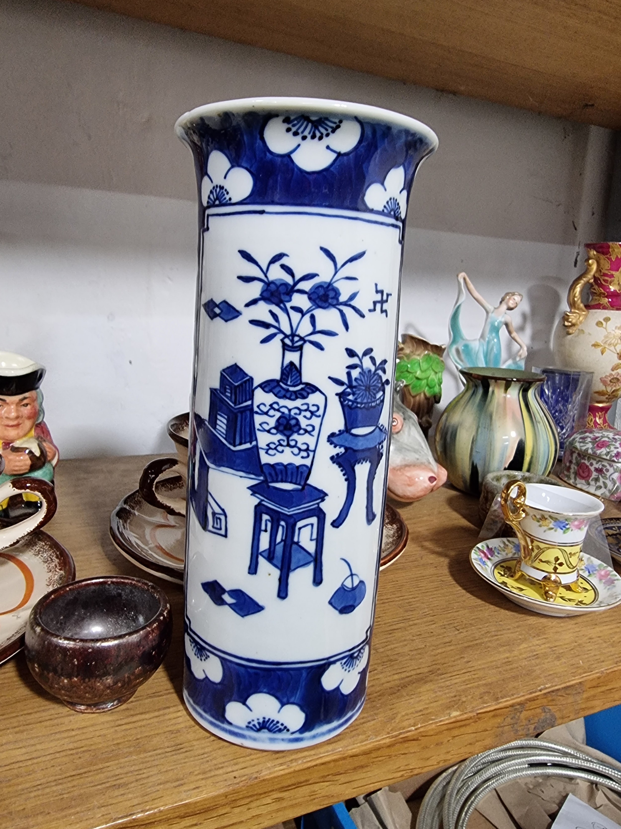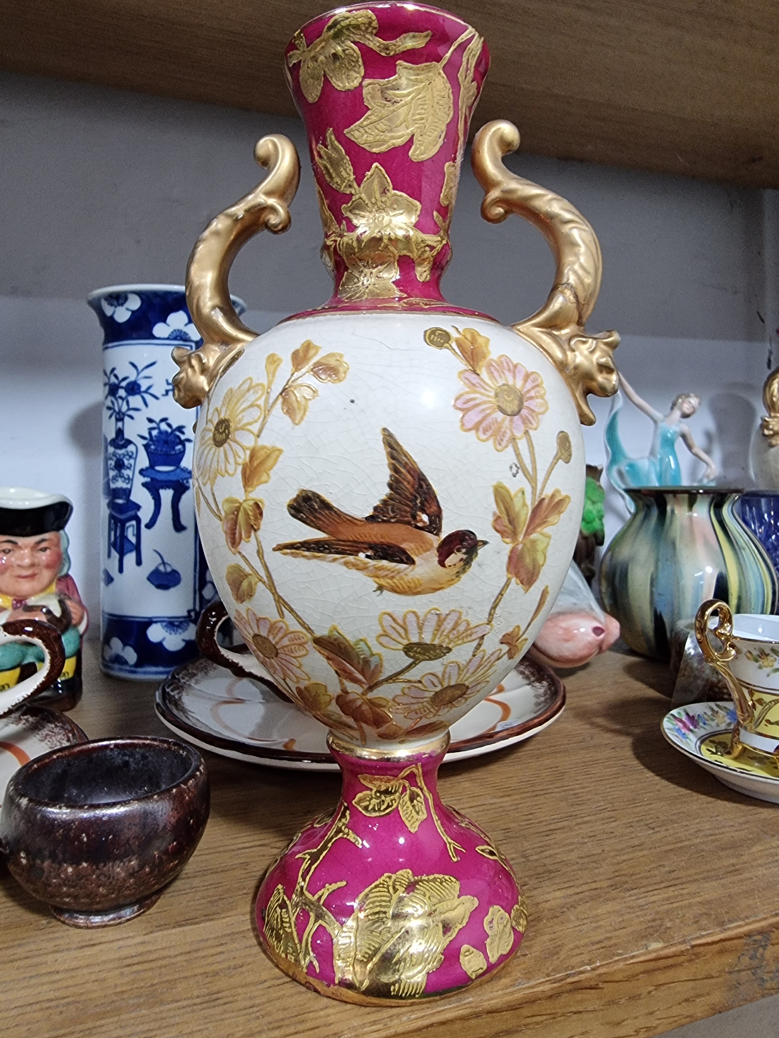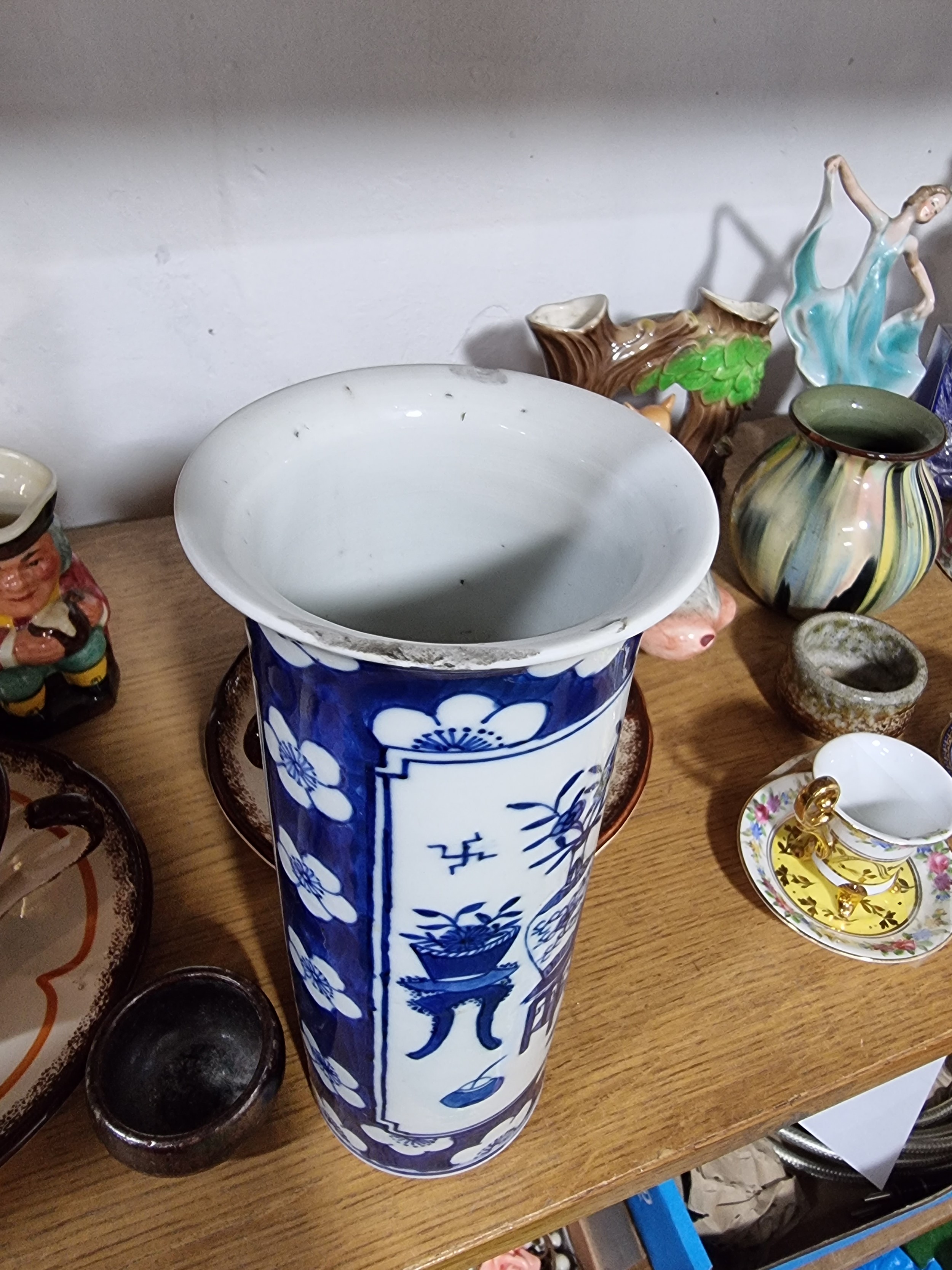 A shelf full of good quality collectables including an interesting antique blue and white Chinese vase with character marks to the base, a large Brentleigh Chelsea vase, a large quantity of figurines, 2 pretty antique hand-painted vases with a bird and floral design (one is af) along with many other collectables, please study photos for more details.
