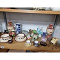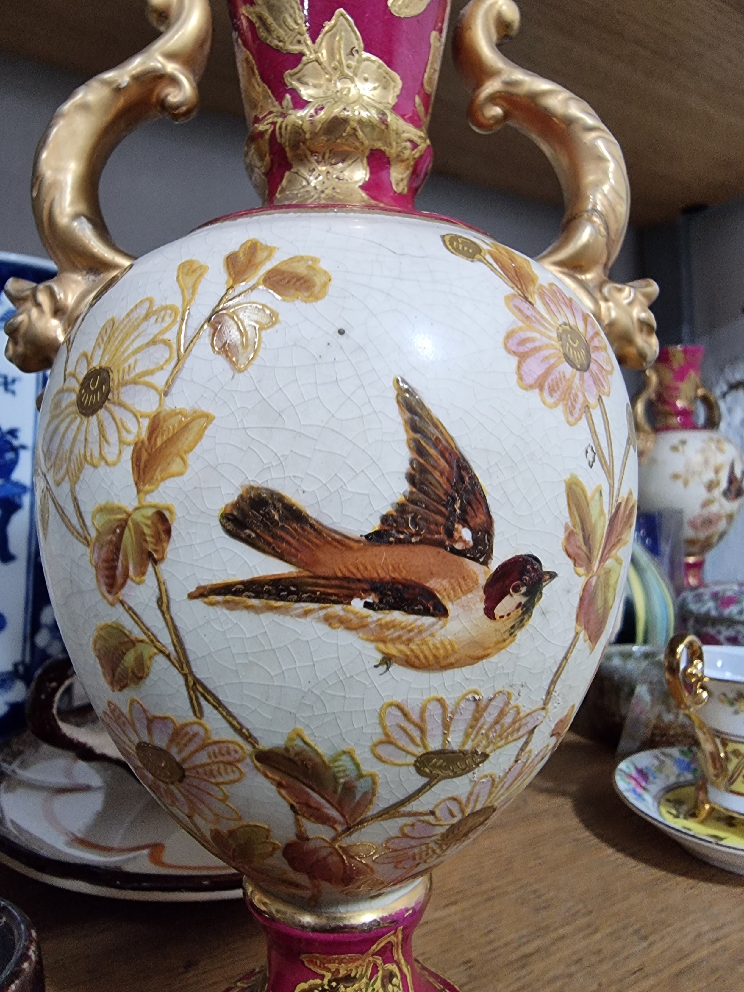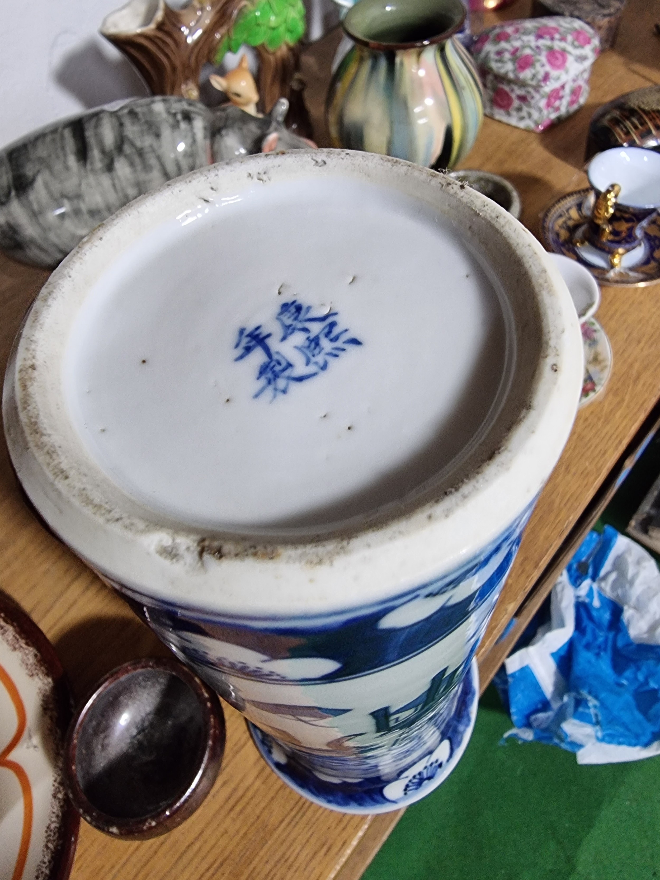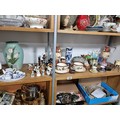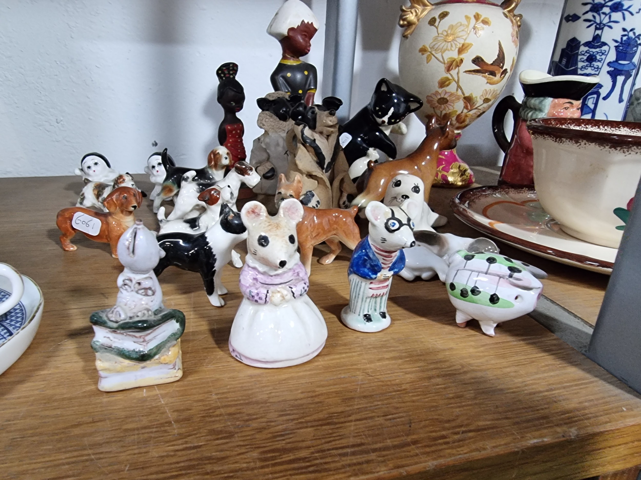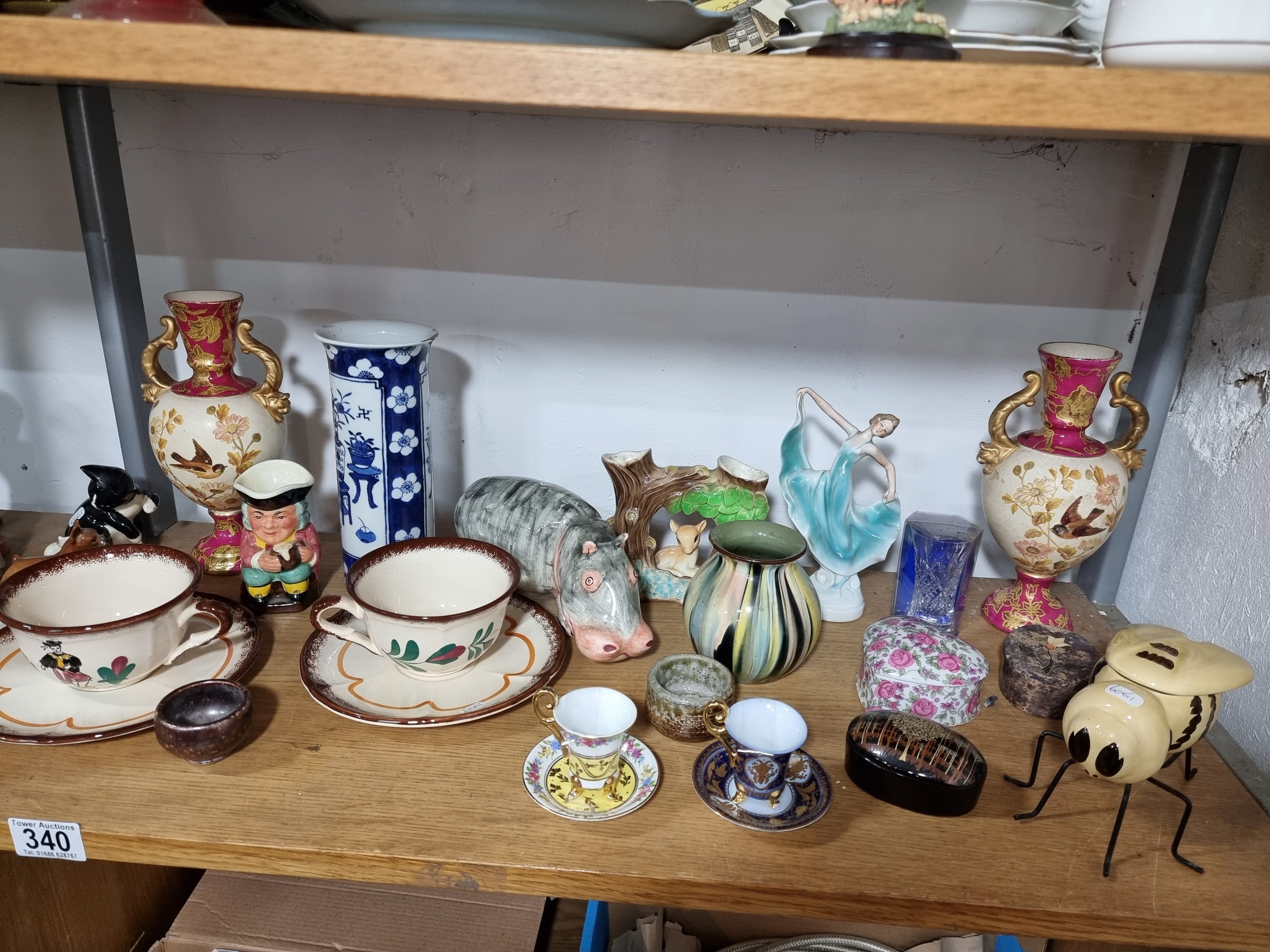 A shelf full of good quality collectables including an interesting antique blue and white Chinese vase with character marks to the base, a large Brentleigh Chelsea vase, a large quantity of figurines, 2 pretty antique hand-painted vases with a bird and floral design (one is af) along with many other collectables, please study photos for more details.