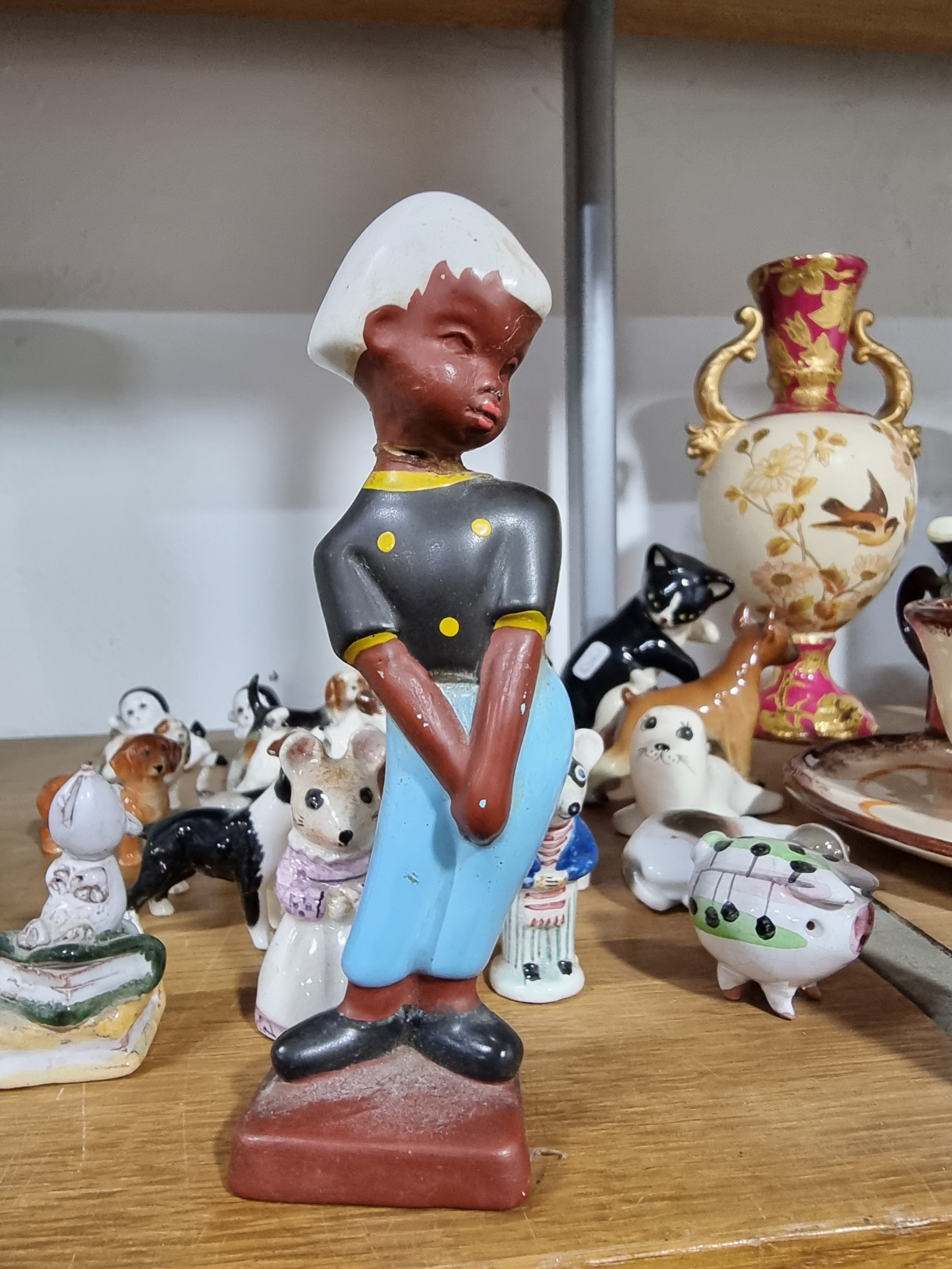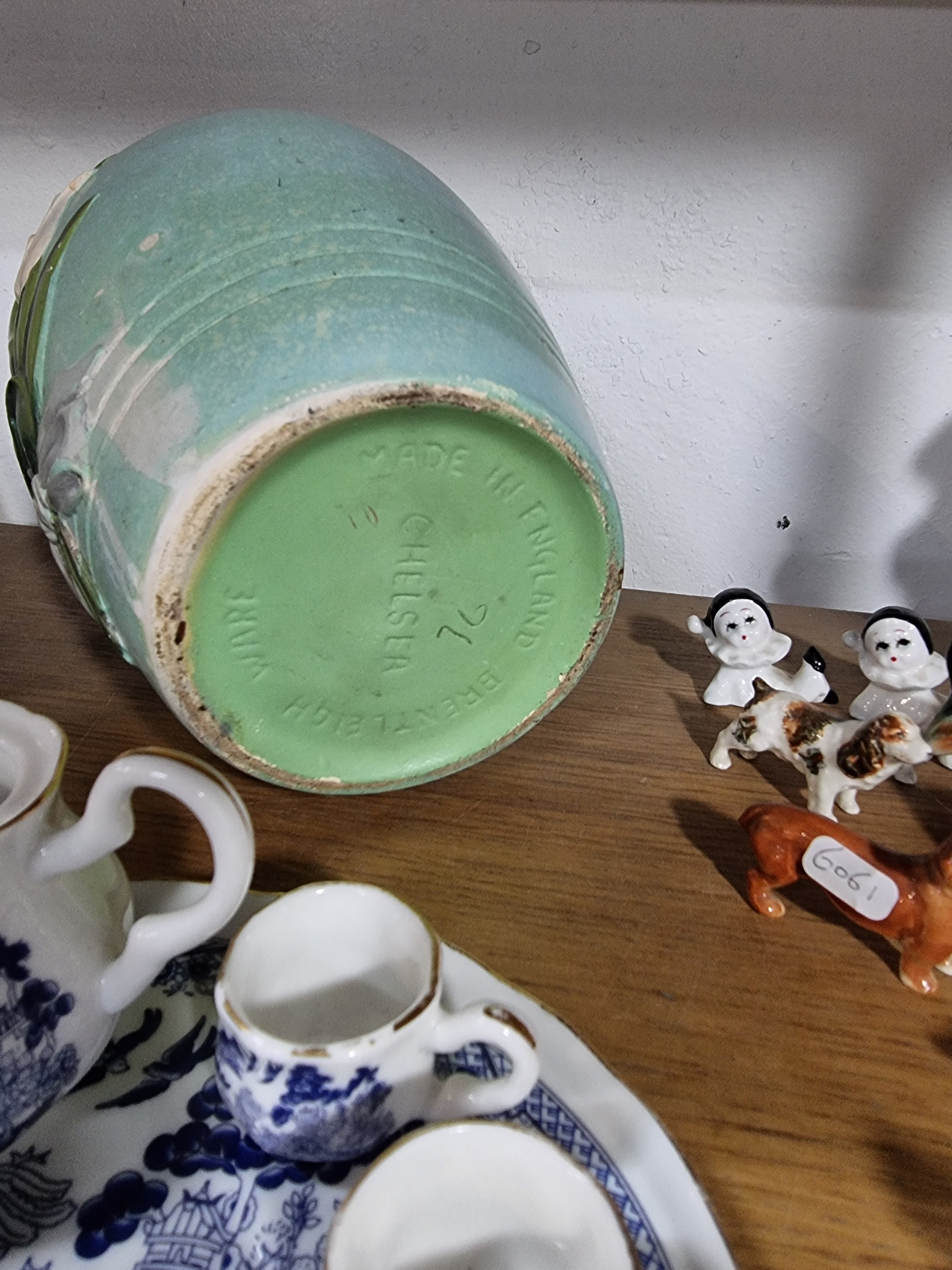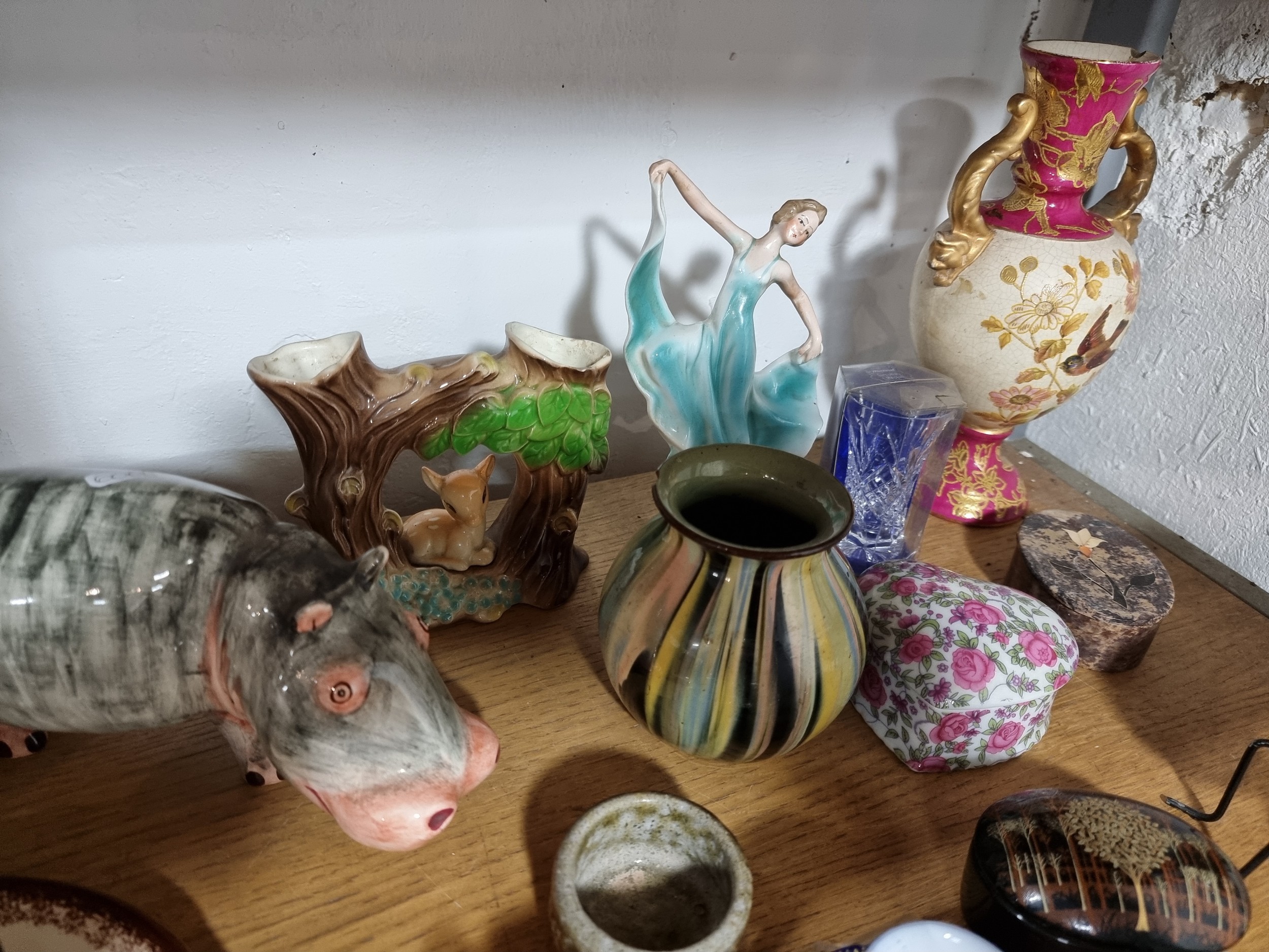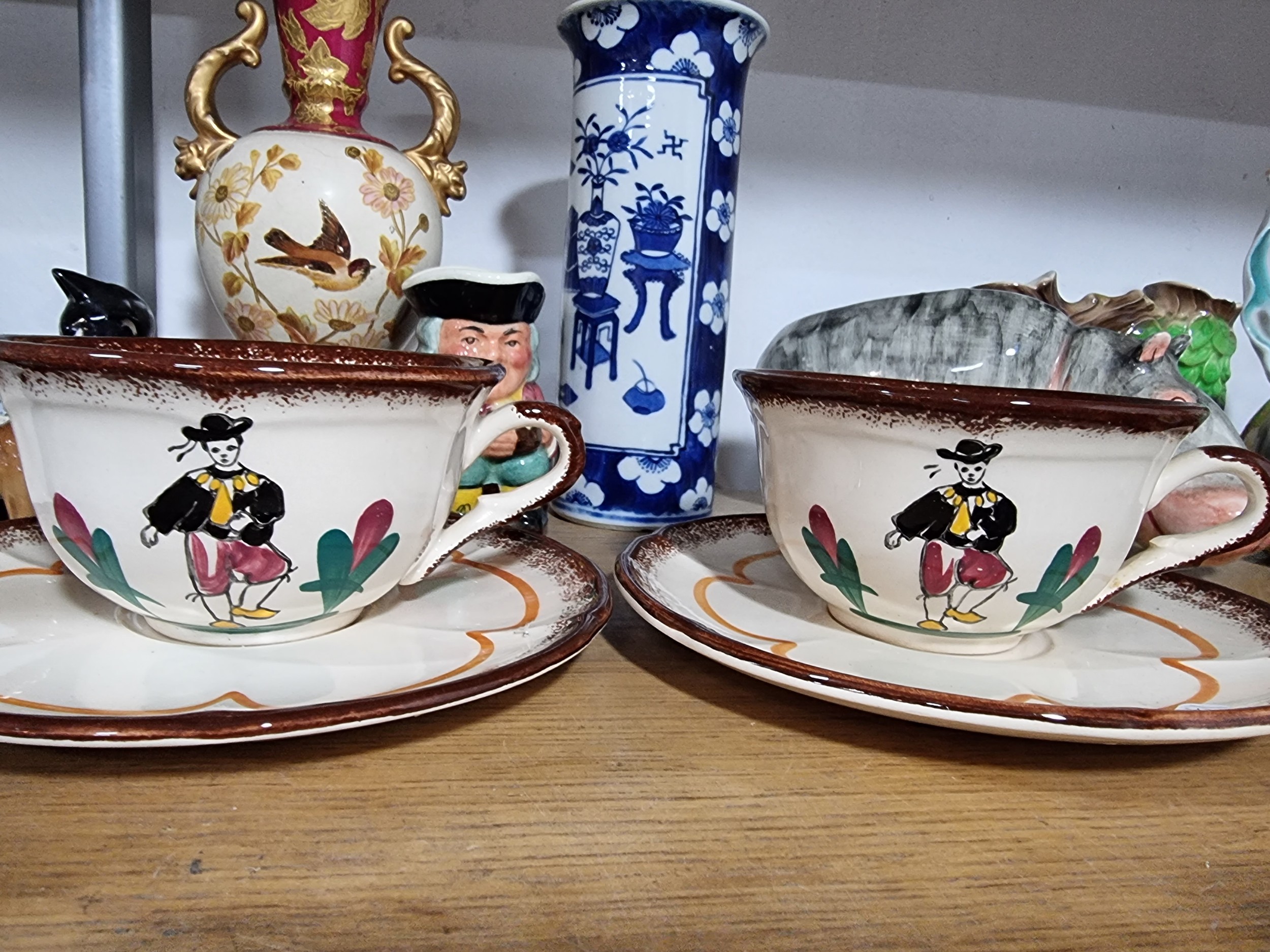 A shelf full of good quality collectables including an interesting antique blue and white Chinese vase with character marks to the base, a large Brentleigh Chelsea vase, a large quantity of figurines, 2 pretty antique hand-painted vases with a bird and floral design (one is af) along with many other collectables, please study photos for more details.