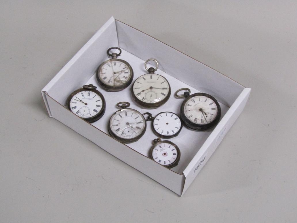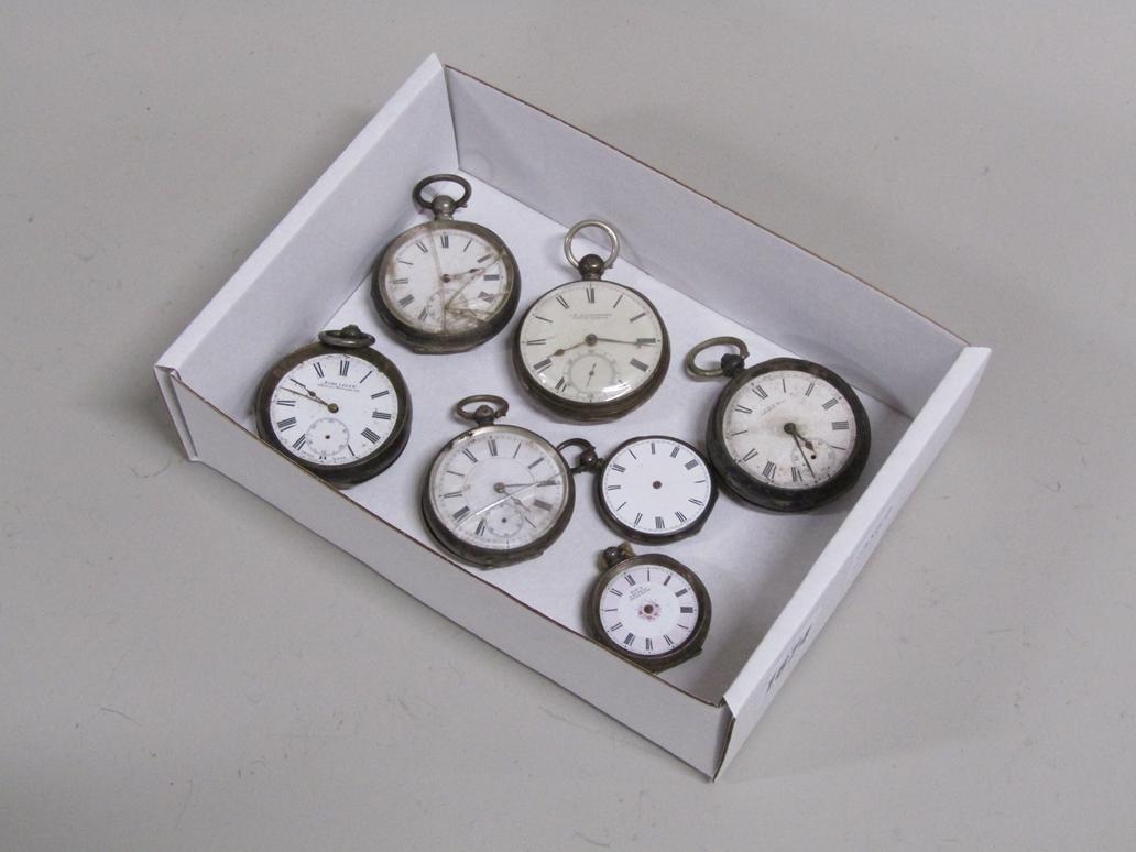 BOX OF SEVEN SILVER CASED POCKET WATCHES