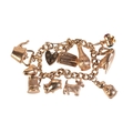 in 9ct gold, comprising a curb link chain bracelet, each link individually hallmarked, suspending ten charms, a Ronson Varaflame lighter, a vase, a gem-set lantern, a swan, a rabbit, a scotty dog, a pig, a tankard, an acorn and a kettle, all hallmarked for 9ct gold, the bracelet c7.5cm, along with four other loose 9ct gold charms, (gross weight - c.40.4g)