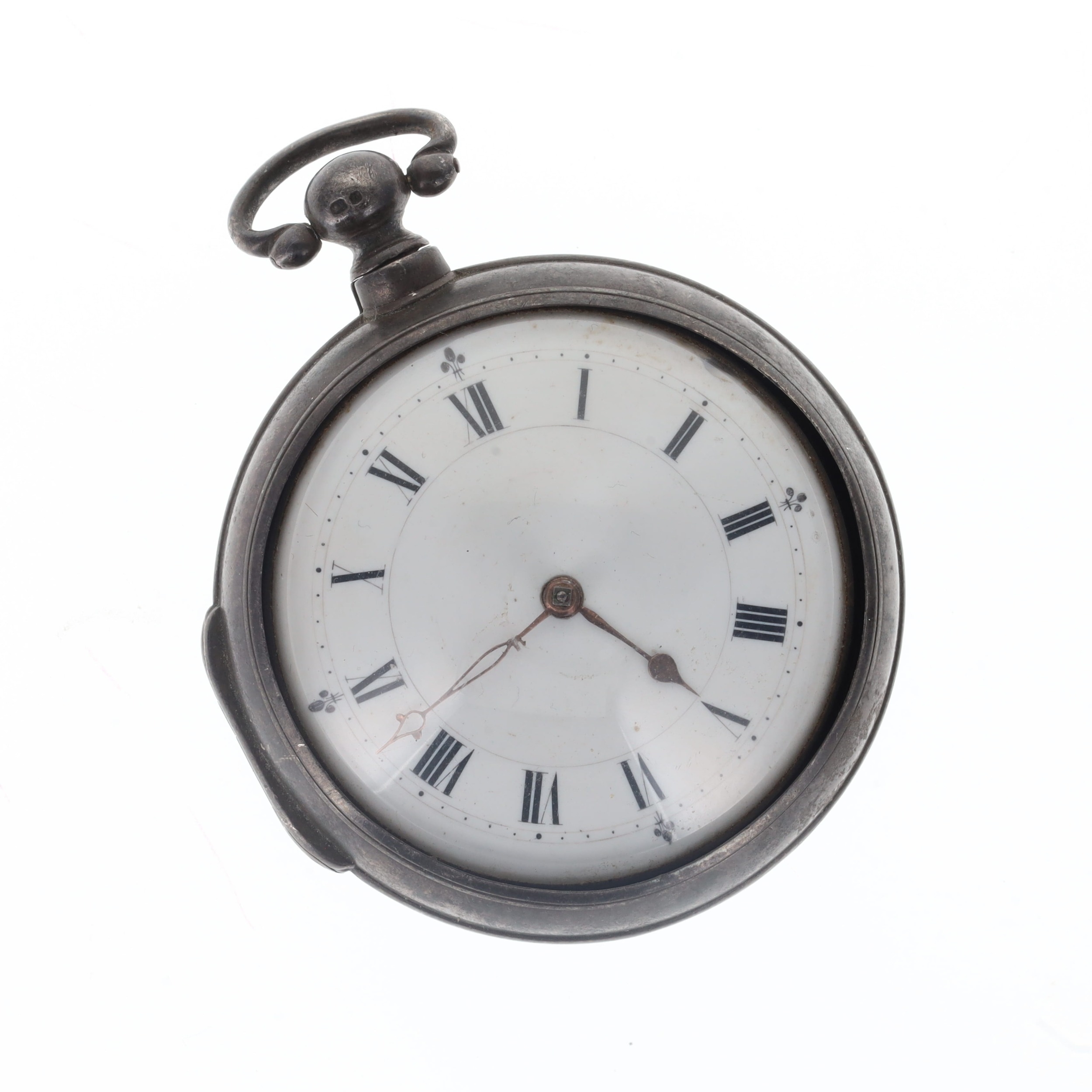 .925 Sterling Silver Pair Cased Verge Fusee Key Wind Pocket Watch. Key wind verge fusee movement. 925 sterling silver case and matching pair. Domed glass crystal. Plain white enamel dial with black Roman numerals, chipped on some places. Watch is not working, and sold as spares and repairs.