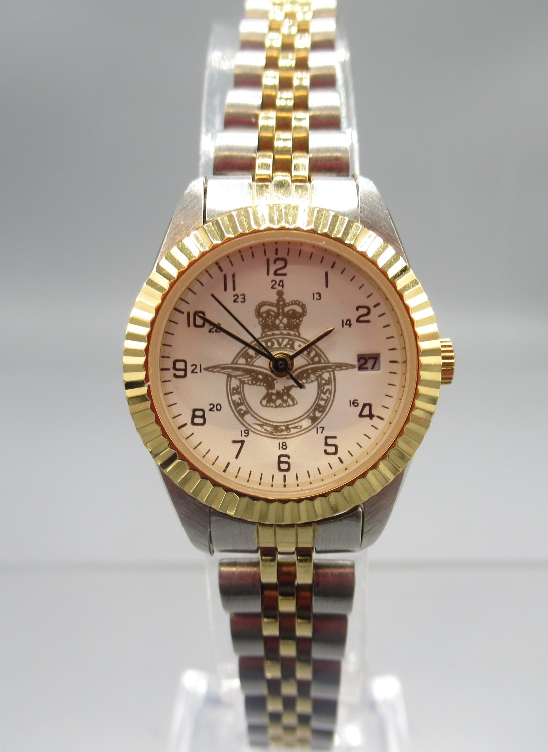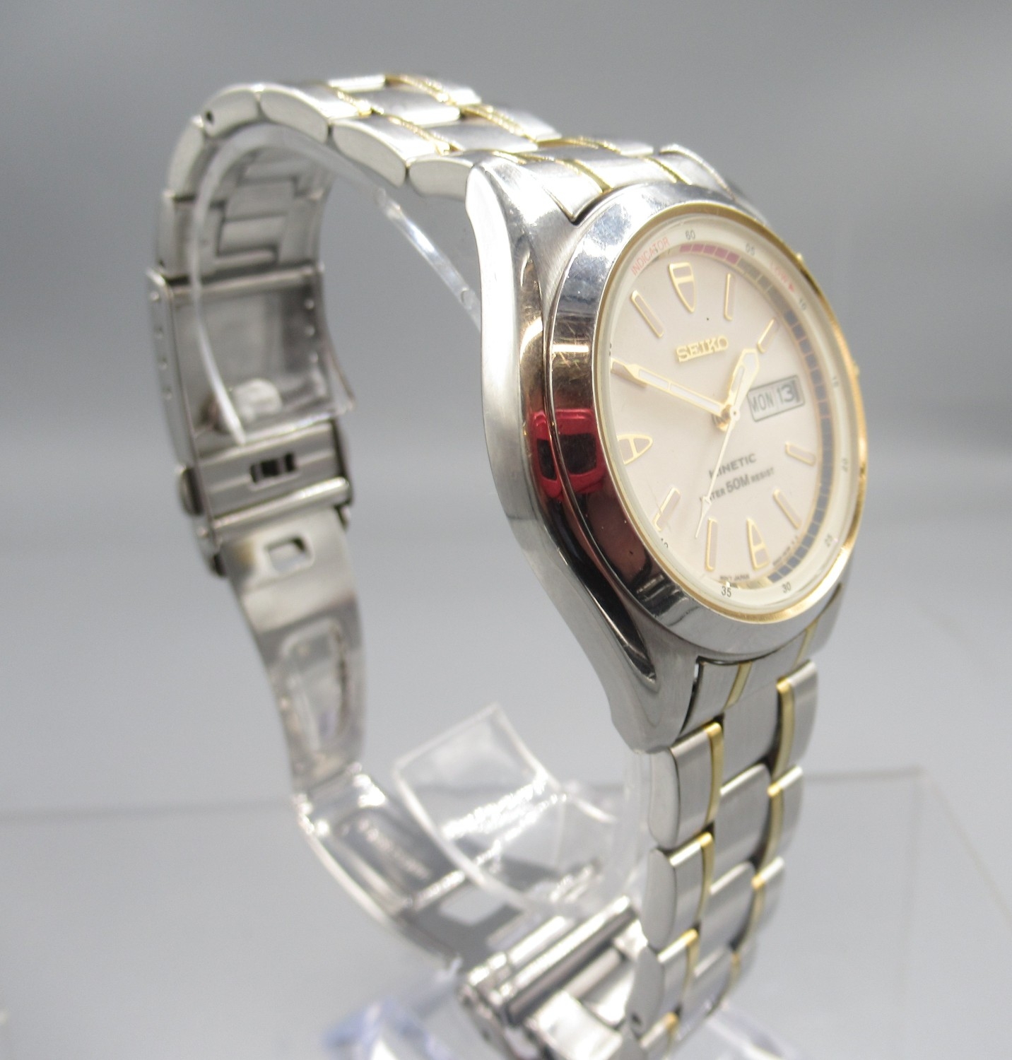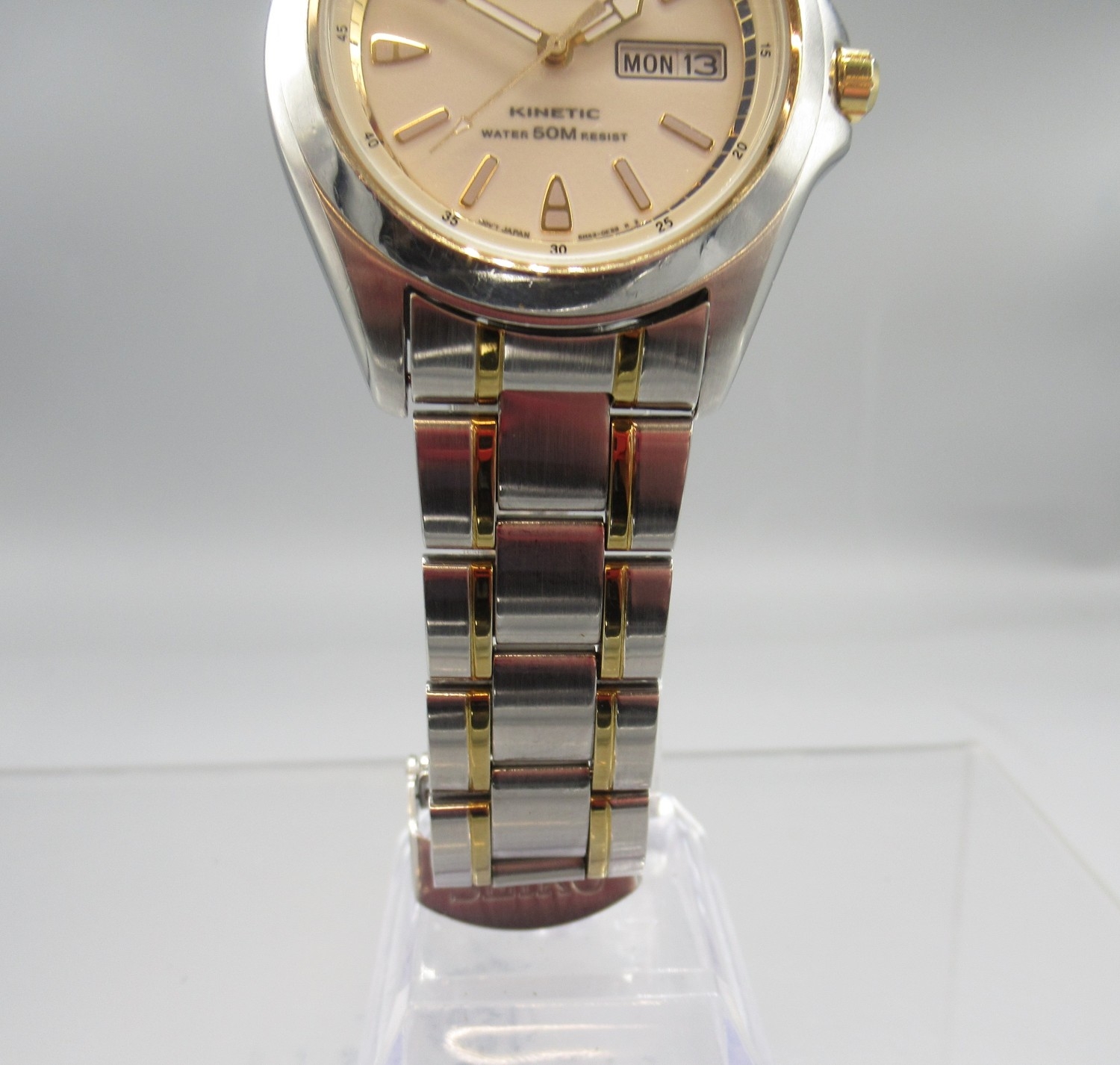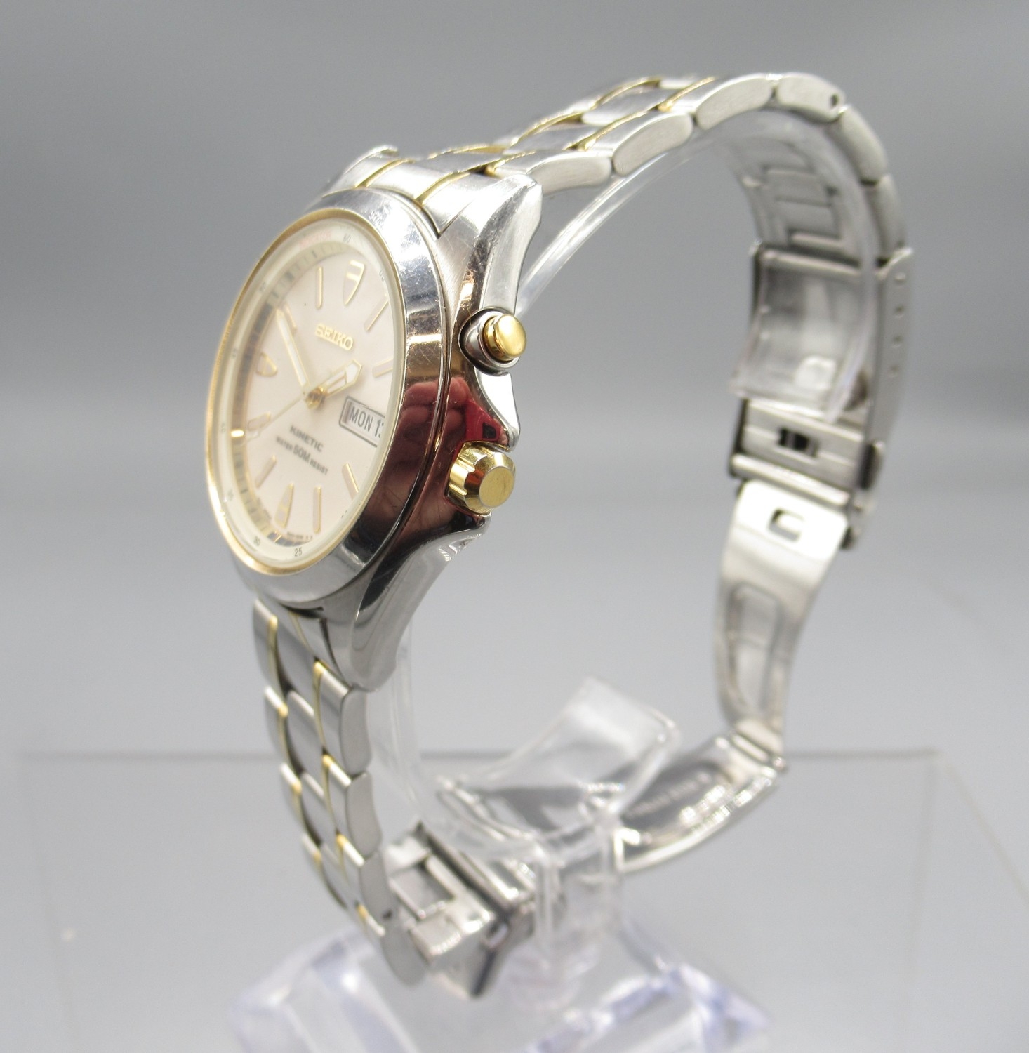 Seiko Kinetic 50m stainless steel and gold plated wristwatch with day/date on matching bracelet, signed cream dial with baton indices and centre seconds, signed screw on case back ref. 5M43-0C80, serial no. 010292, D45.2mm and ladies stainless steel and gold plated quartz wristwatch with date on matching bracelet, R.A.F. Arabic dial dial with centre seconds, snap on case back, limited edition no. 0930/5000, D24.7mm and leather wallet
