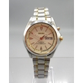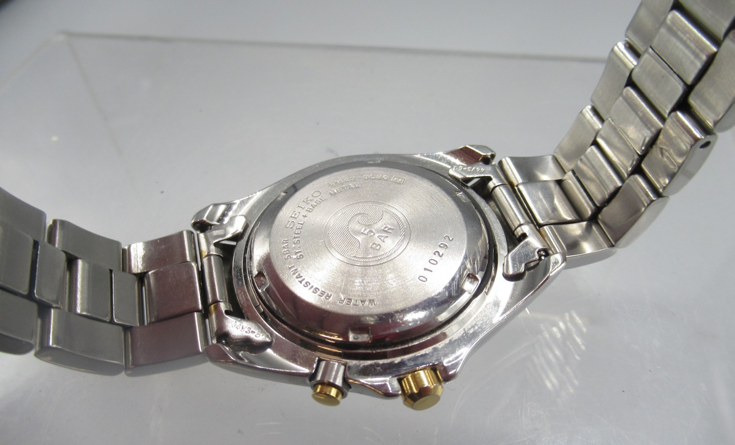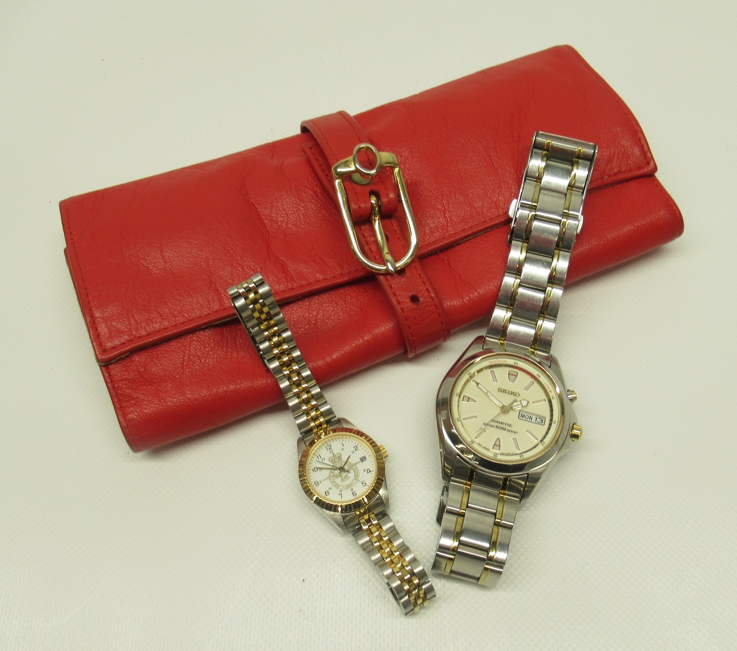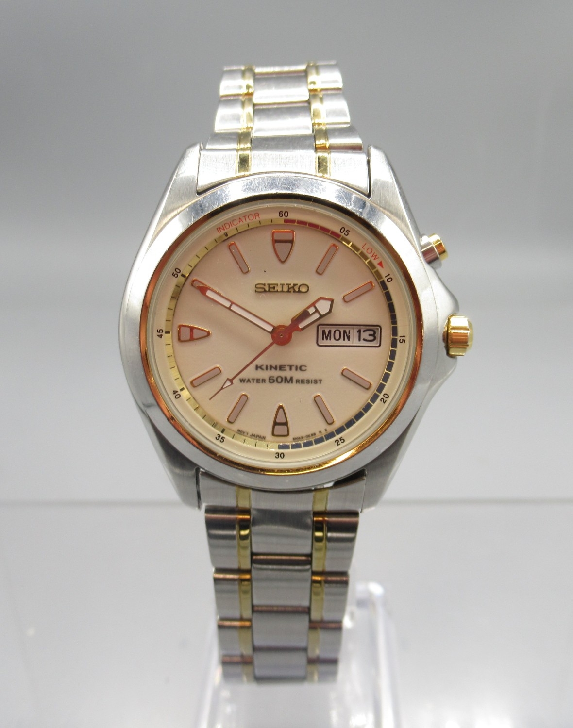 Seiko Kinetic 50m stainless steel and gold plated wristwatch with day/date on matching bracelet, signed cream dial with baton indices and centre seconds, signed screw on case back ref. 5M43-0C80, serial no. 010292, D45.2mm and ladies stainless steel and gold plated quartz wristwatch with date on matching bracelet, R.A.F. Arabic dial dial with centre seconds, snap on case back, limited edition no. 0930/5000, D24.7mm and leather wallet