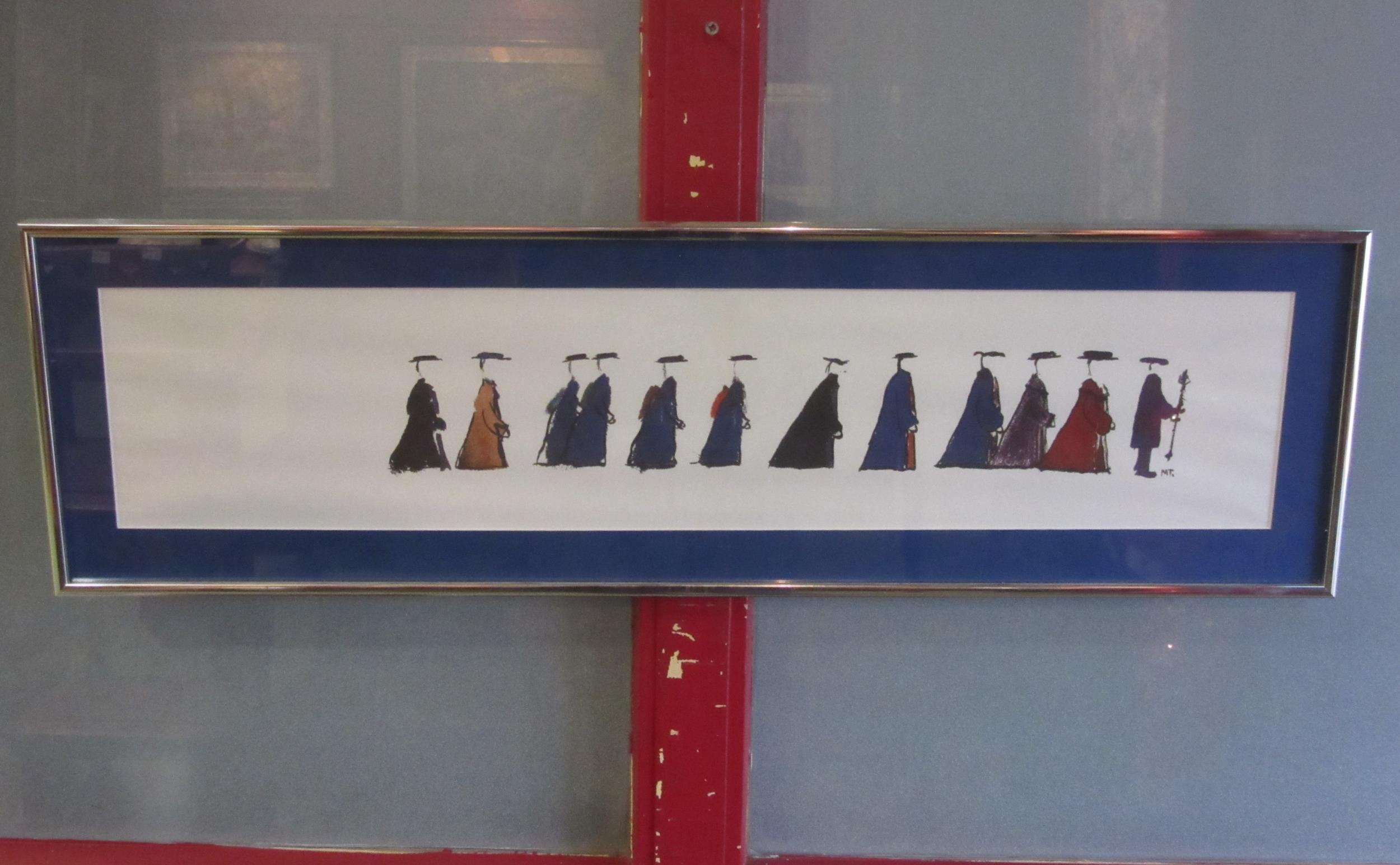 A print depicting a row of figures, framed and glazed, 15cm x 70cm image size