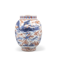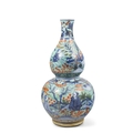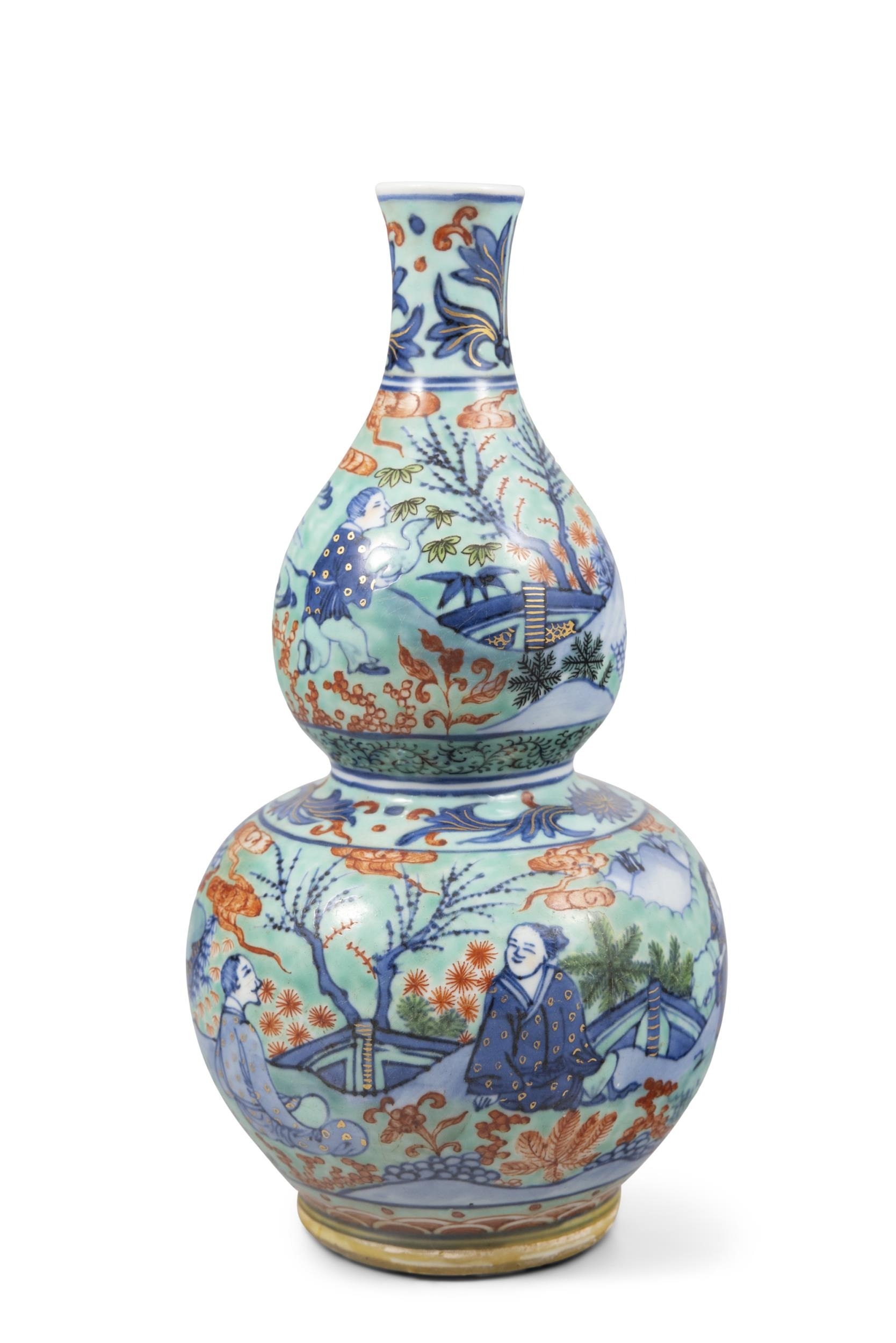 A BLUE AND WHITE SCHOLAR IN THE GARDEN GOURD VASE, REPAINTED IN HOLLAND ??-?? ????????????? China, 17-18th century H: 23.2cm