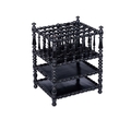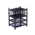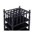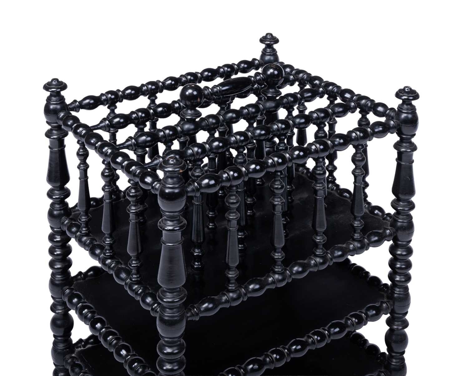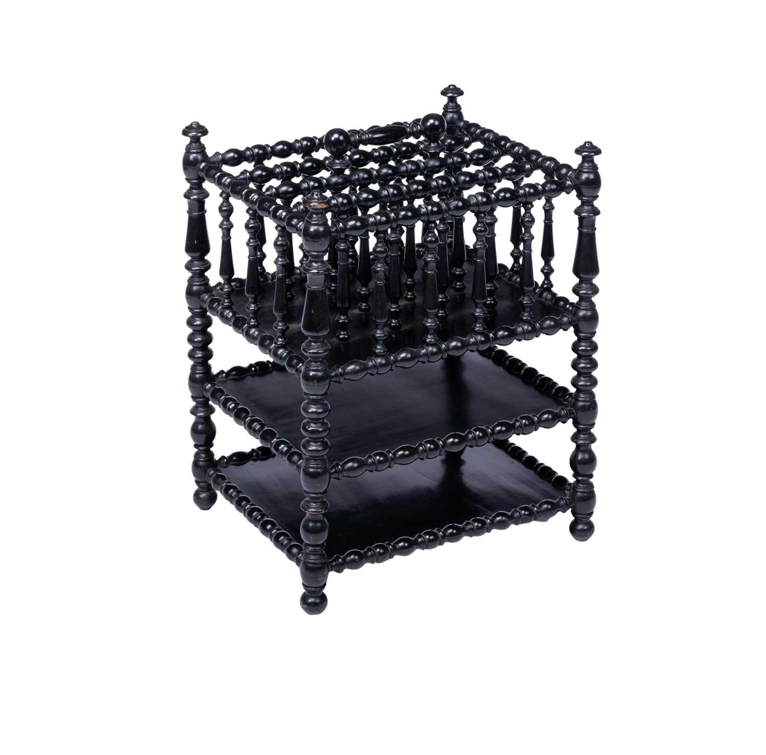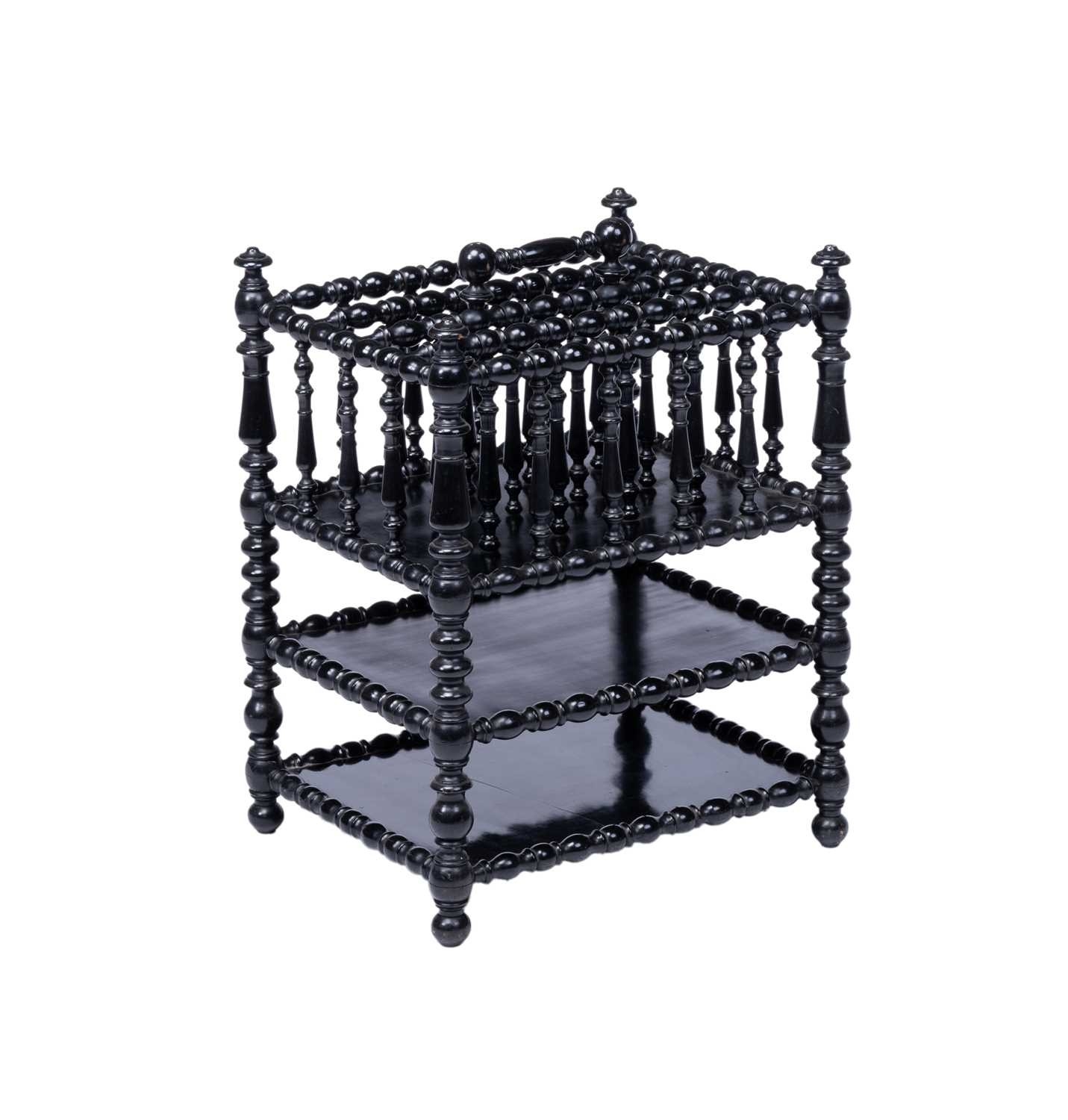 A late 19th-century French ebonised bobbin-turned magazine rack, the sectioned top with a carry handle, over two undertiers, 58 cm high x 44 cm x 37 cm.
