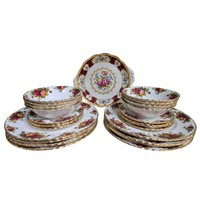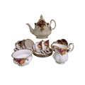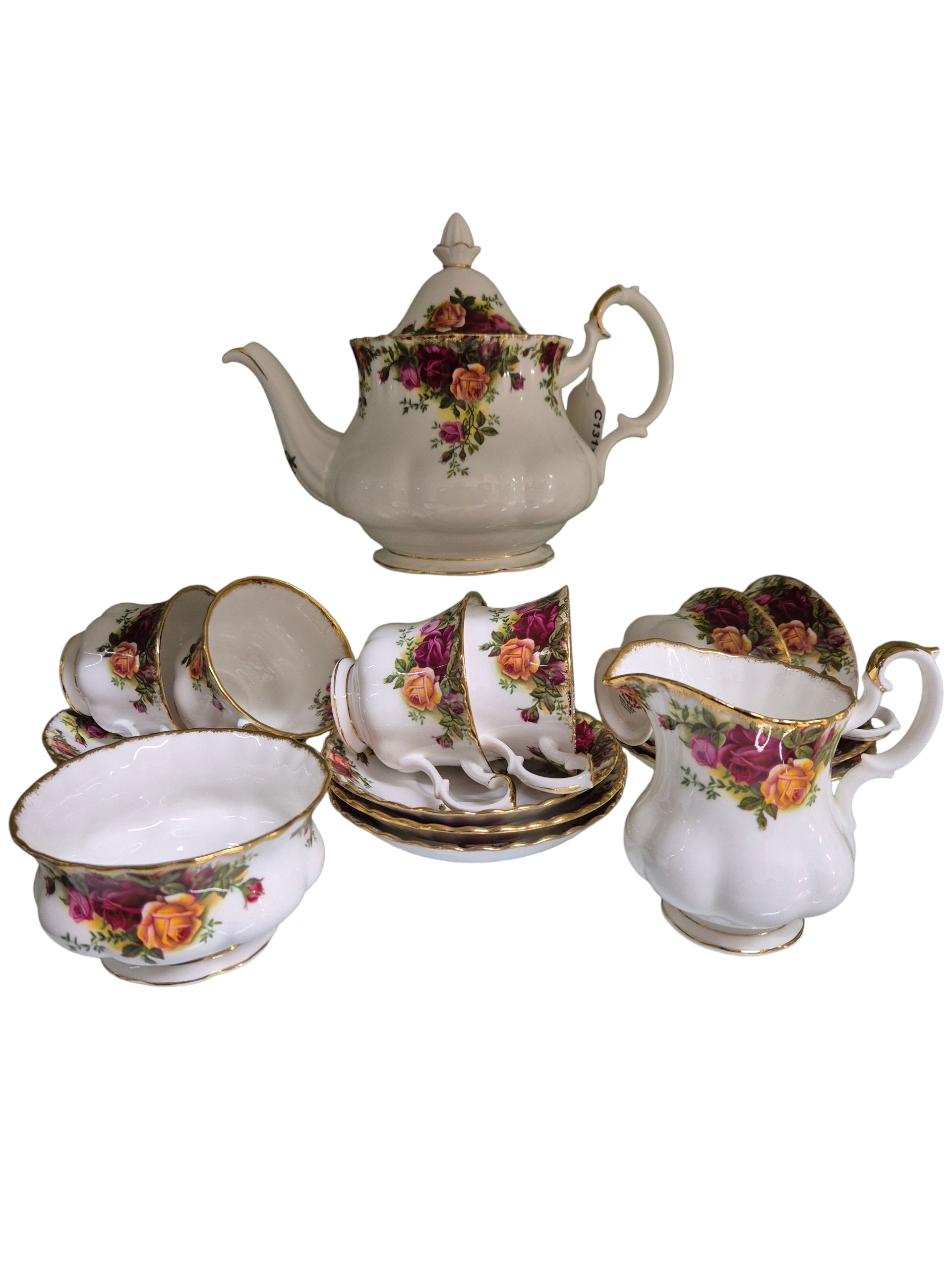 Royal Albert Old Country Roses part tea service of approximately sixteen pieces, richly decorated with red pink and yellow roses on a white ground with gilded edges, including teapot milk jug sugar bowl cups and saucers.
