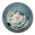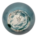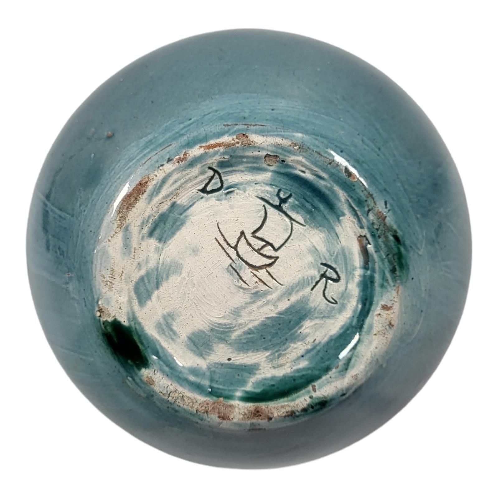 Hand thrown pottery bowl applied with experimental running glazes, incised carved factory marks with stylised boat monogrammed 'D.R.'.