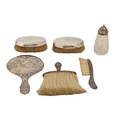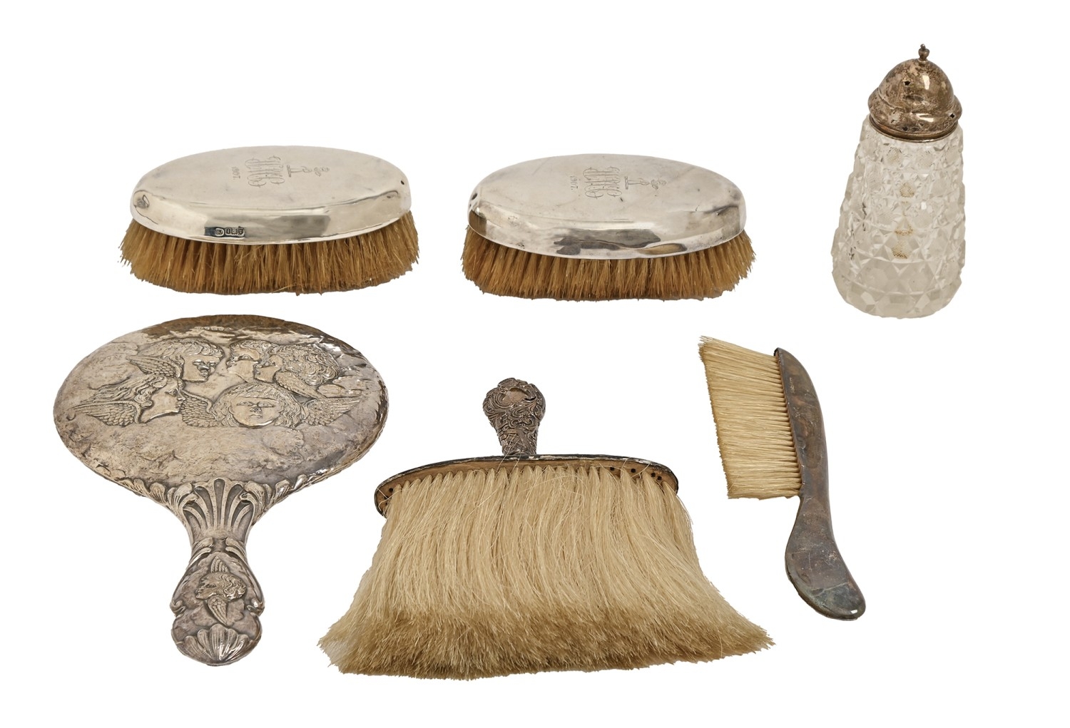 A pair of silver mounted hairbrushes, London 1904, a silver repoussé hand mirror, Birmingham 1905, two other silver mounted brushes and a silver mounted cut glass sugar caster