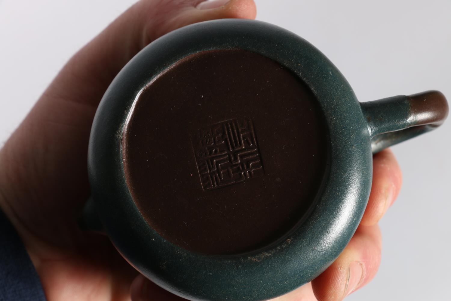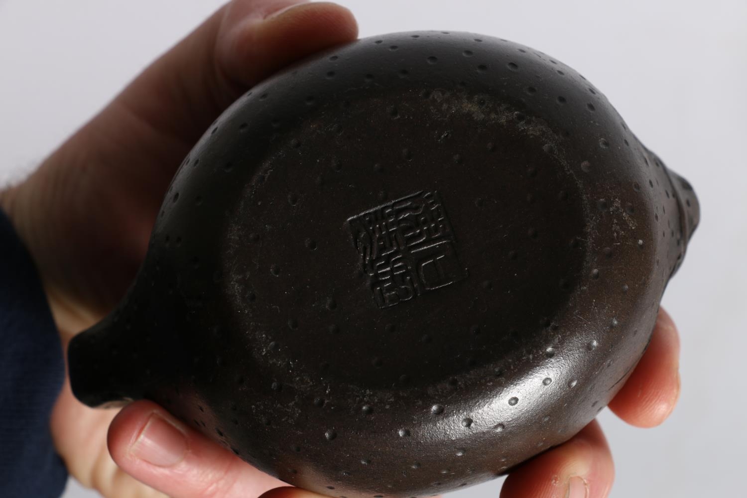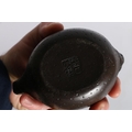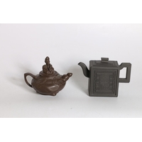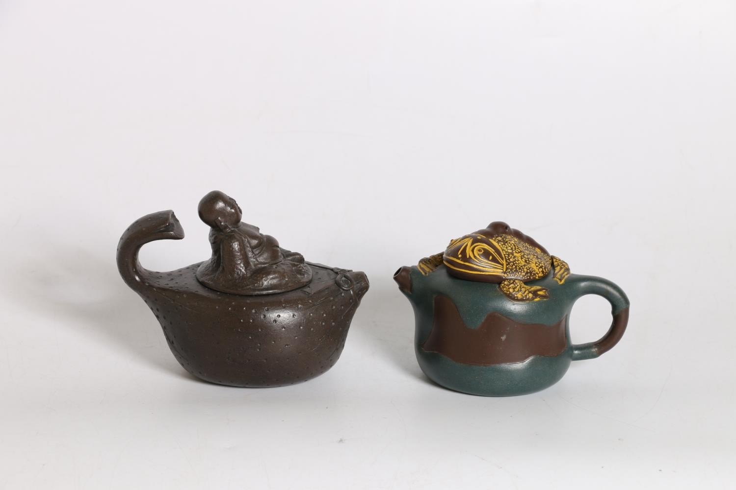 Two Yixing clay teapots, one with frog lid, 9cm tall and another with Buddha lid, 10cm tall. (2)