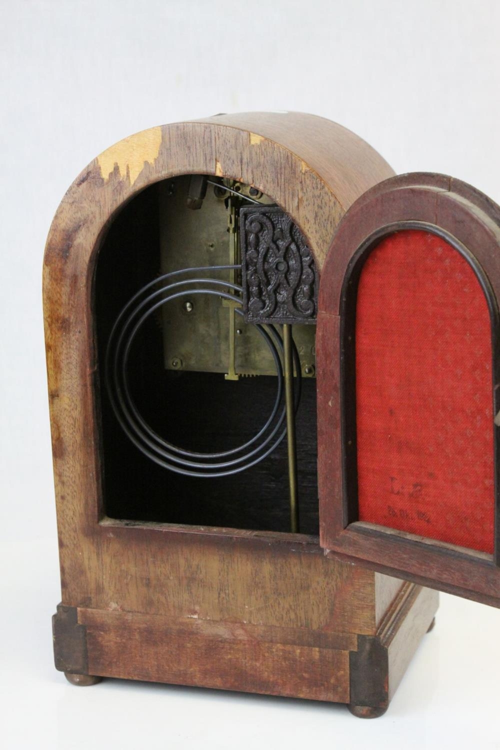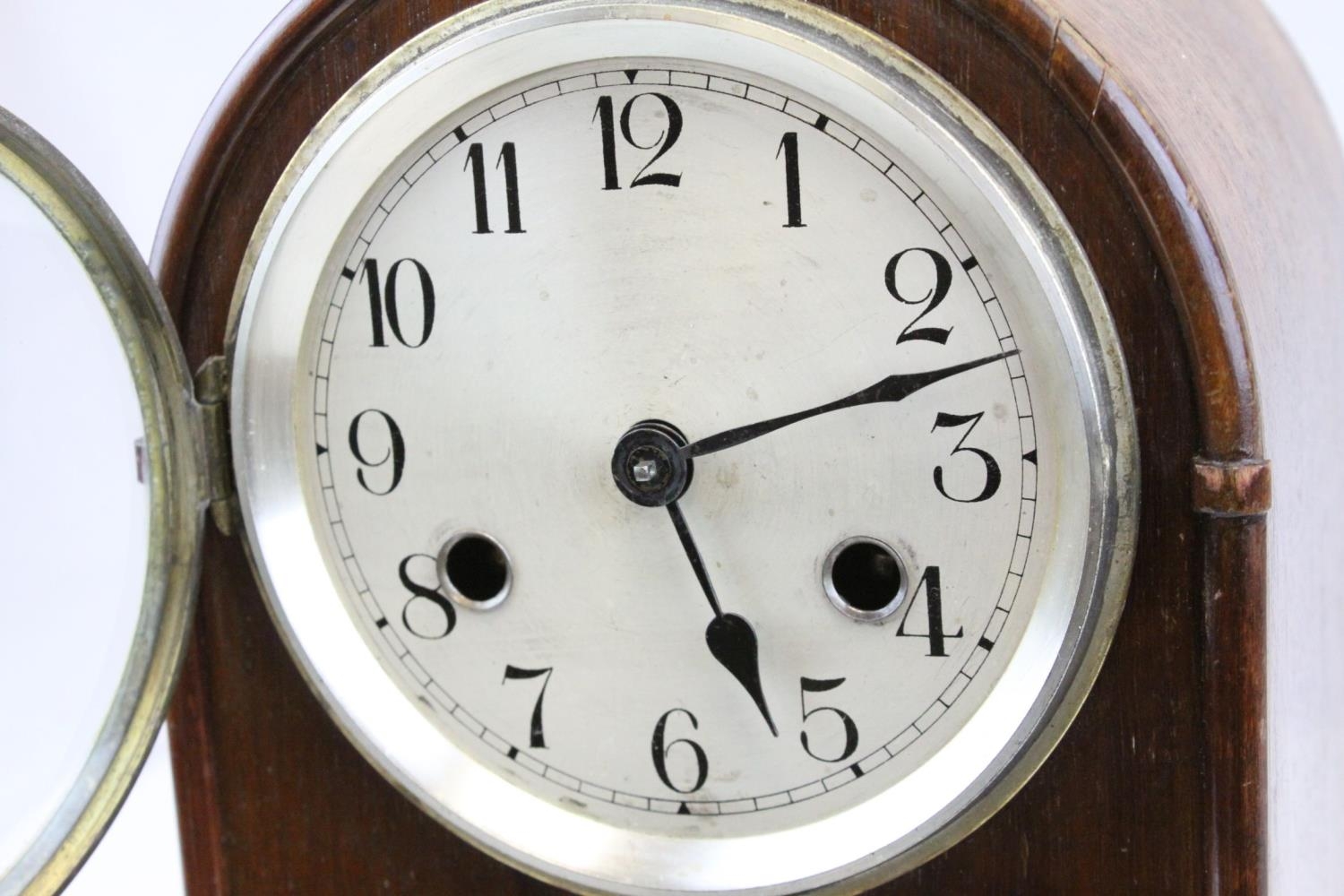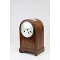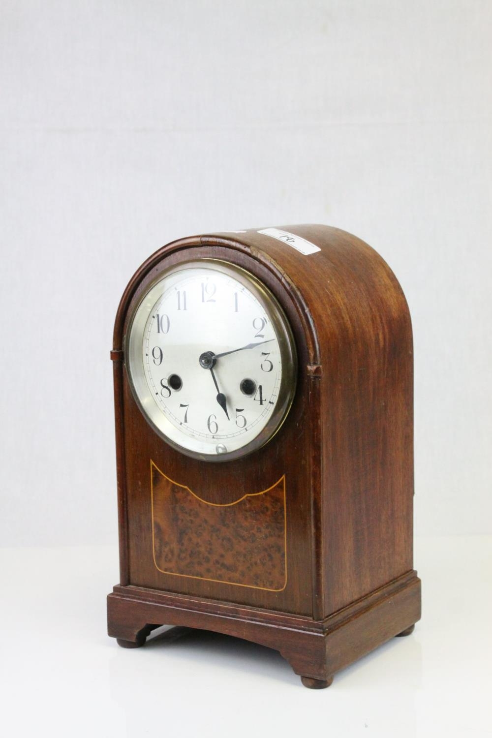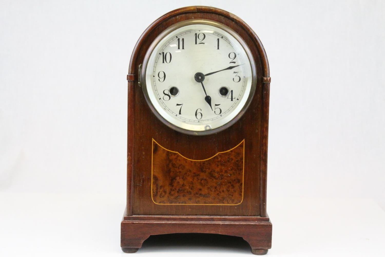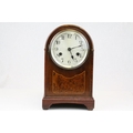 Edwardian Mahogany Inlaid Domed Cased Mantle Clock, 8 day movement with silvered face, 28cms high