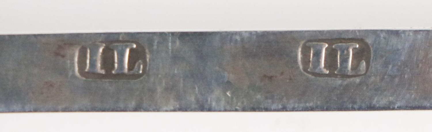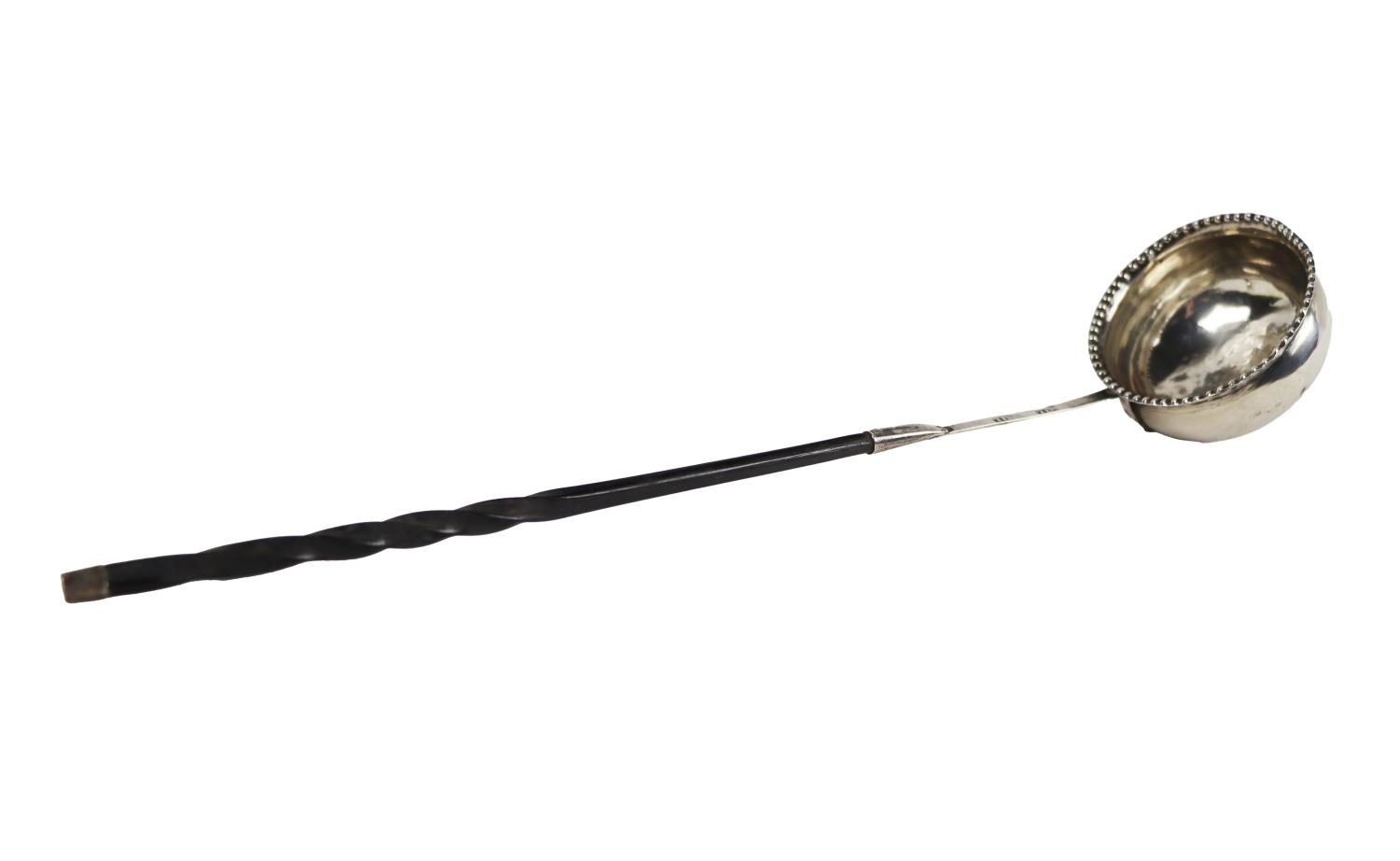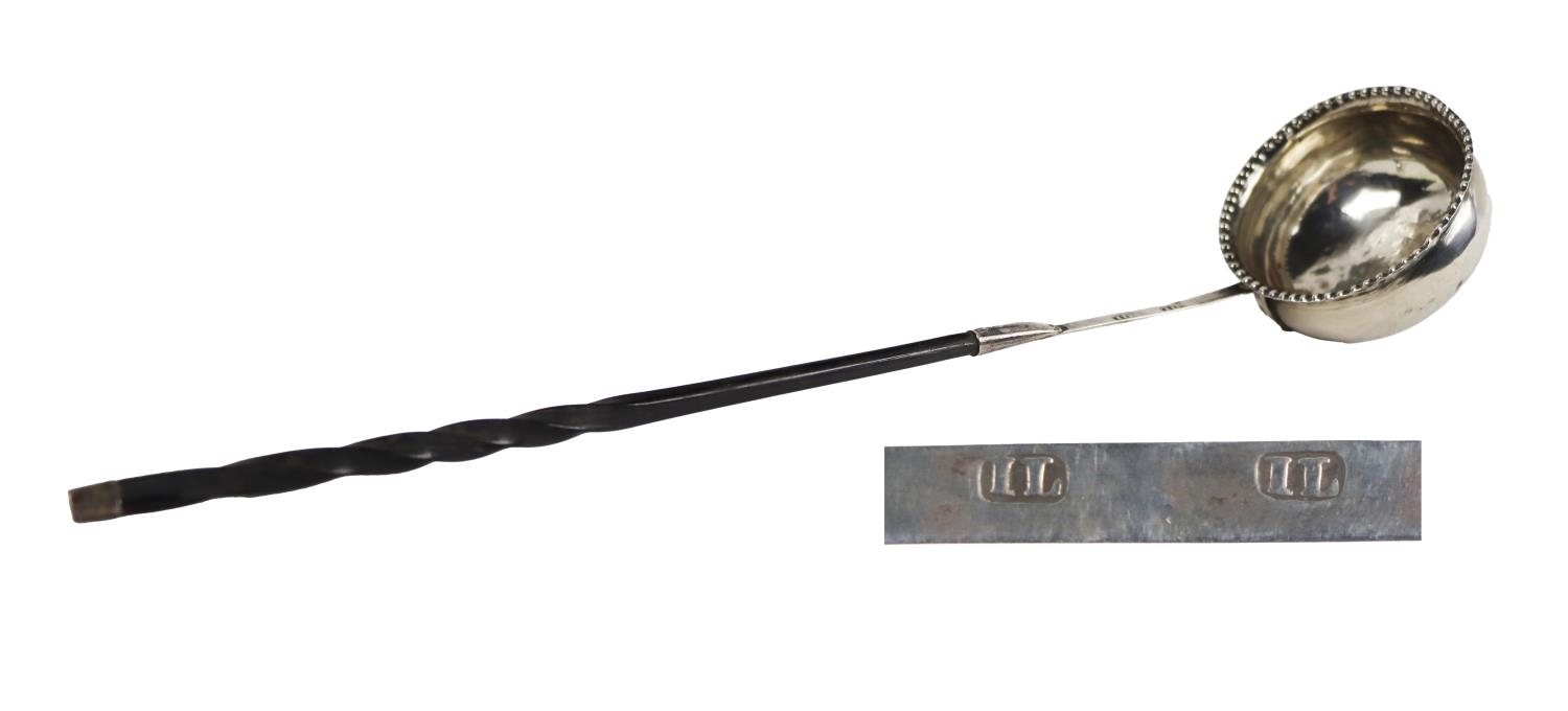 An English silver Georgian period Brandy Ladle, with beaded rim and twist wooden handle, hallmarked I.L. (probably John Lias, London c. 1790/1800), approx. 29cms (11 1/2") long. (1)
